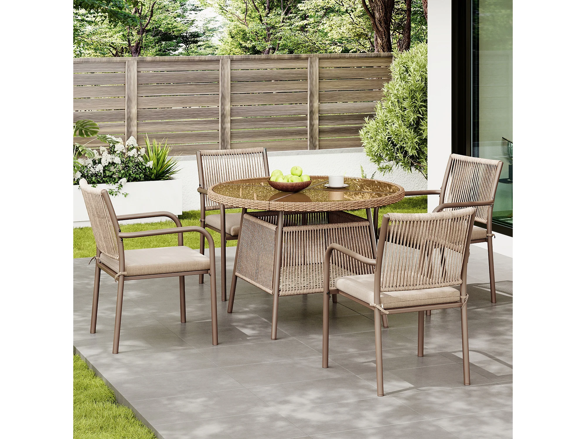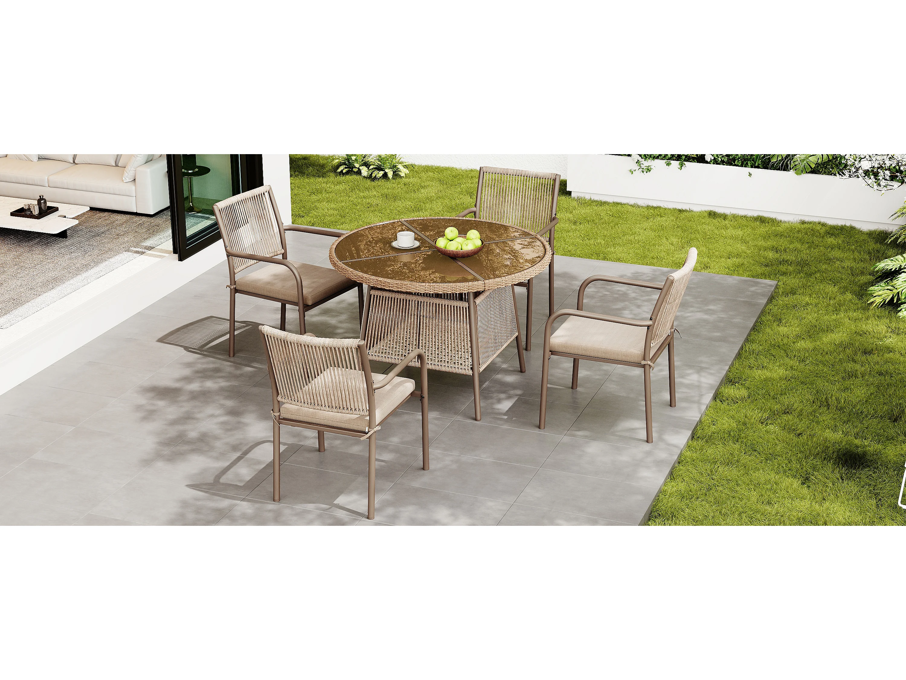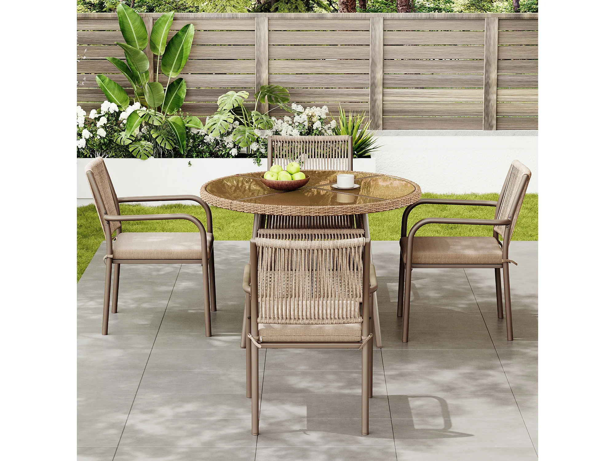Ensemble de mobilier de jardin moderne en rotin - avec 1 table en verre + 4 fauteuils - métal - marron