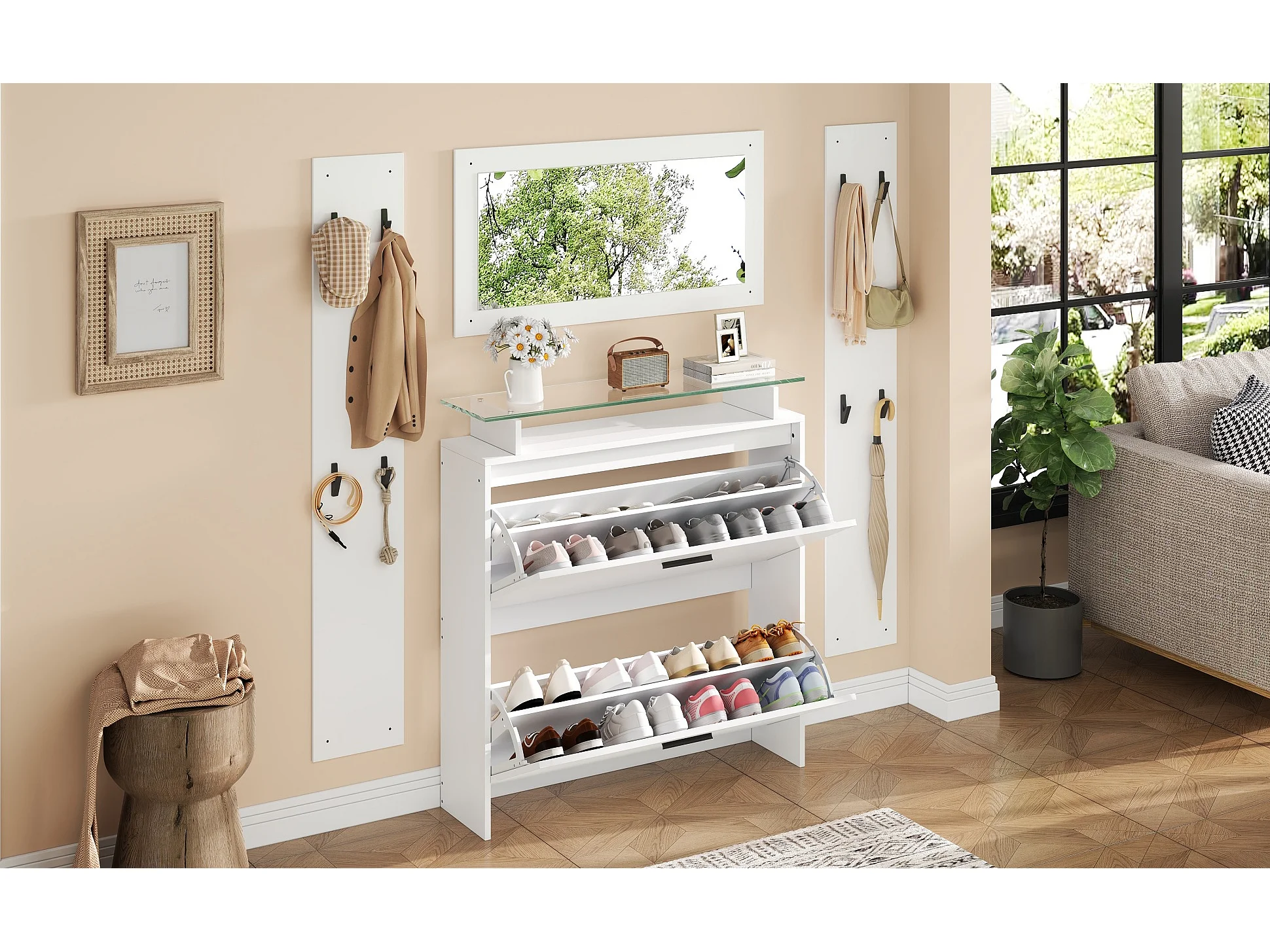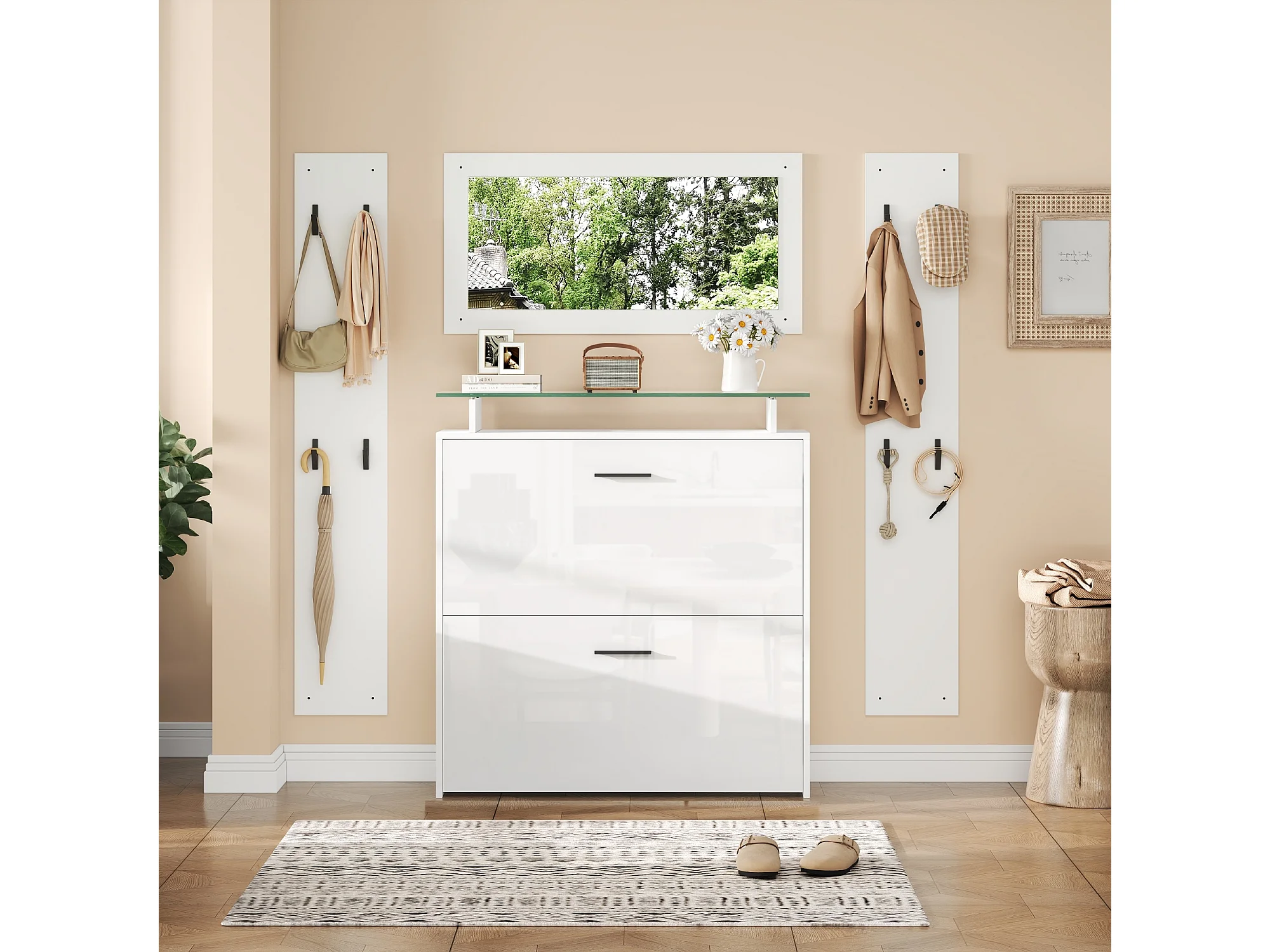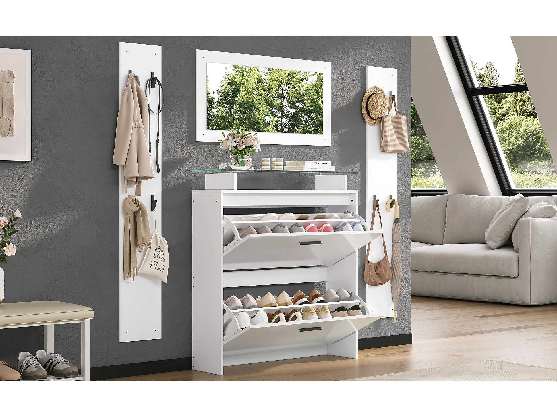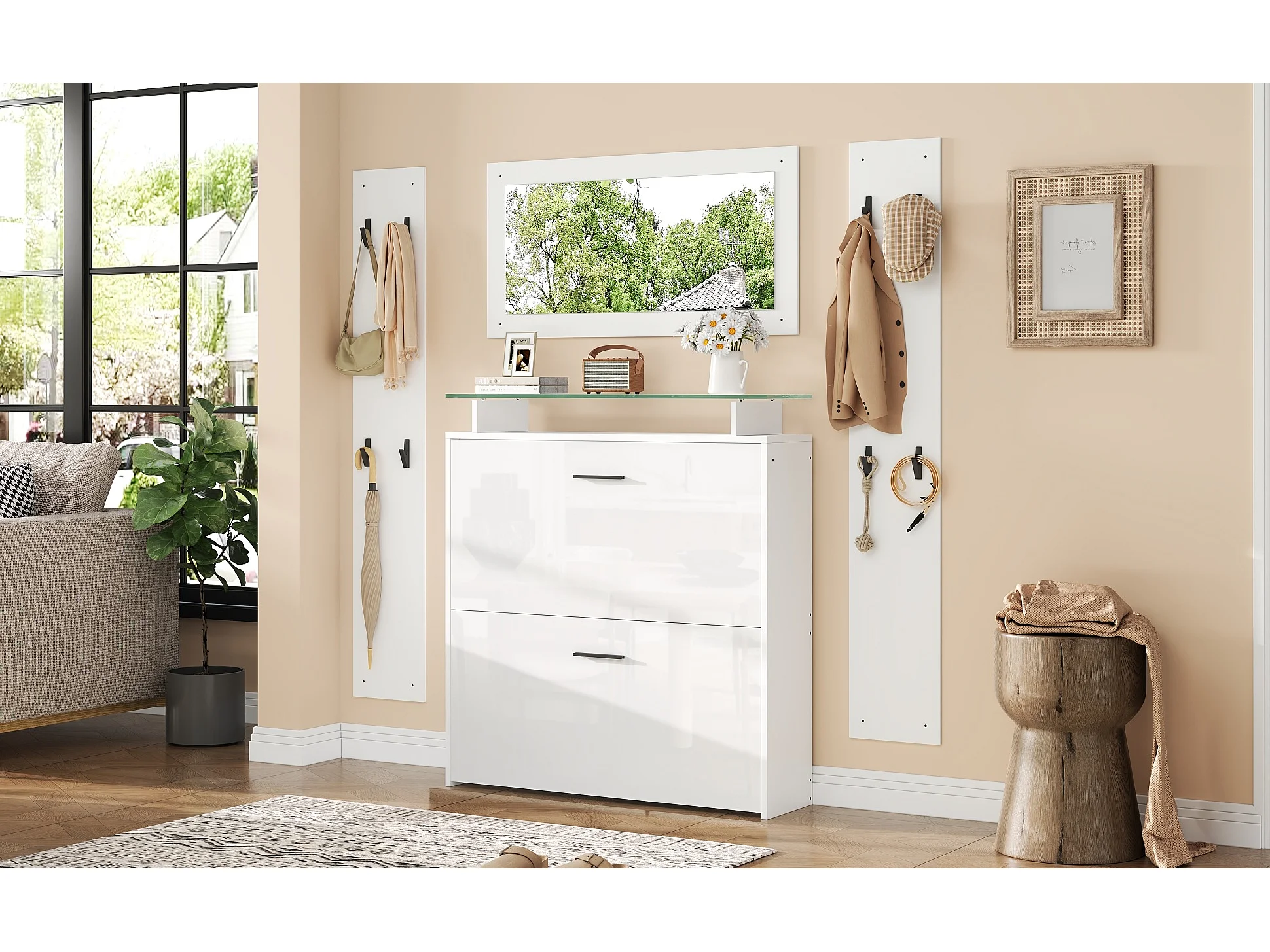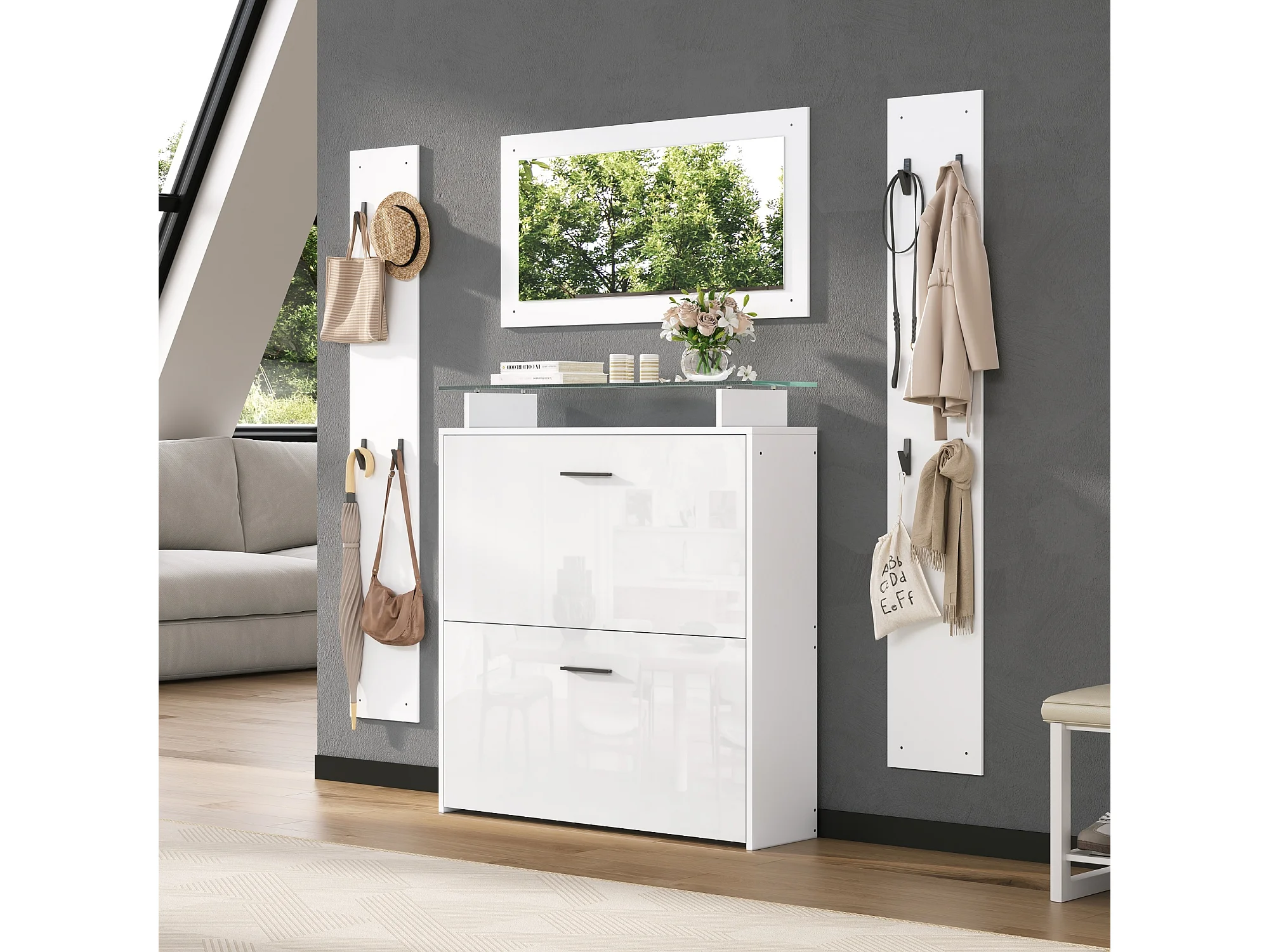 Ensemble de penderie 4 pièces avec miroir + 2 étagères à chapeaux + meuble à chaussures brillant - aggloméré - blanc