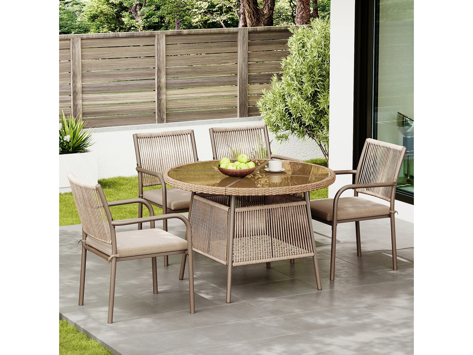 Ensemble jardin 5 pièces en rattan – Table ronde en verre trempé + 4 fauteuils avec accoudoirs, structure en fer, coussins inclus, terrasse et balcon