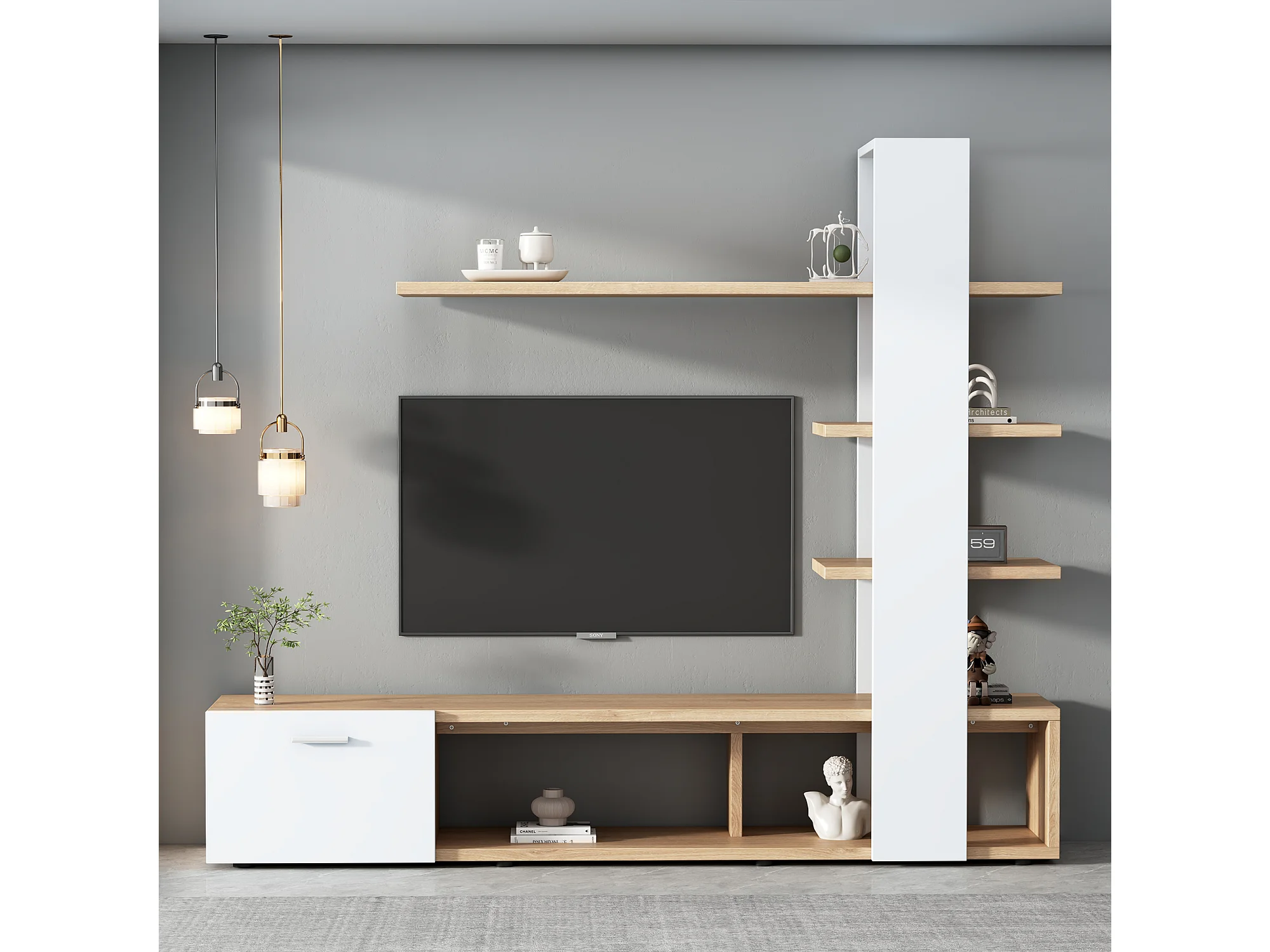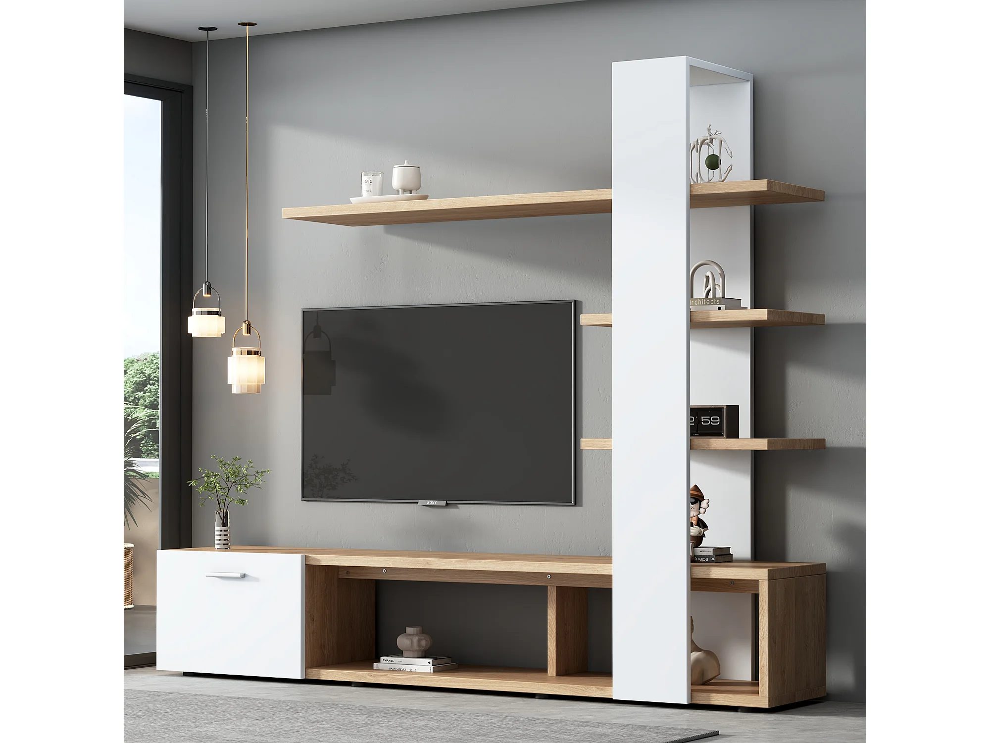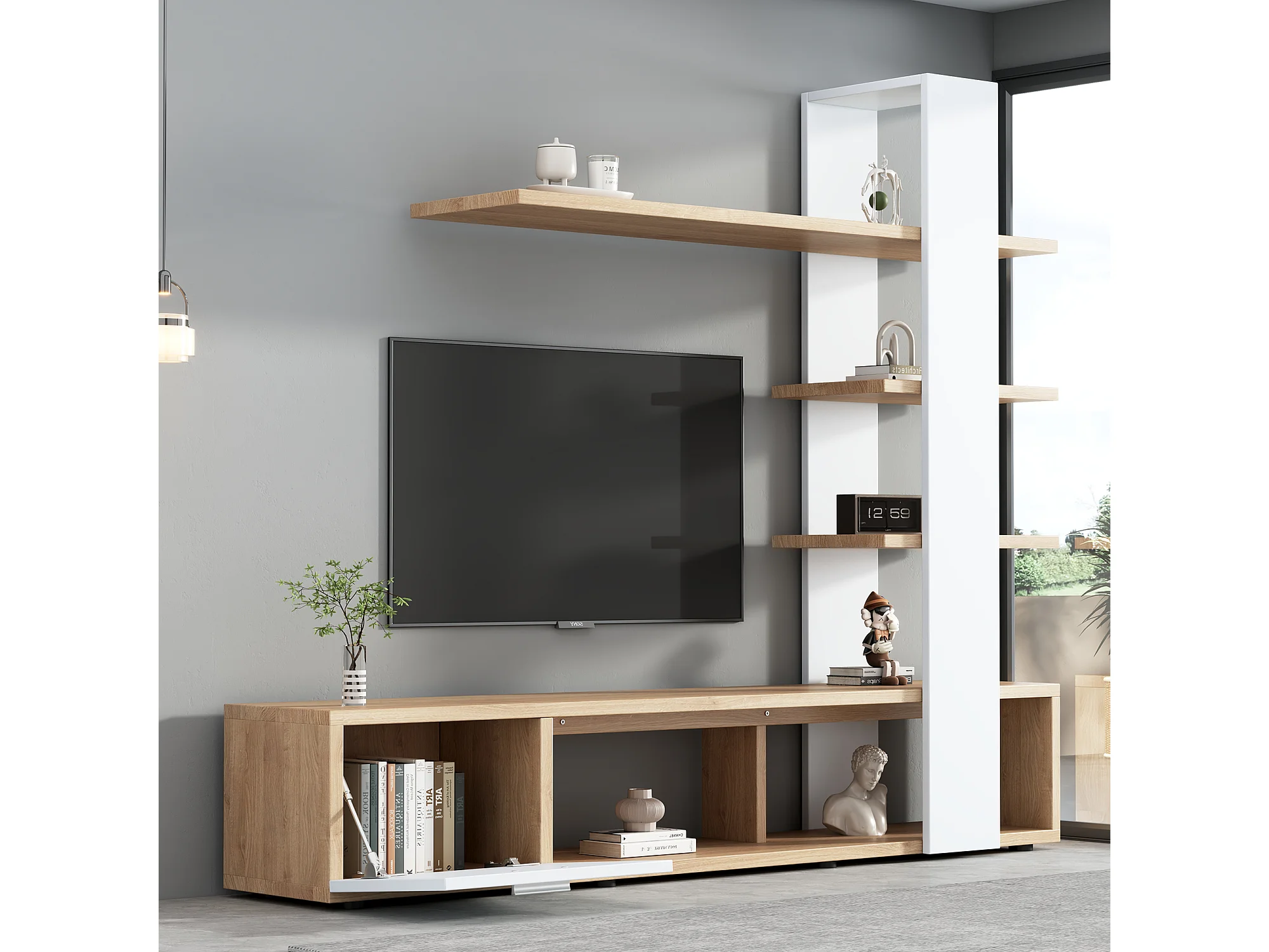 Meuble TV mural 180x33.5x151.5 cm, rangements ouverts et fermés, pour TV jusqu'à 60 pouces, panneaux de particules blanc et bois