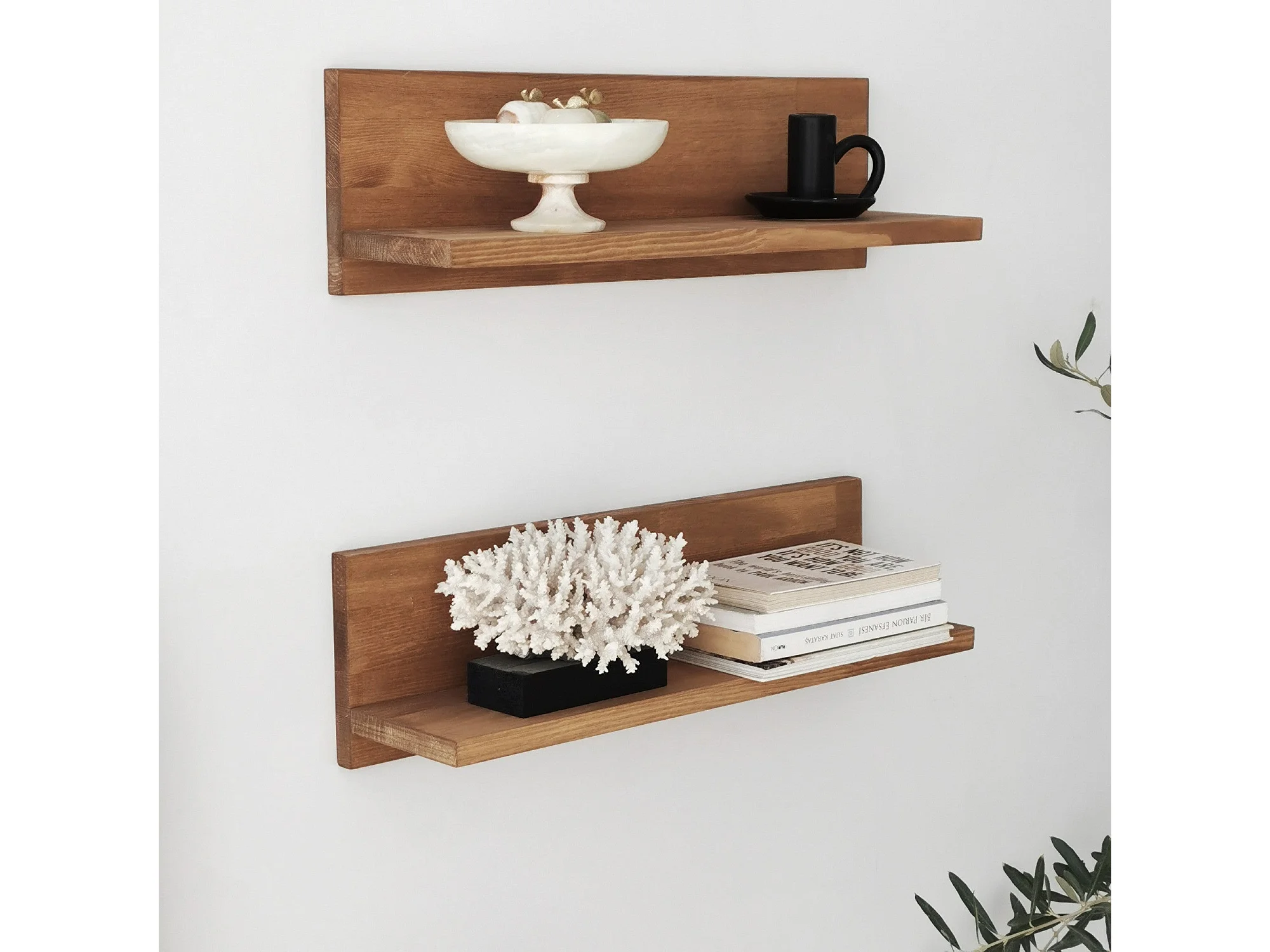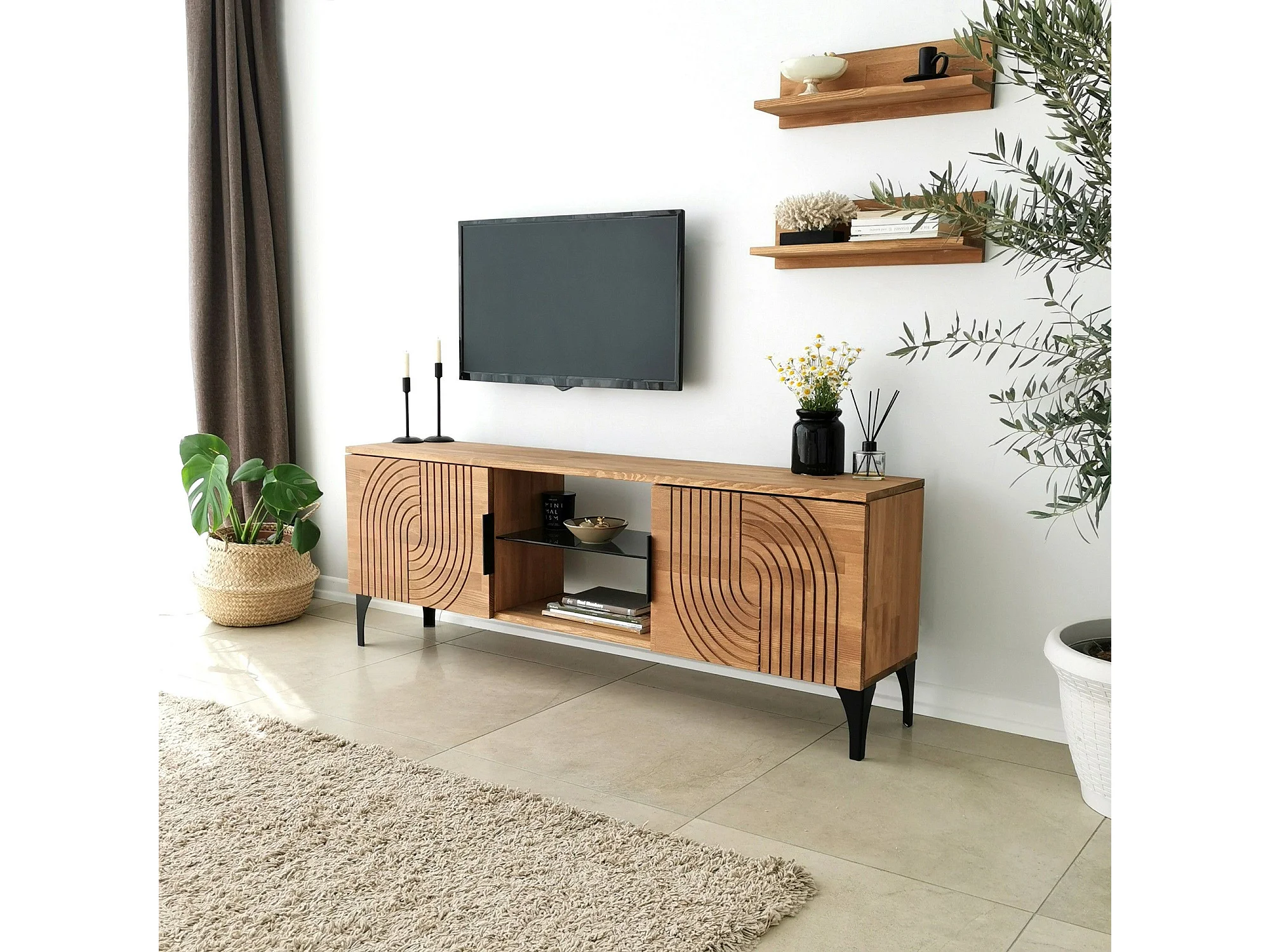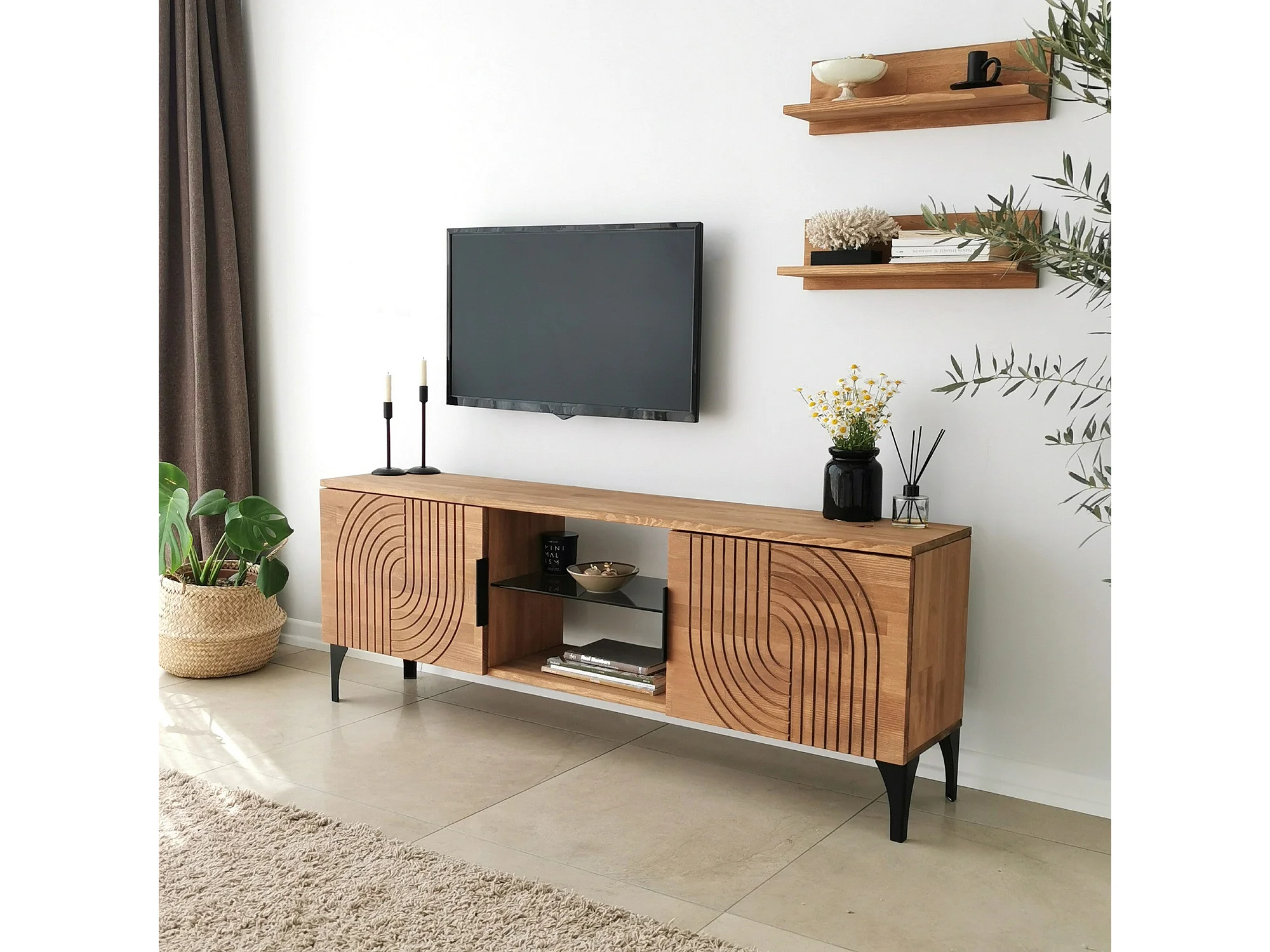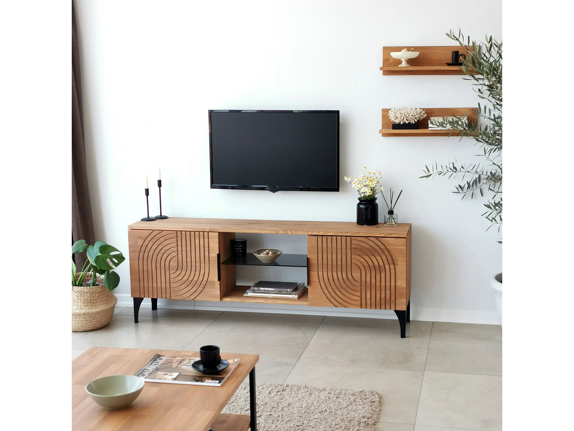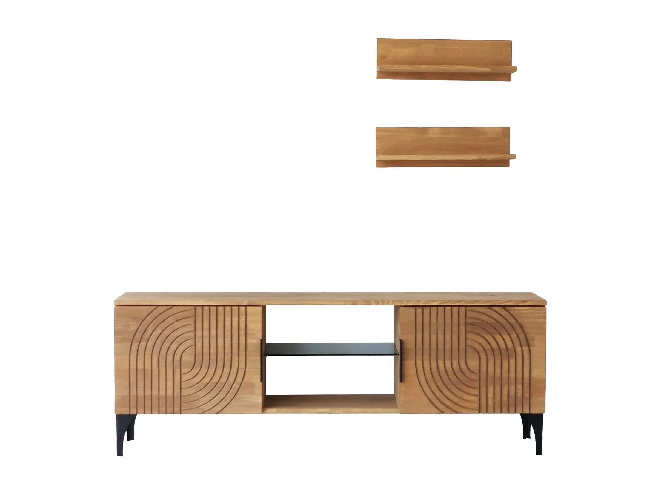 Ensemble meuble TV et 2 étagères murales Belizo Bois massif Chêne clair Motif demi arcs