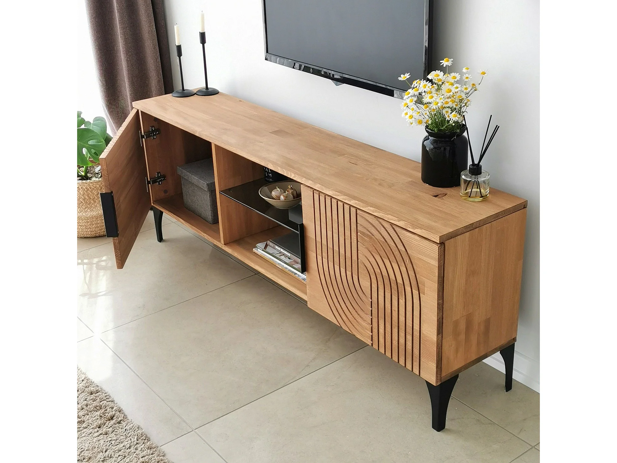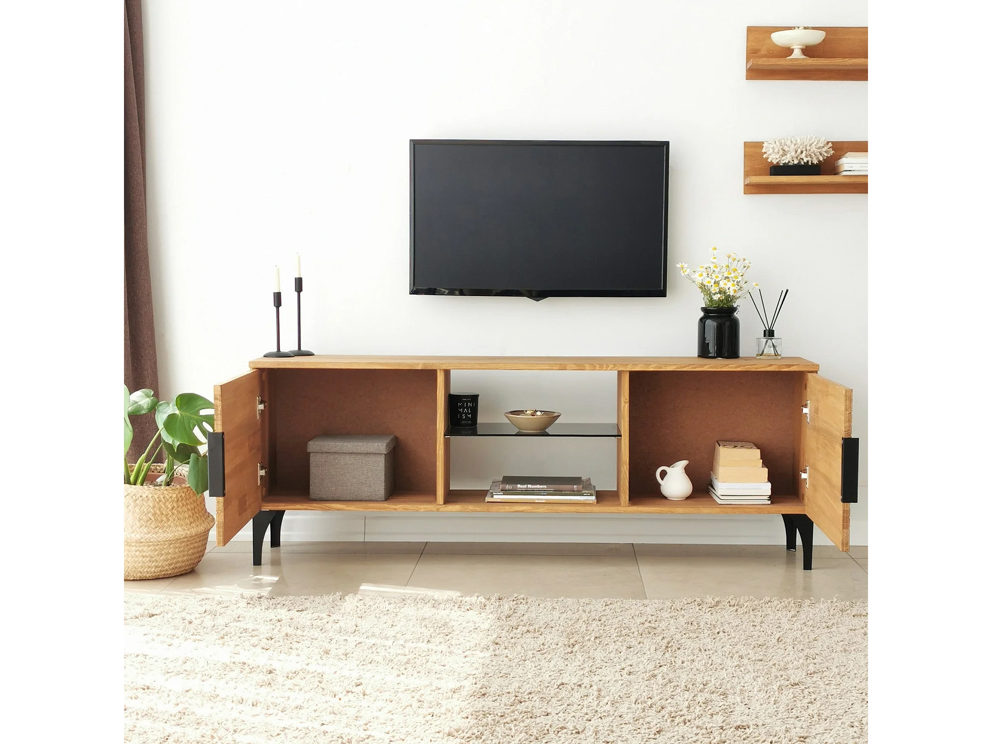 Petit meuble TV en bois massif naturel et plateau en verre trempé Darone 130cm