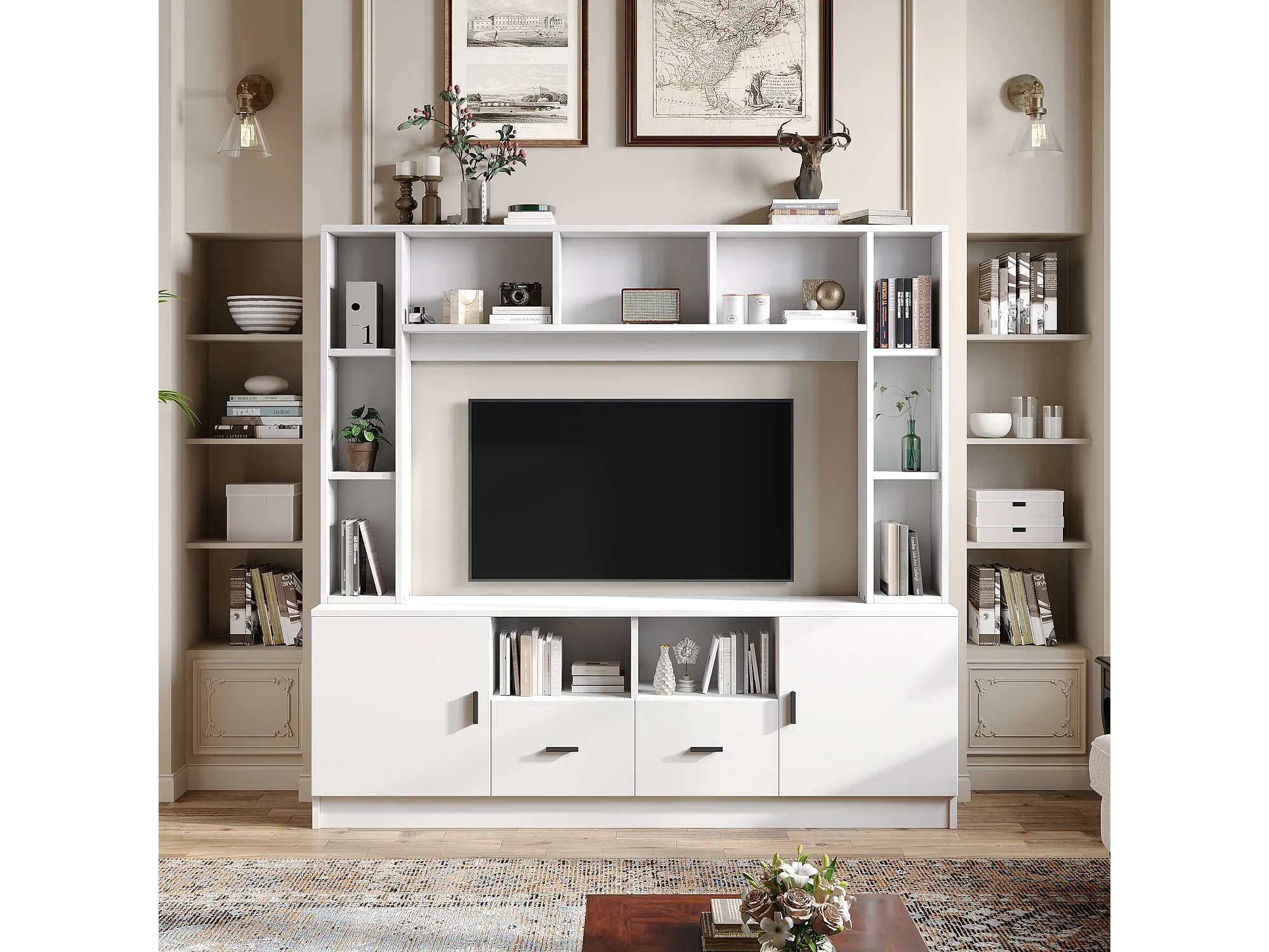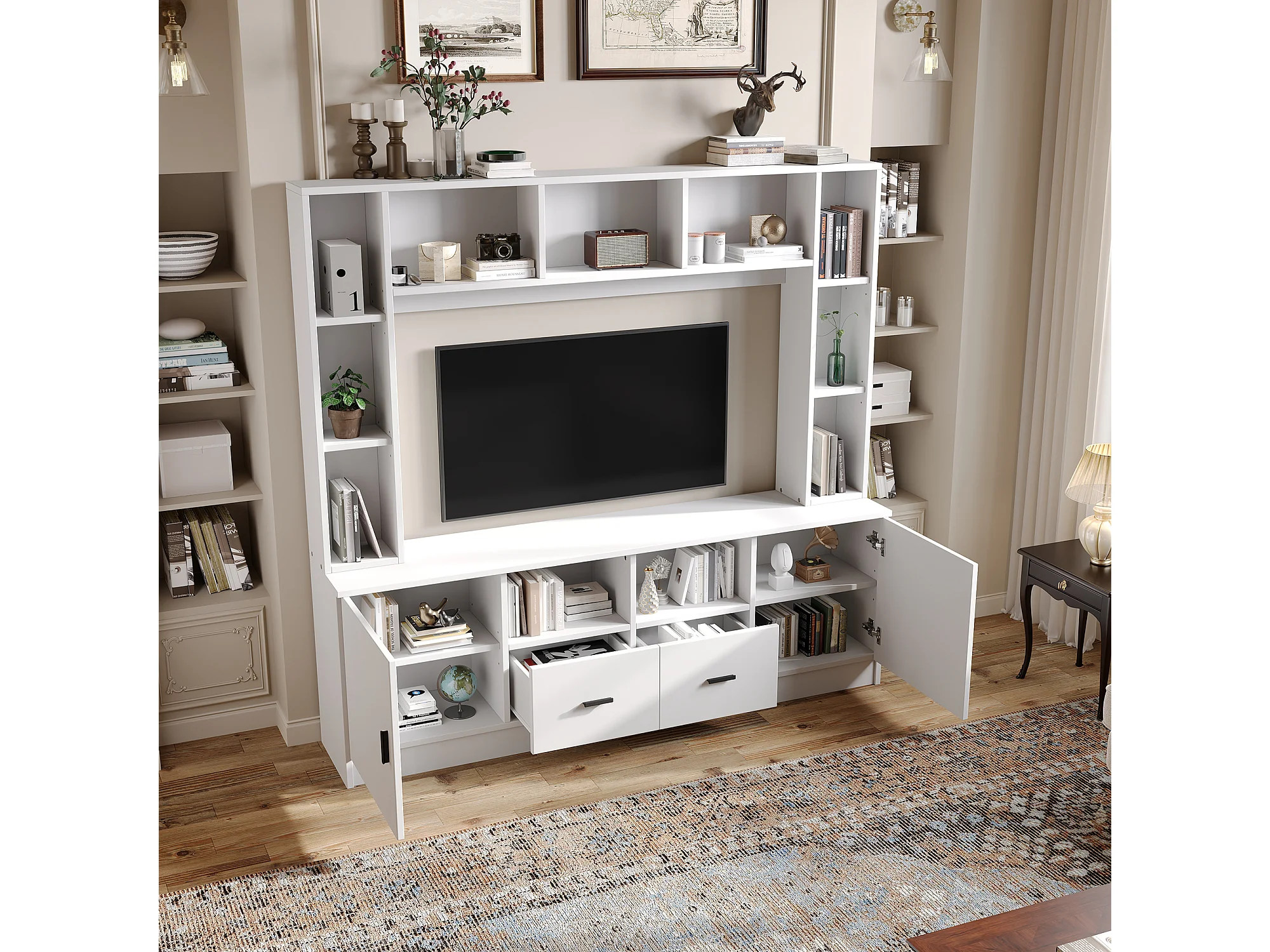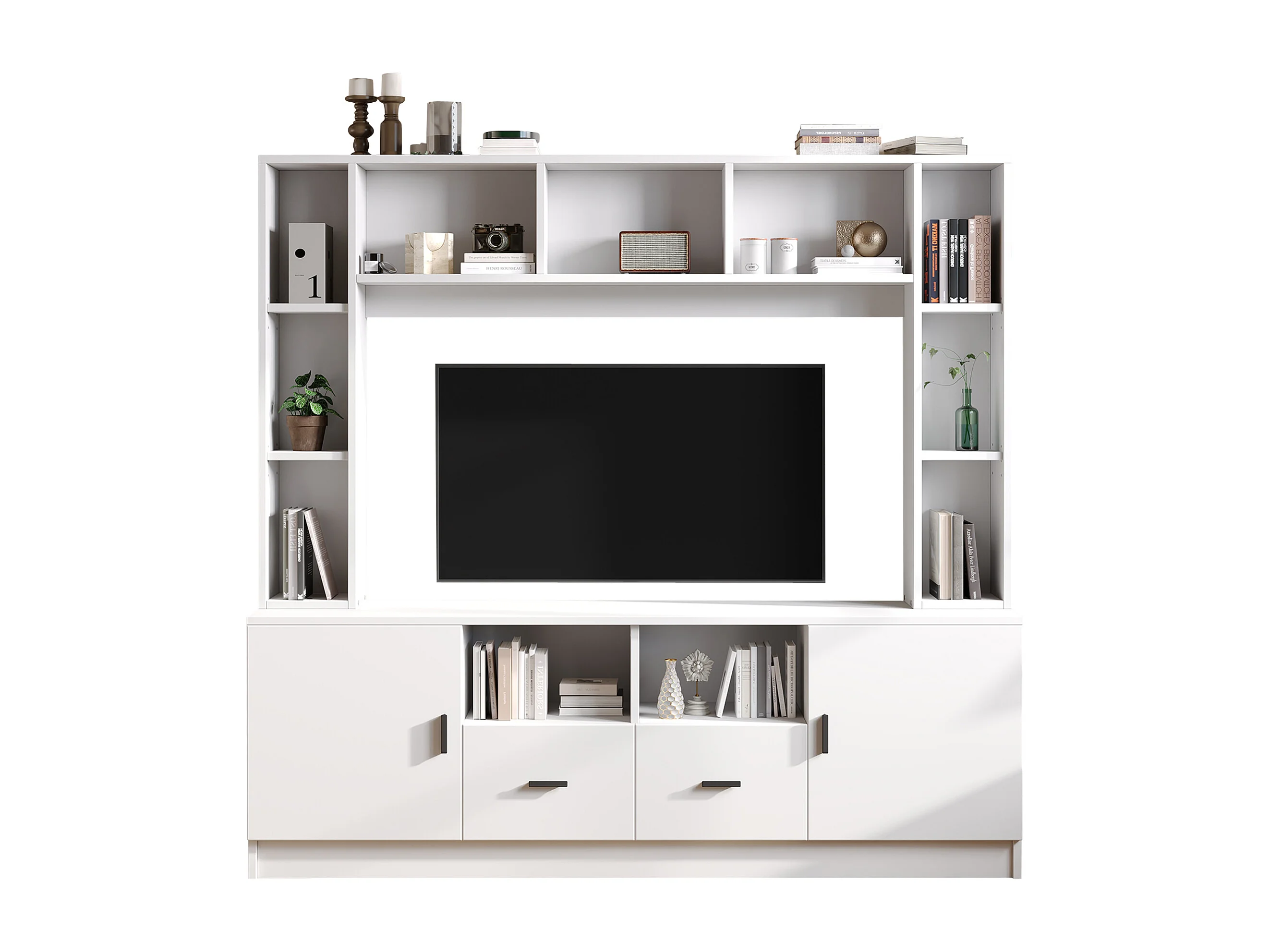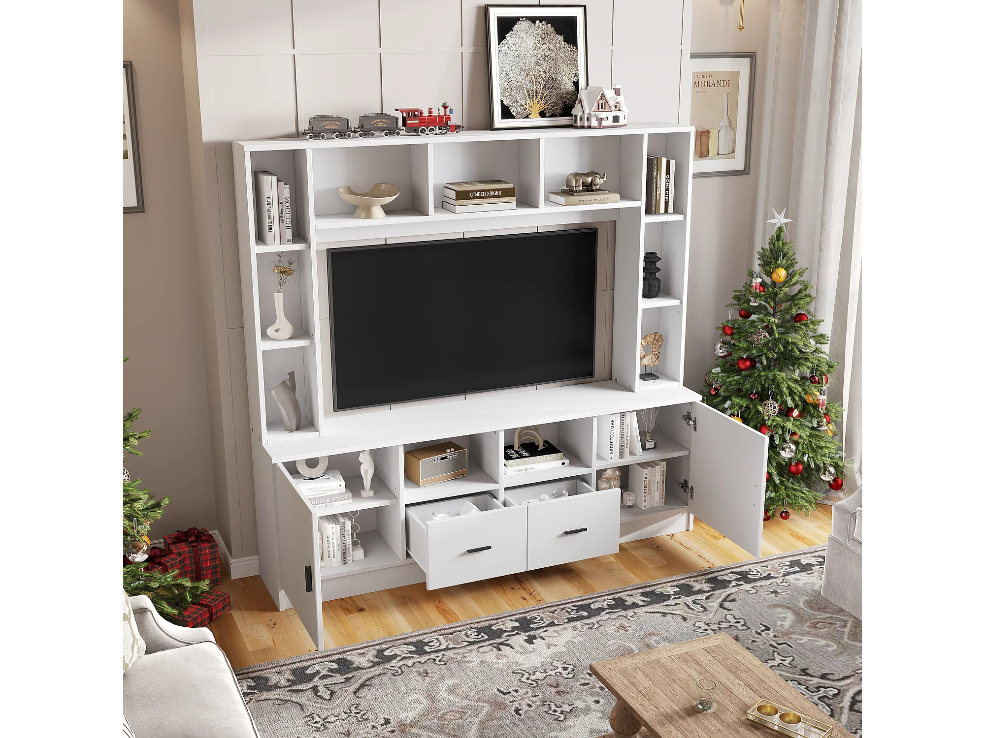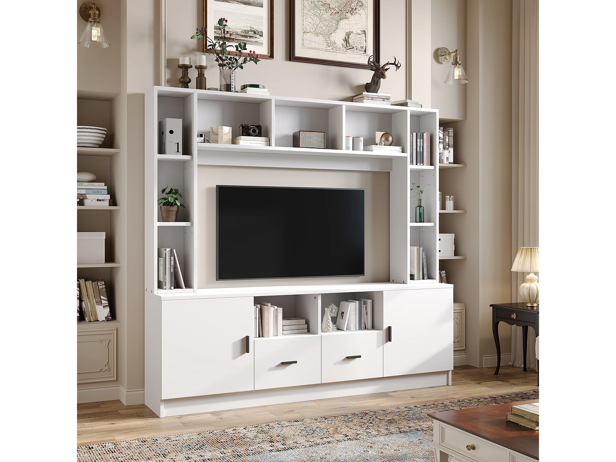 Ensemble meuble TV mural - 180 x 35 x 170 cm - avec vitrine + 2 portes + étagères + 2 tiroirs - aggloméré - blanc