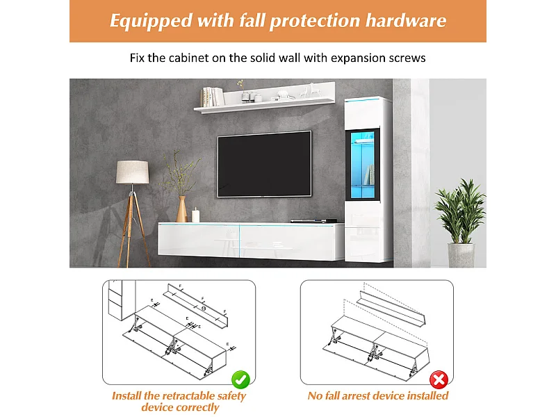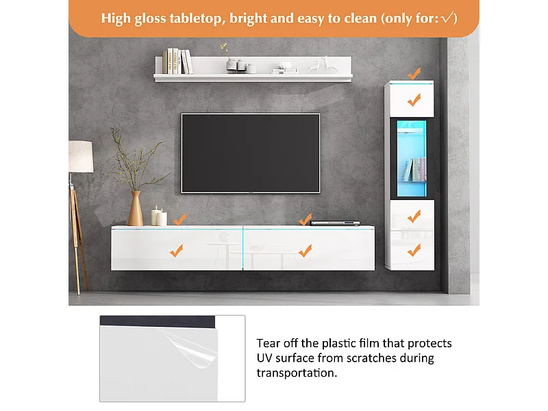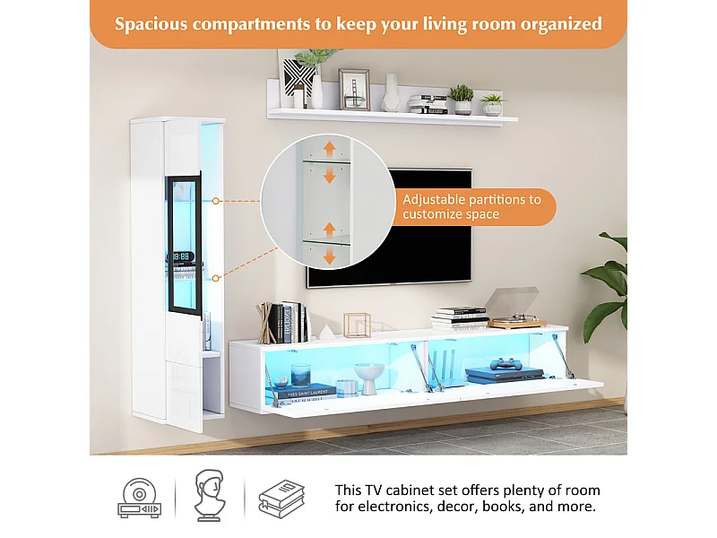 Ensemble mural TV: meuble TV, vitrine et étagère murale - avec RGB LED - brillant - Blanc