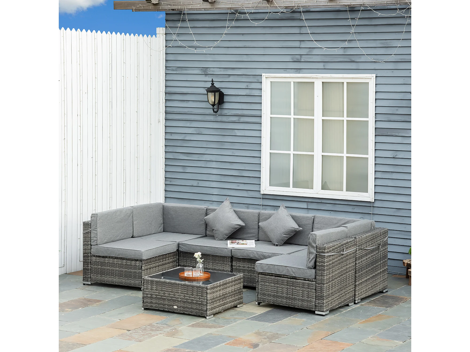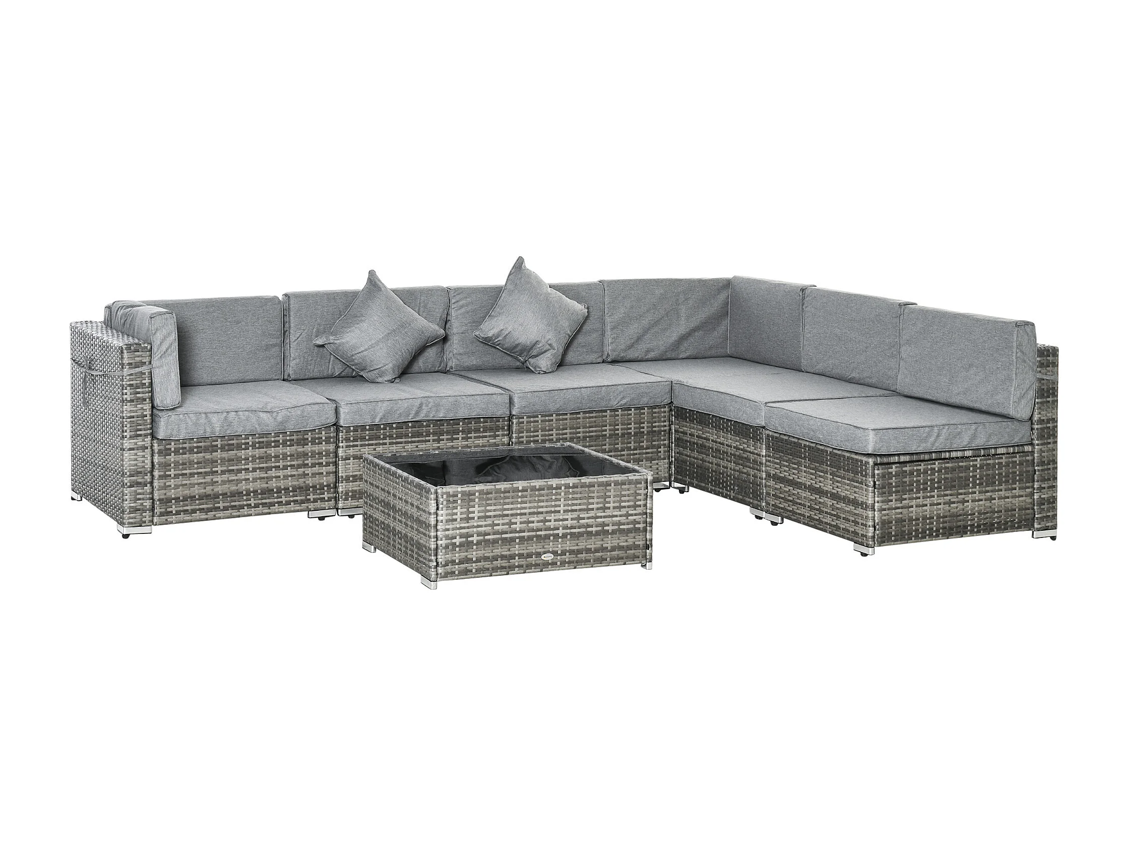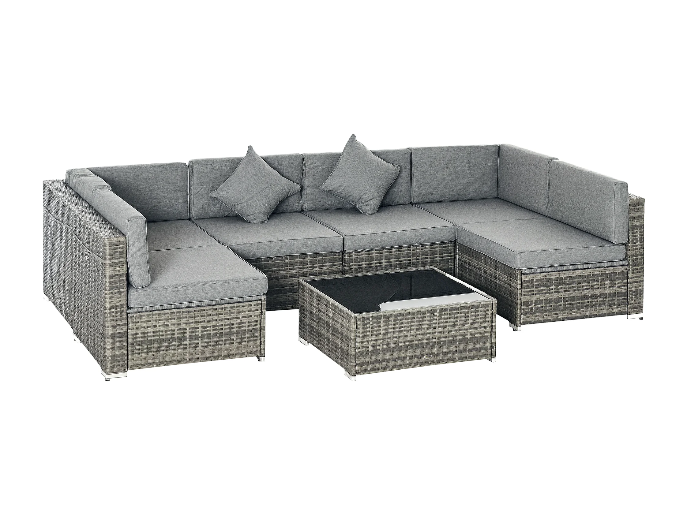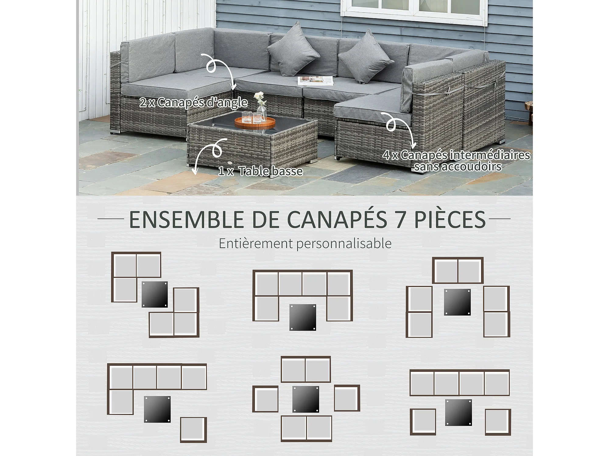 Ensemble salon de jardin 7 pièces modulables - table basse plateau verre trempé, coussins déhoussables - résine tressée grise