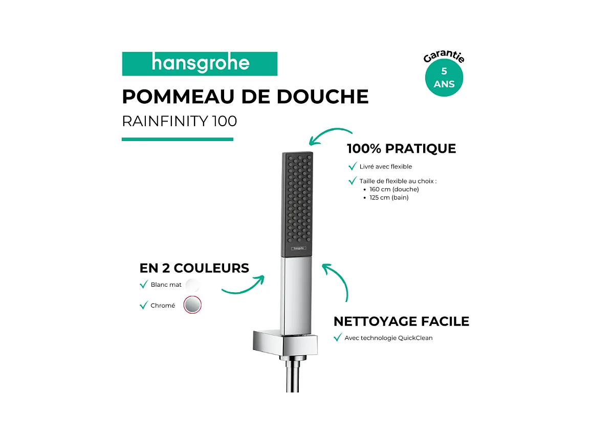 Ensemble support mural et douchette 100 1jet avec flexible de douche 160 cm chromé Hansgrohe Rainfinity