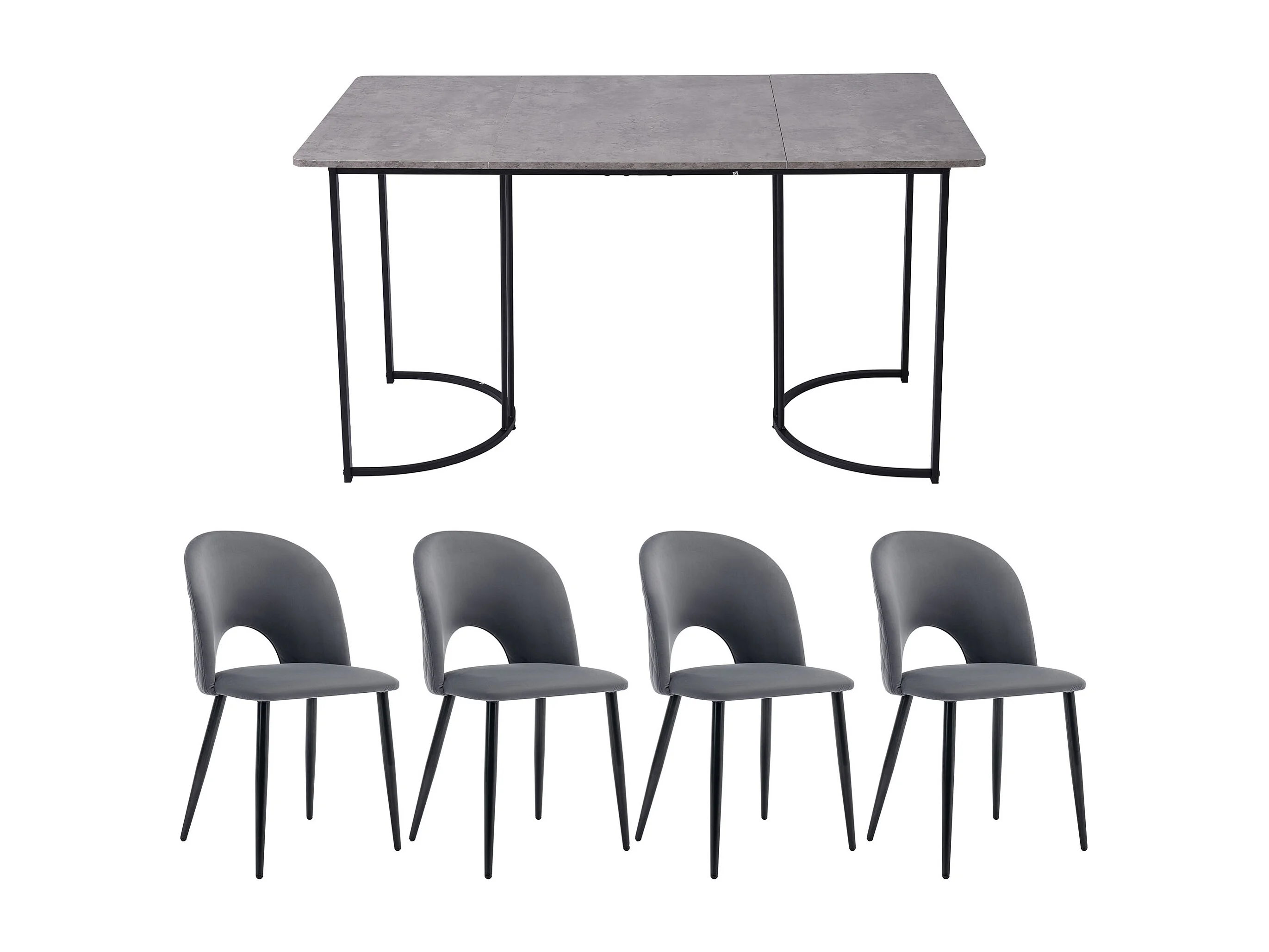 Ensemble table + 4 chaises -140×80×75cm, MDF+métal+velours, noir+gris