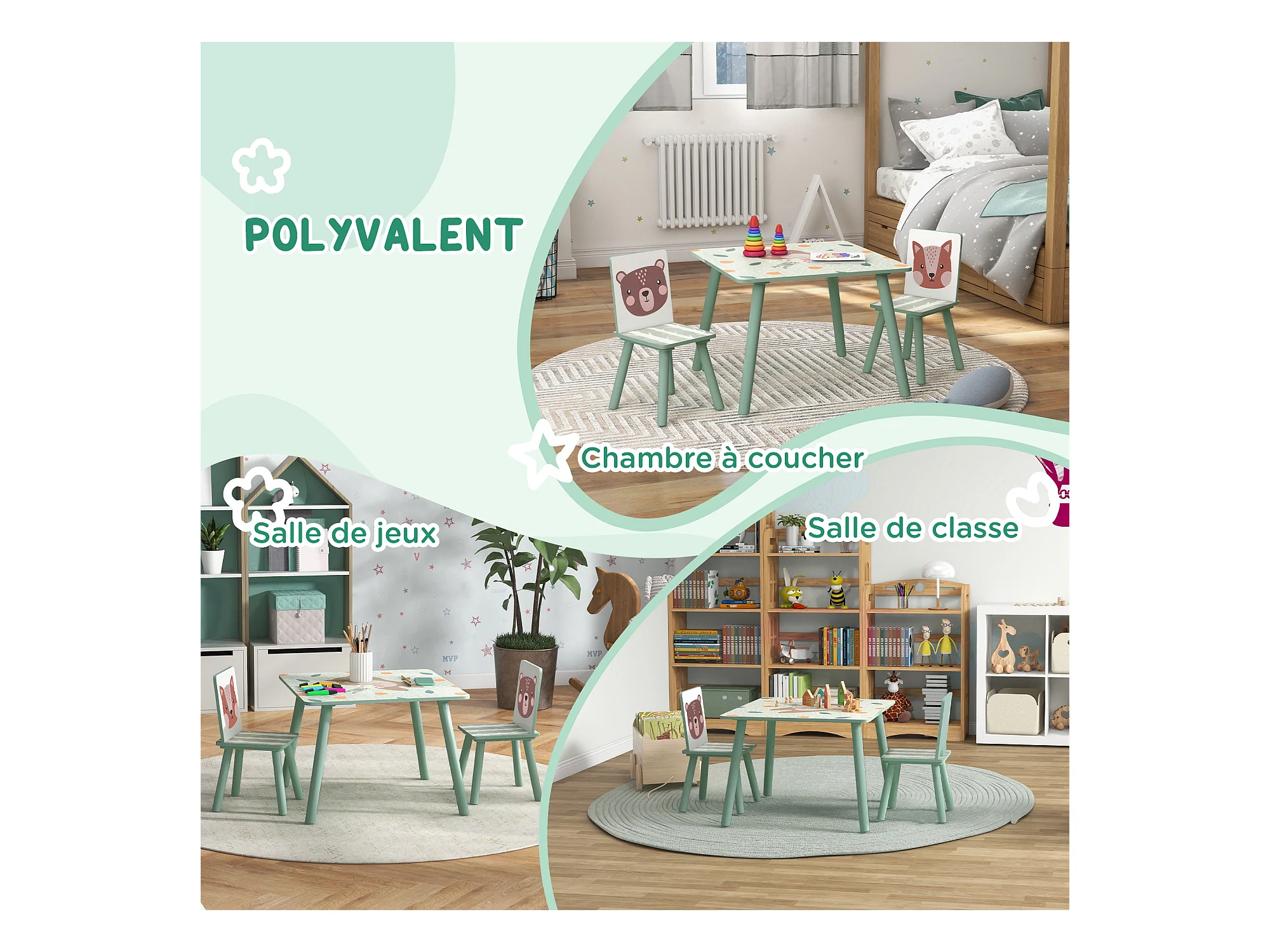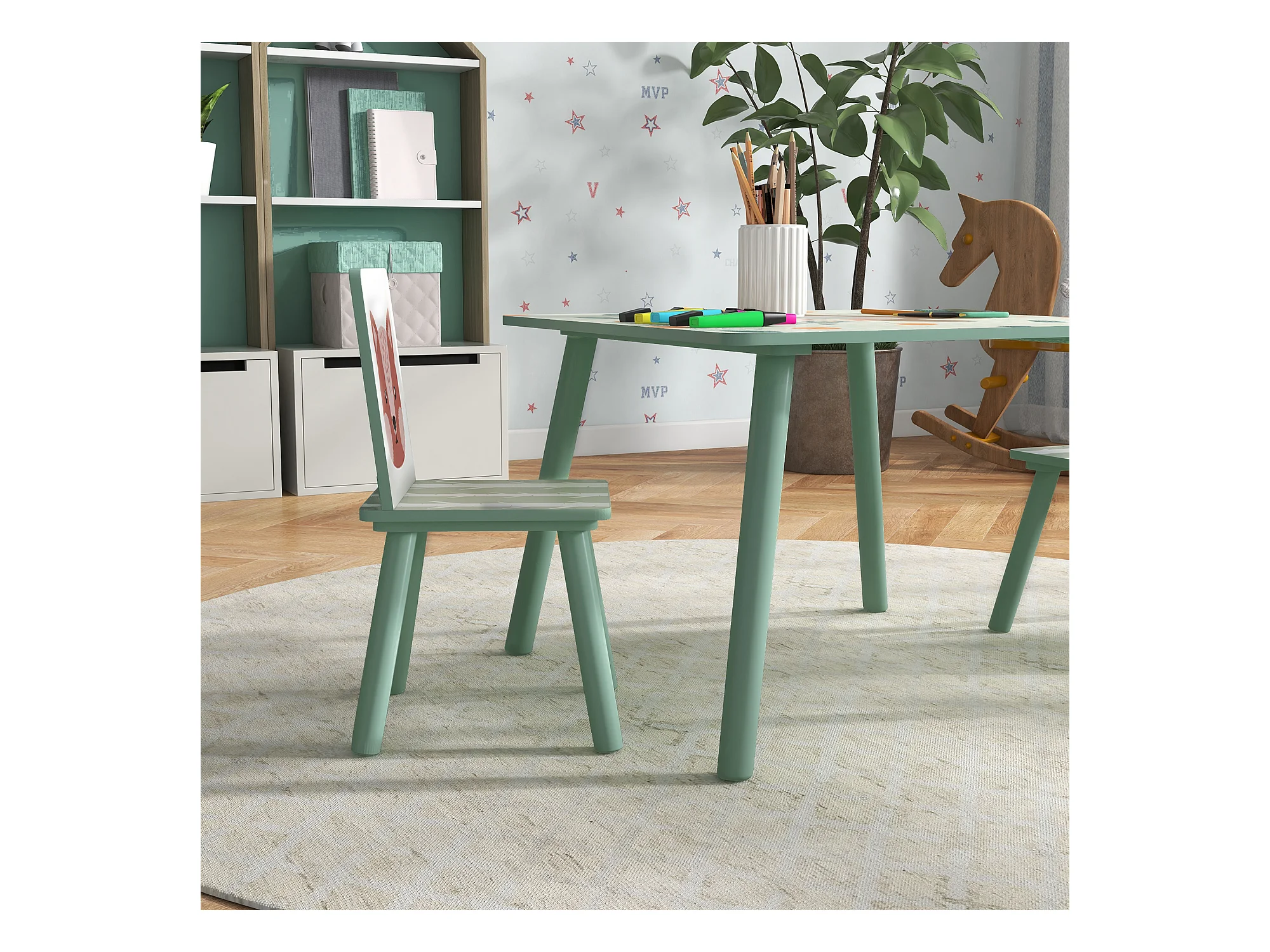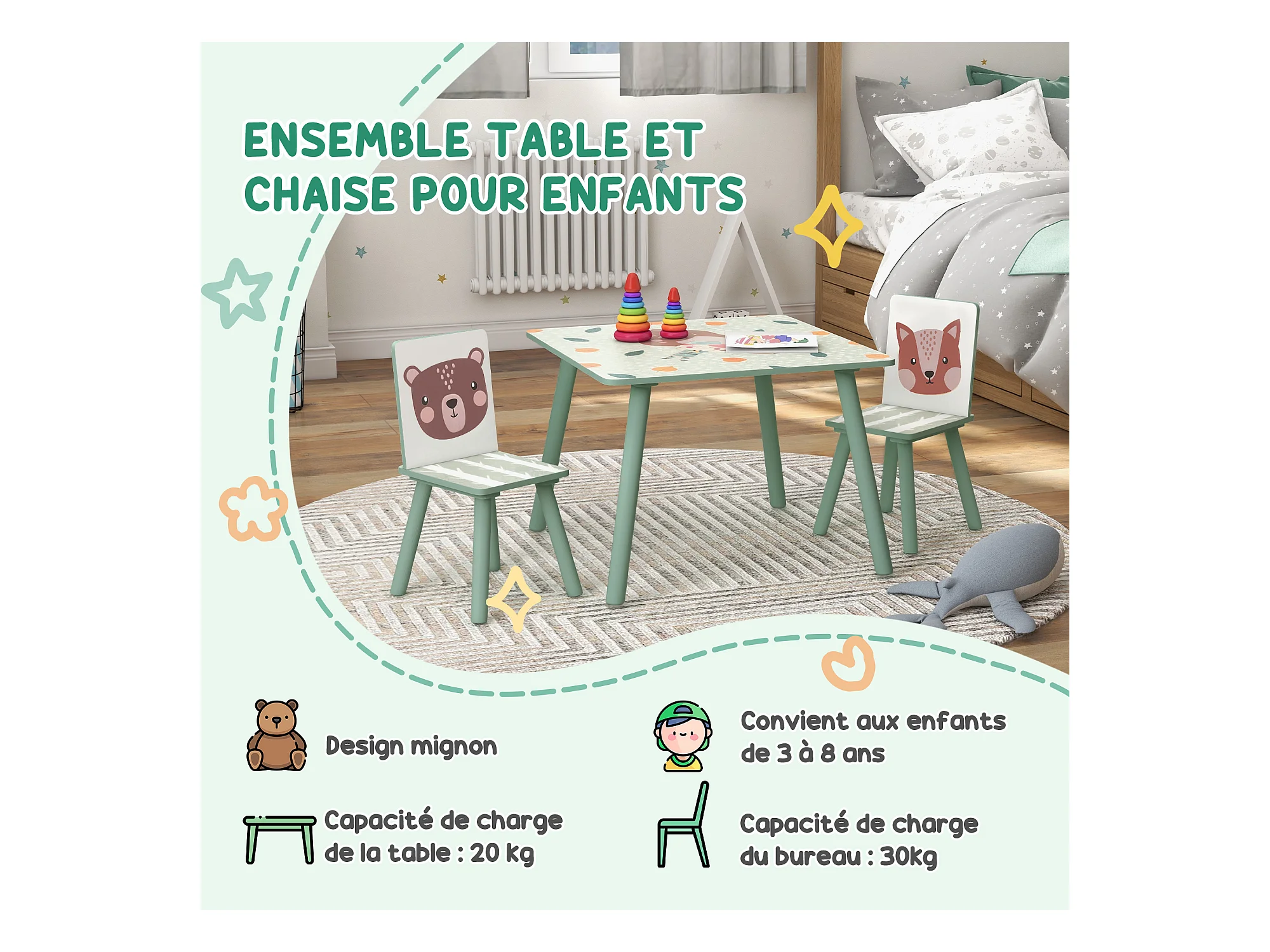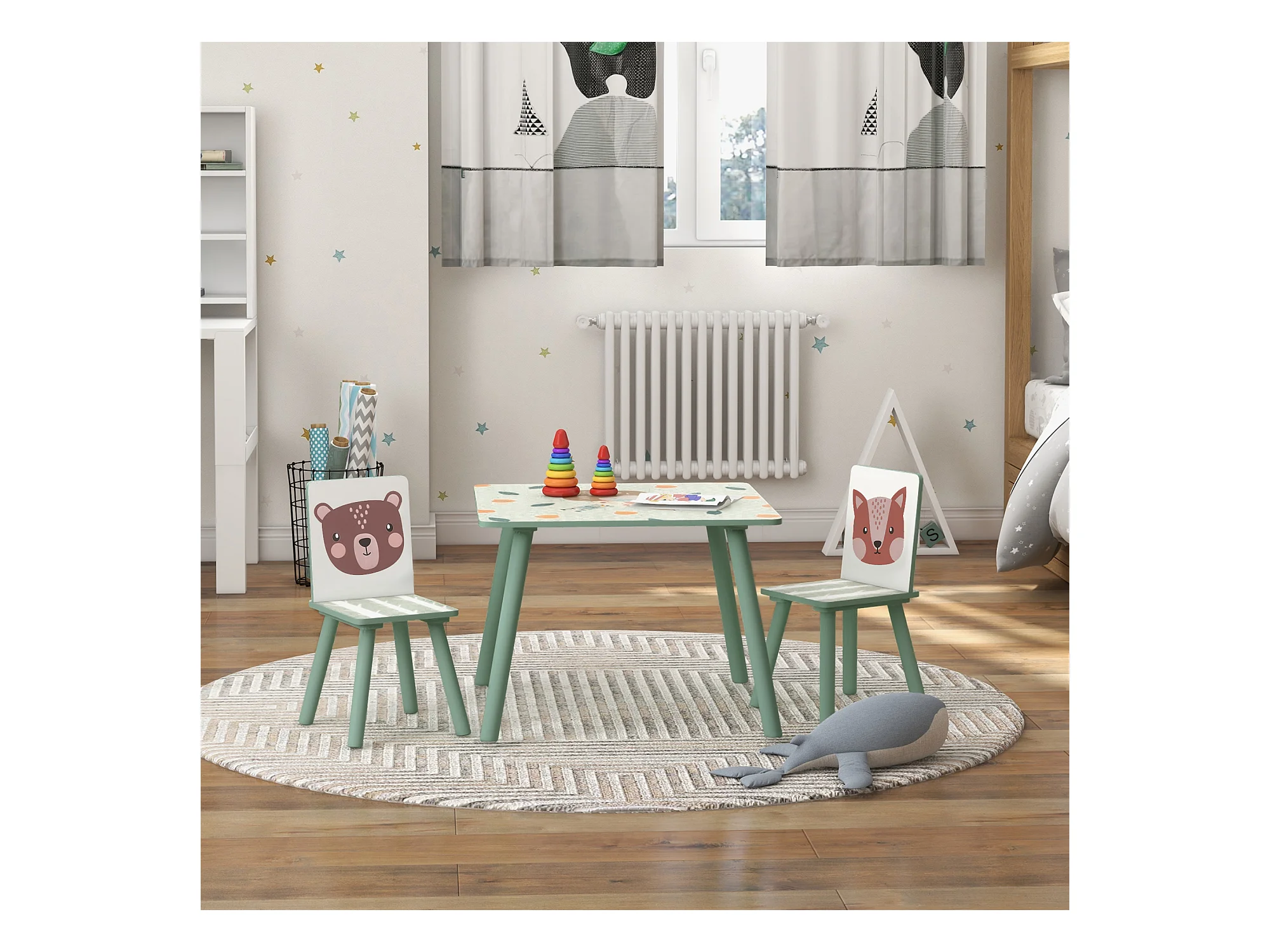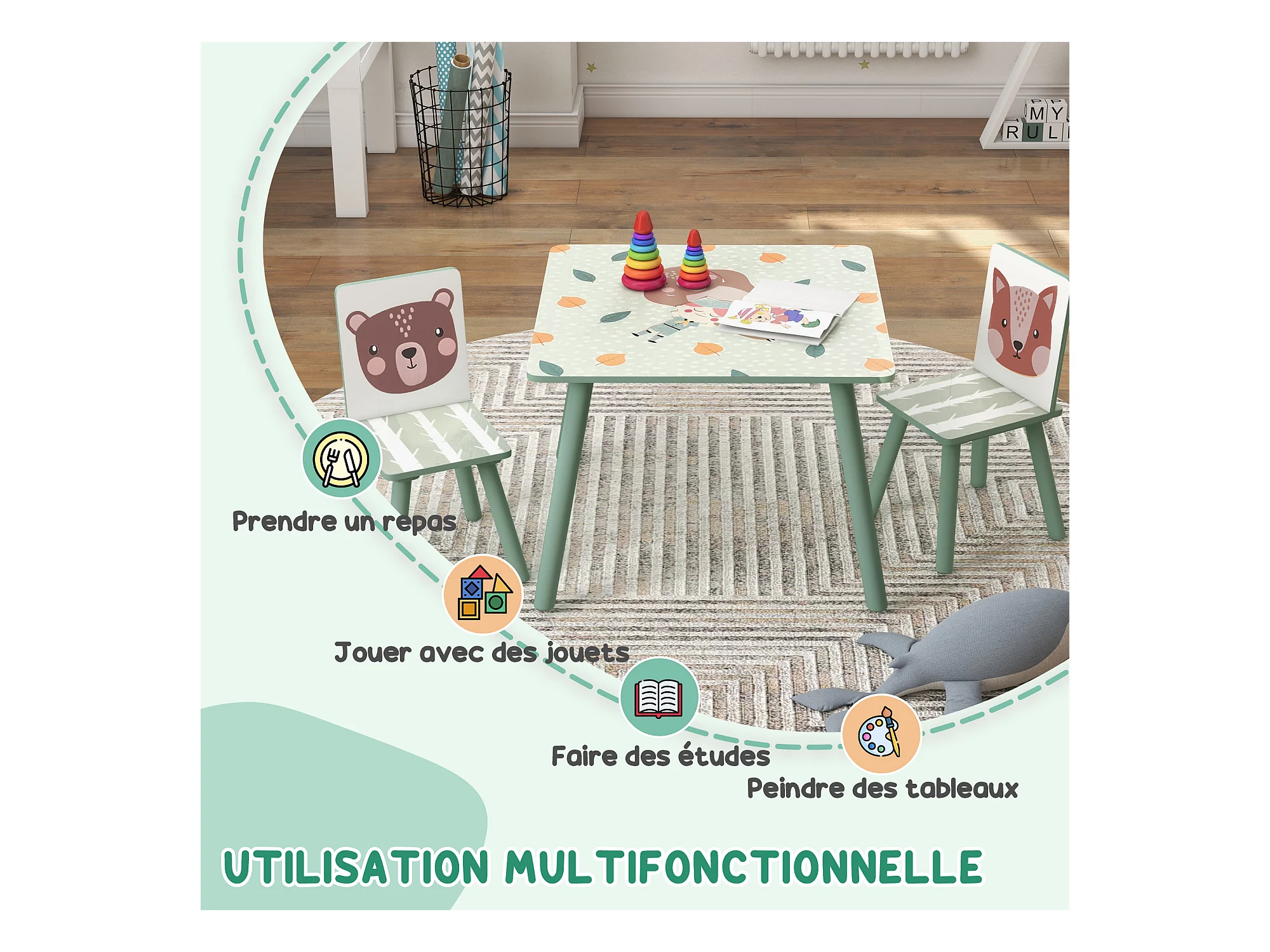 Ensemble table et chaises enfant design animaux de la forêt - table carrée + 2 chaises - bois pin MDF vert