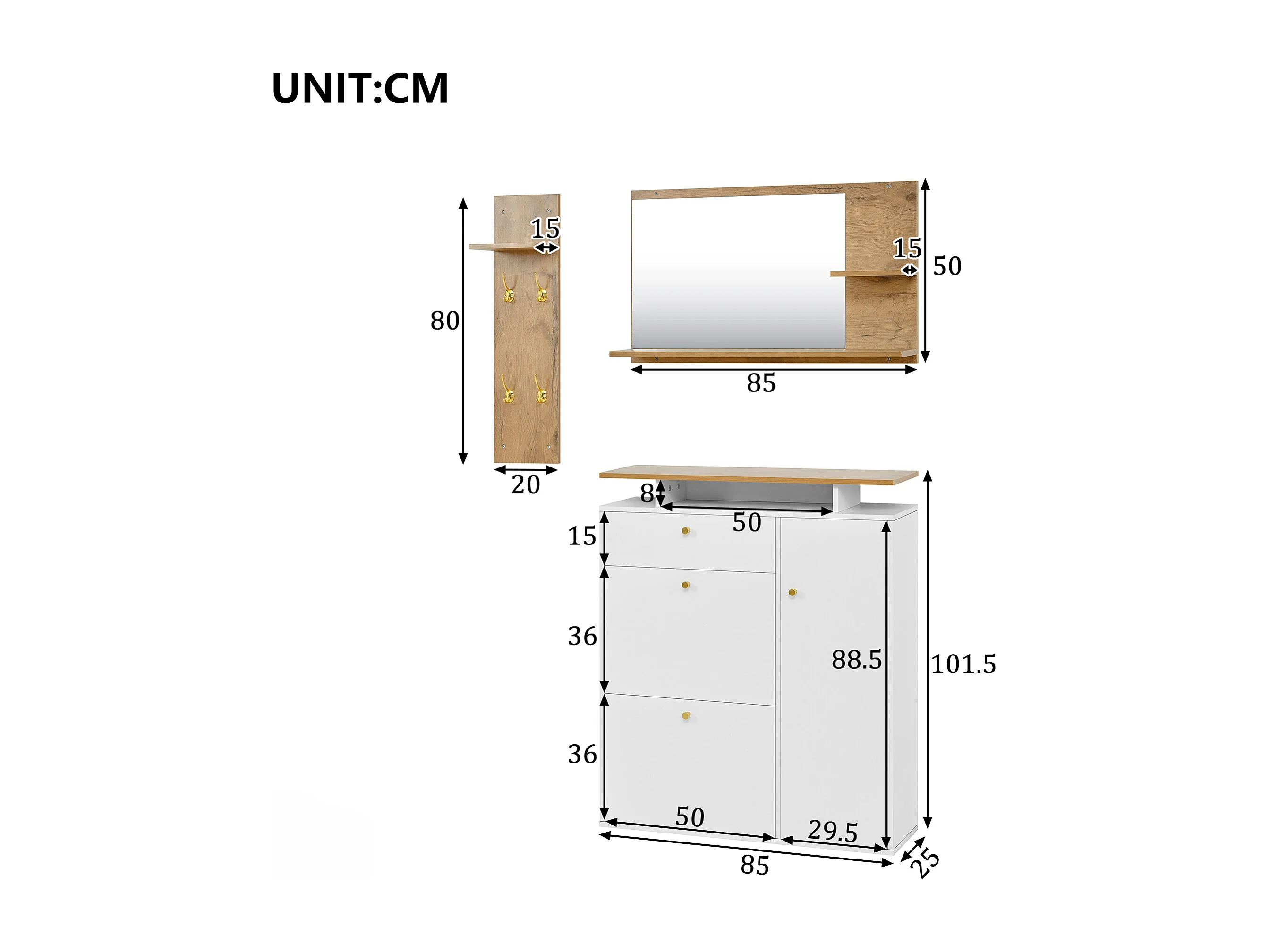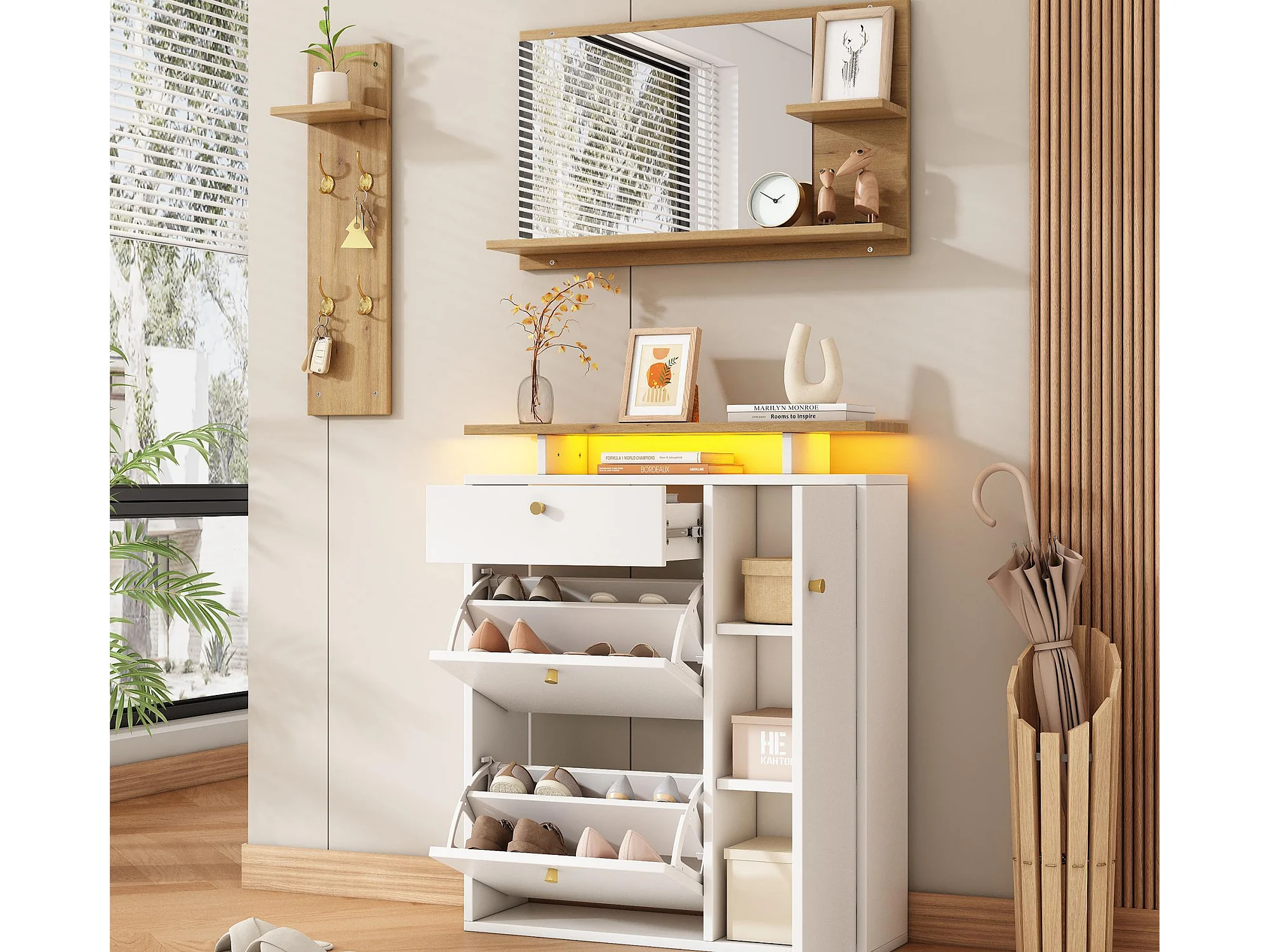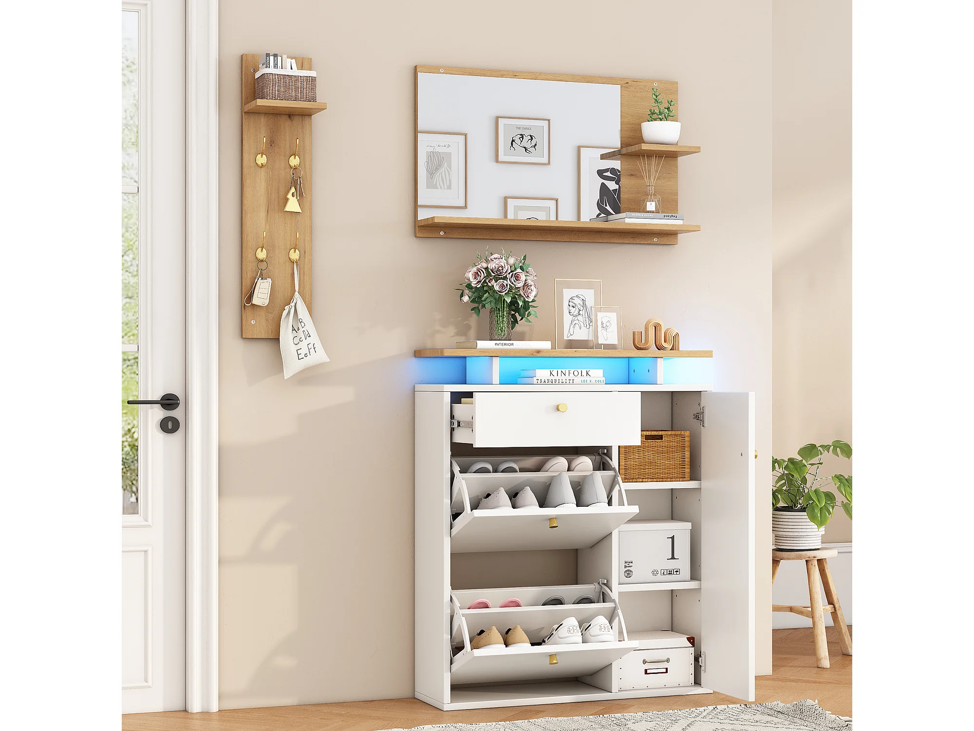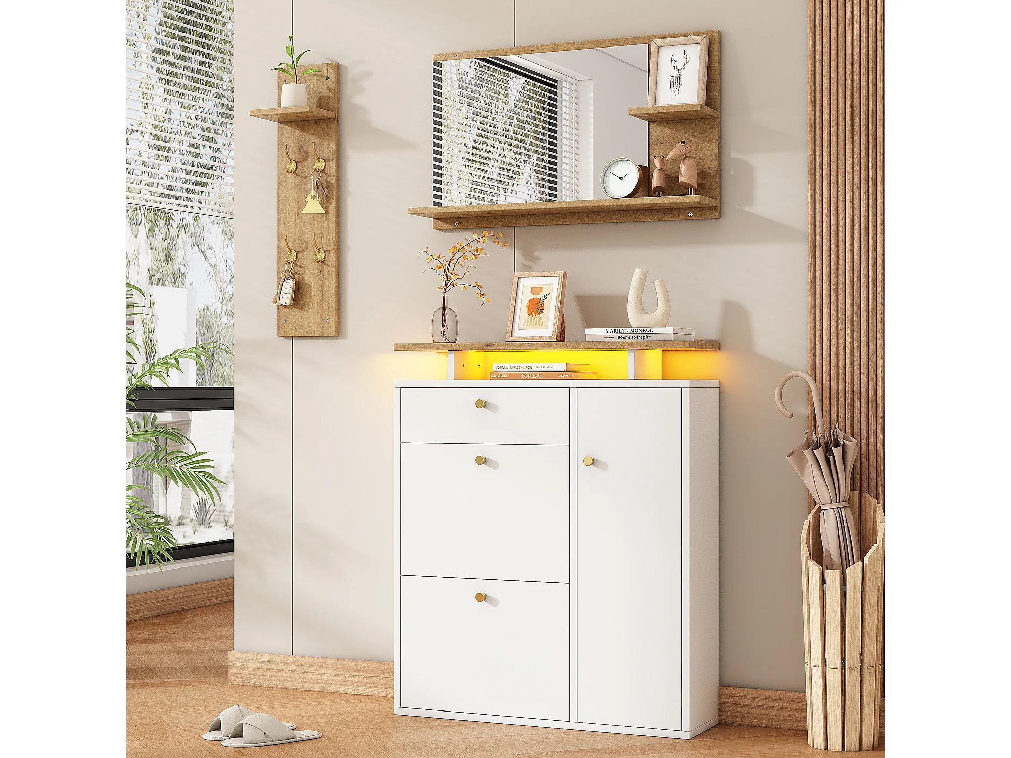 Ensemble vestiaire d'entrée 105x25x151.5cm - avec LED - avec 3 portes et 1 tiroir - avec miroir et meuble à chaussures - Blanc + Naturel