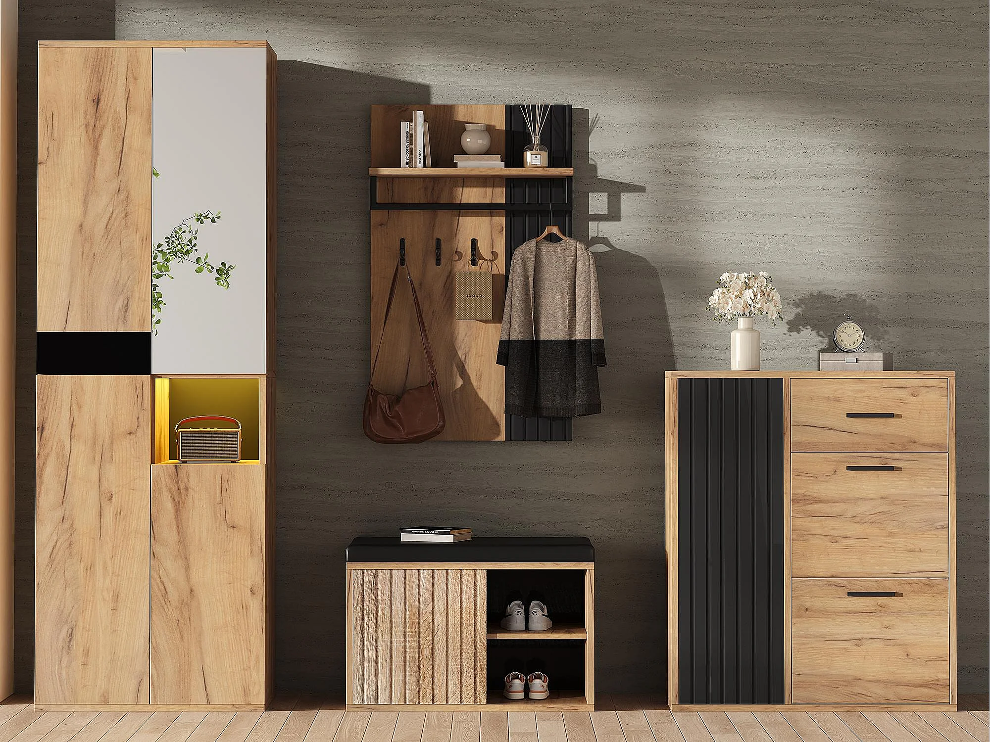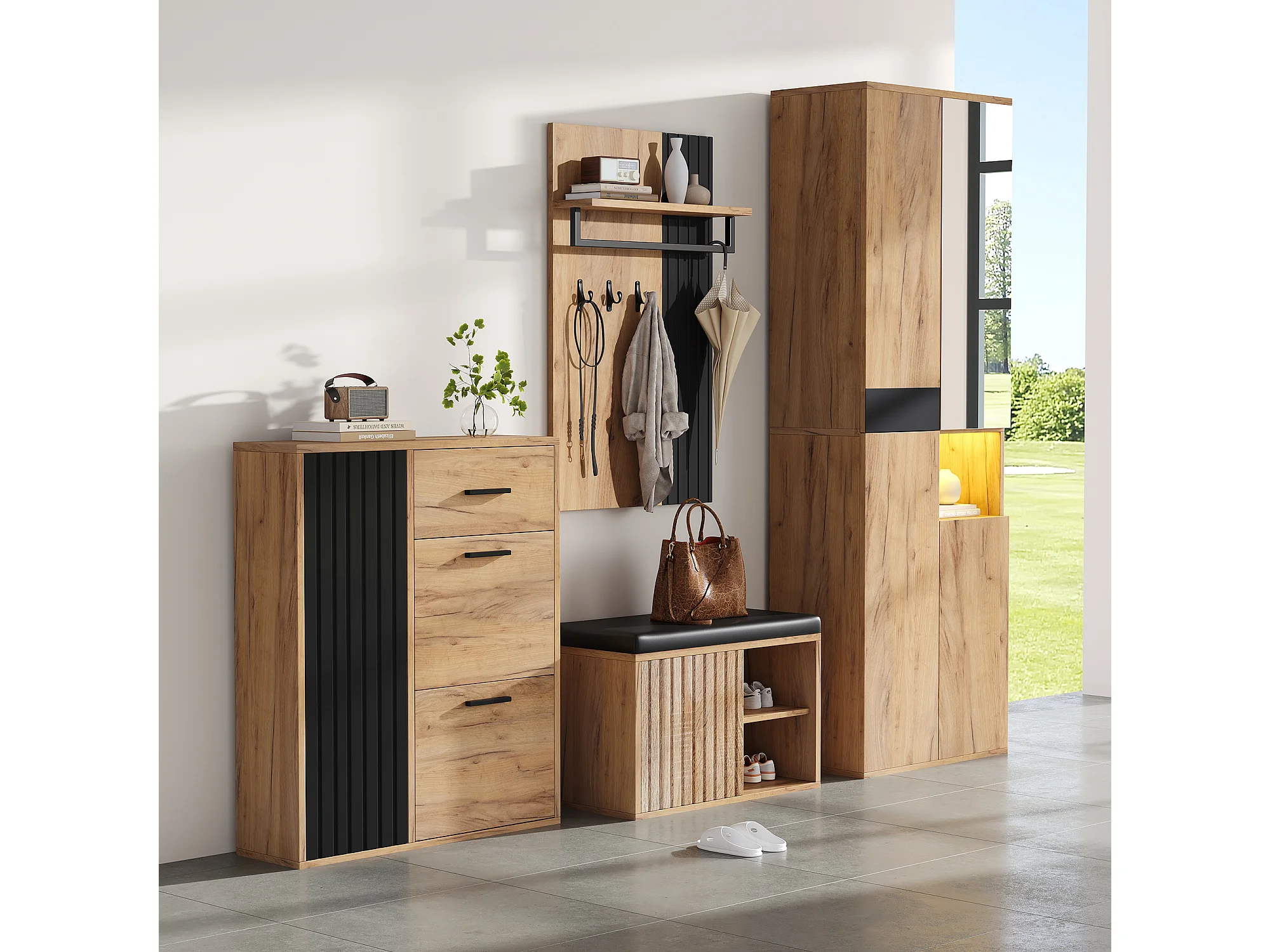 Ensemble vestiaire d'entrée 4 pièces - meuble à chaussures et banc à chaussures - armoire et porte-manteau - Naturel + Noir