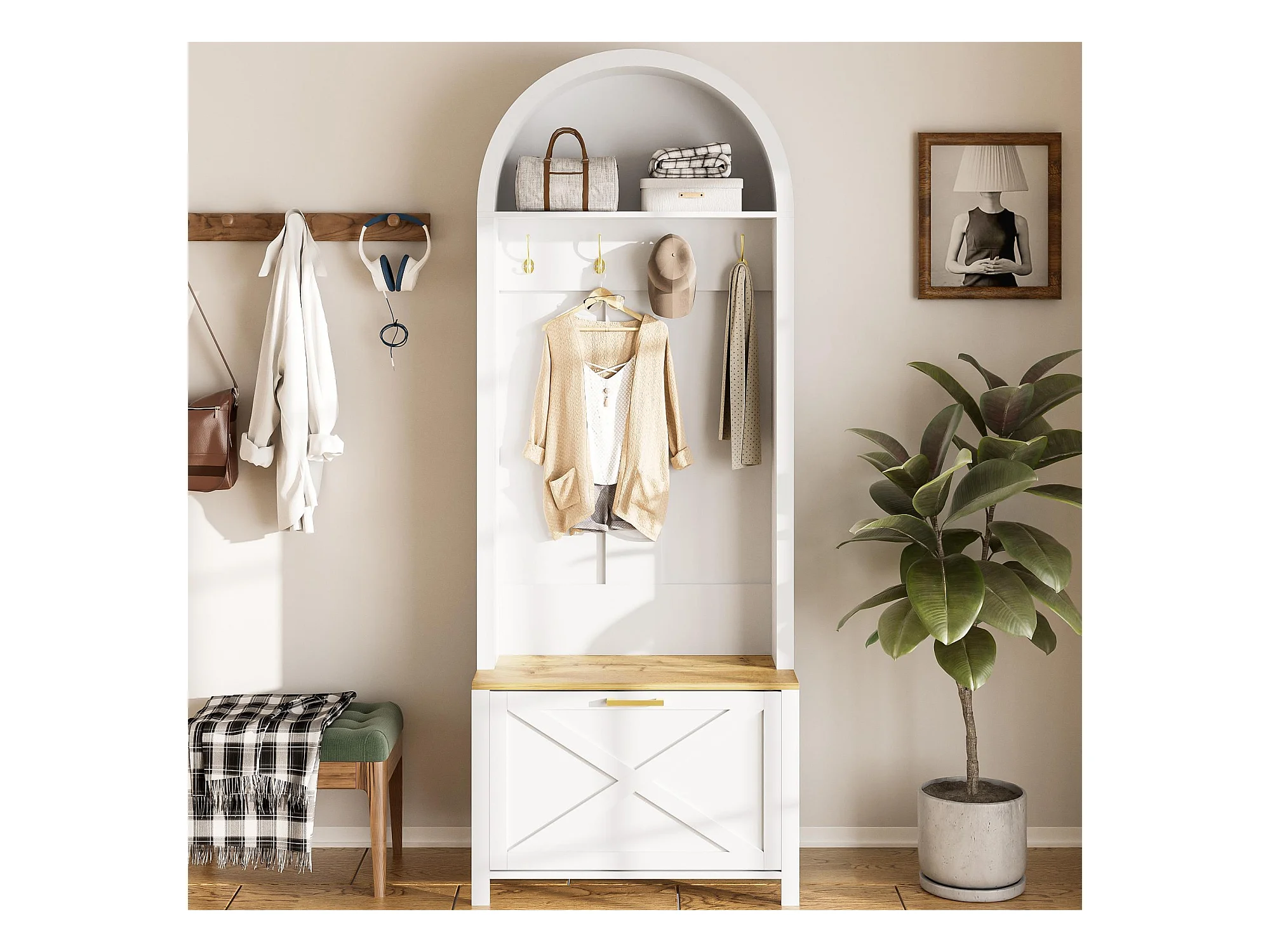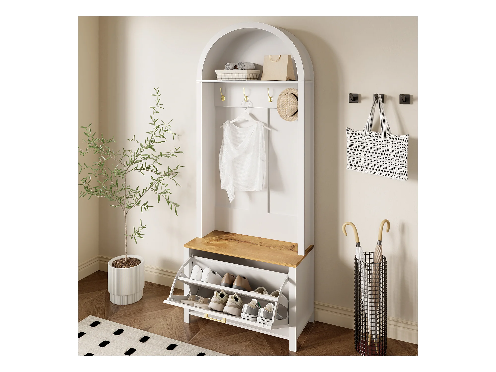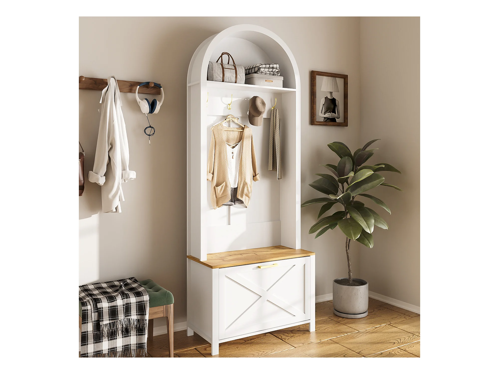 Ensemble vestiaire d'entrée 75x35x195 cm - avec meuble à chaussures et crochets - avec étagères - Blanc