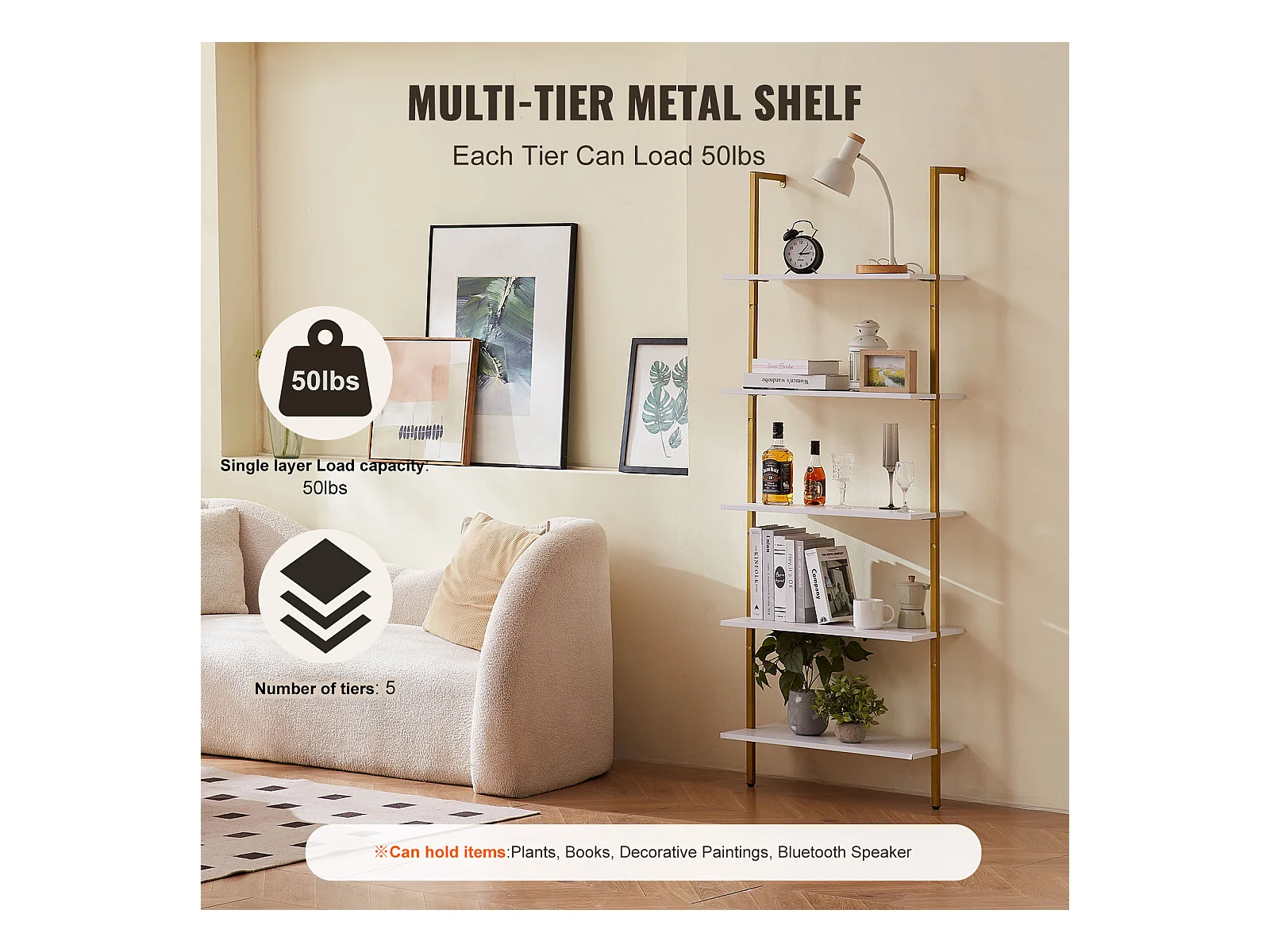 Étagère SucceBuy à 5 Niveaux, 64x30 cm, Montage Mural, Bois Rustique, Rangement, Or Blanc, Espaces de Vie