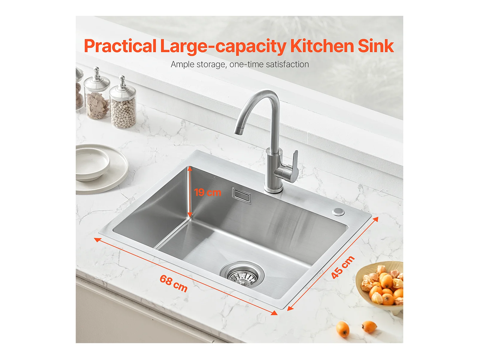 Évier de Cuisine SucceBuy Évier de Cuisine 68 cm à Montage par le Haut, Cuve Simple à Encastrer, Barre en Acier Inoxydable