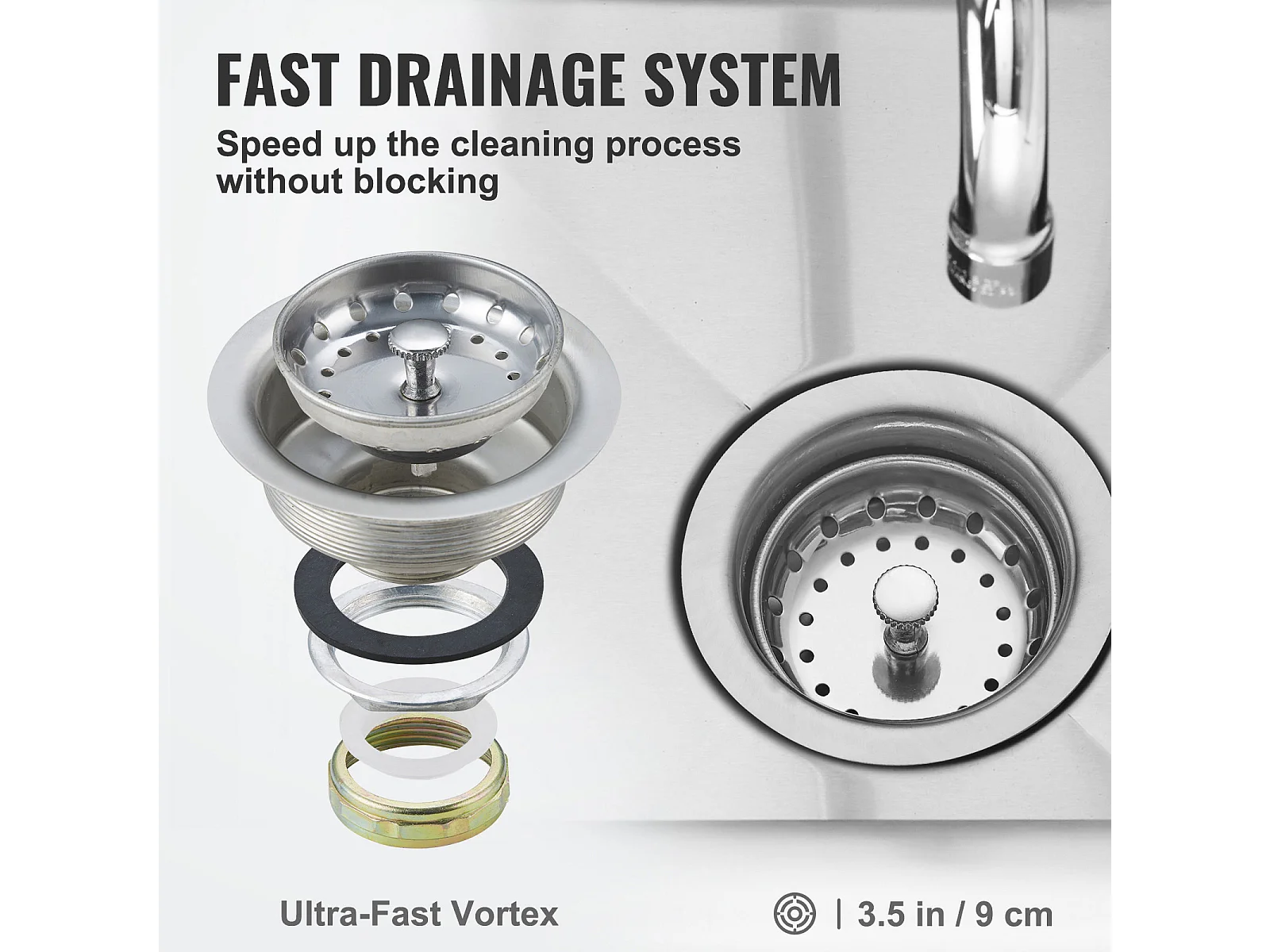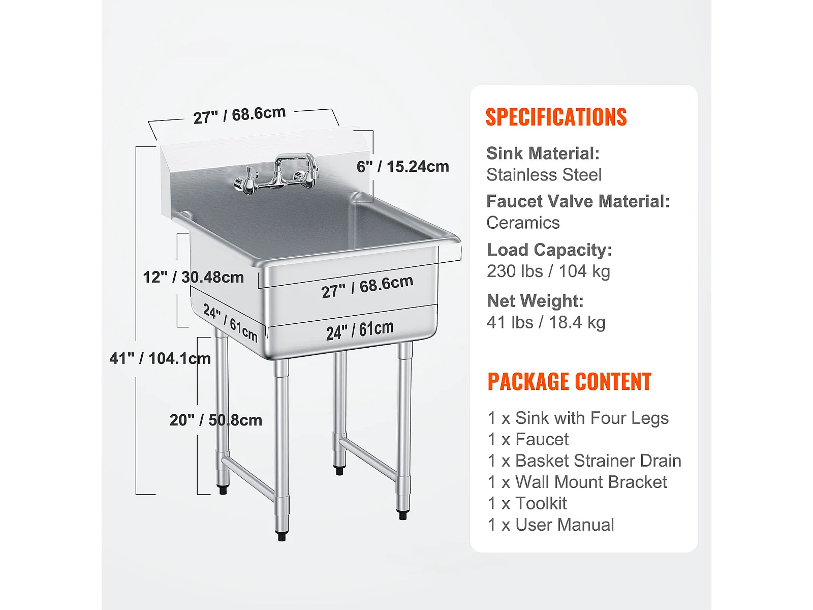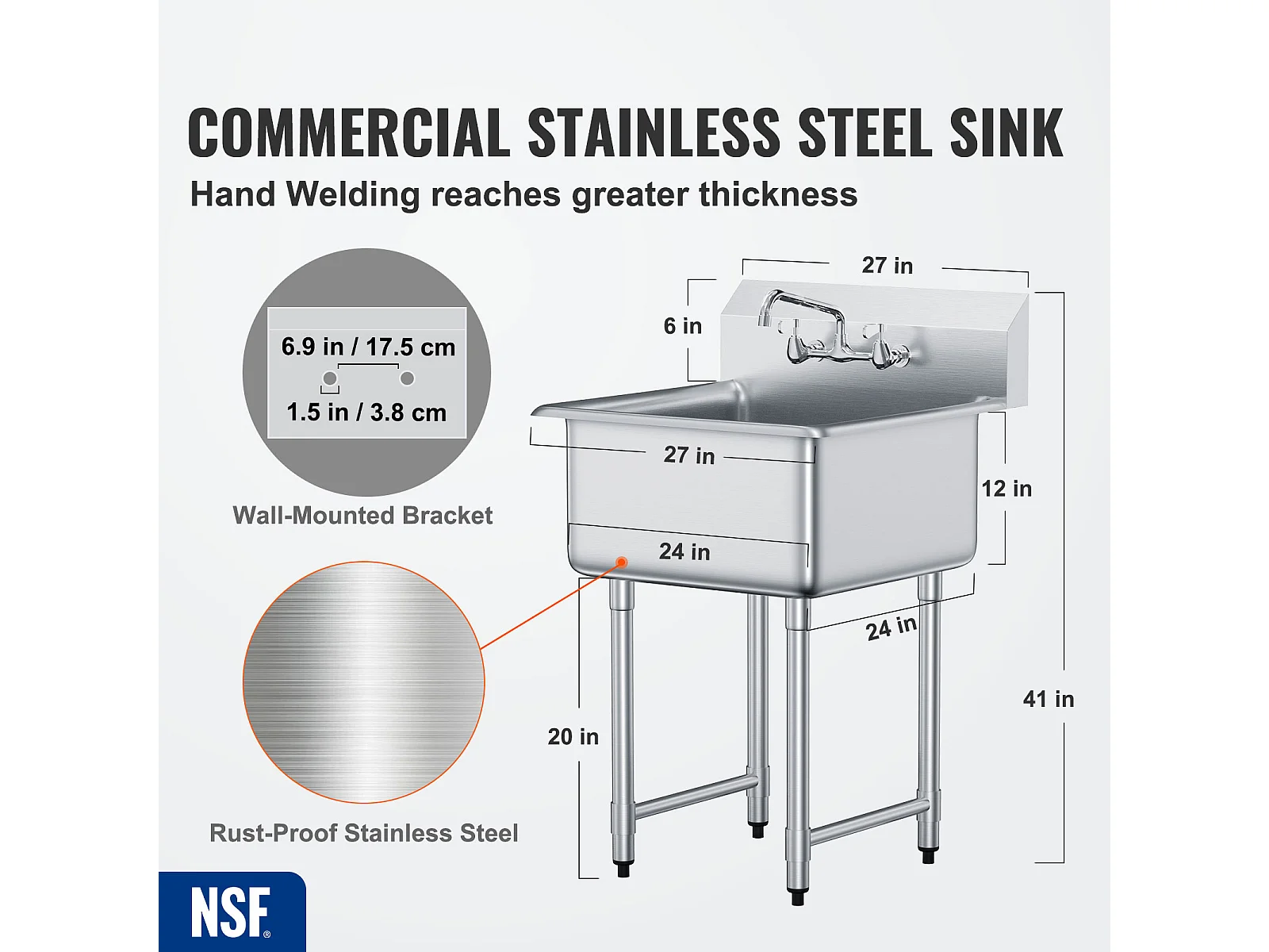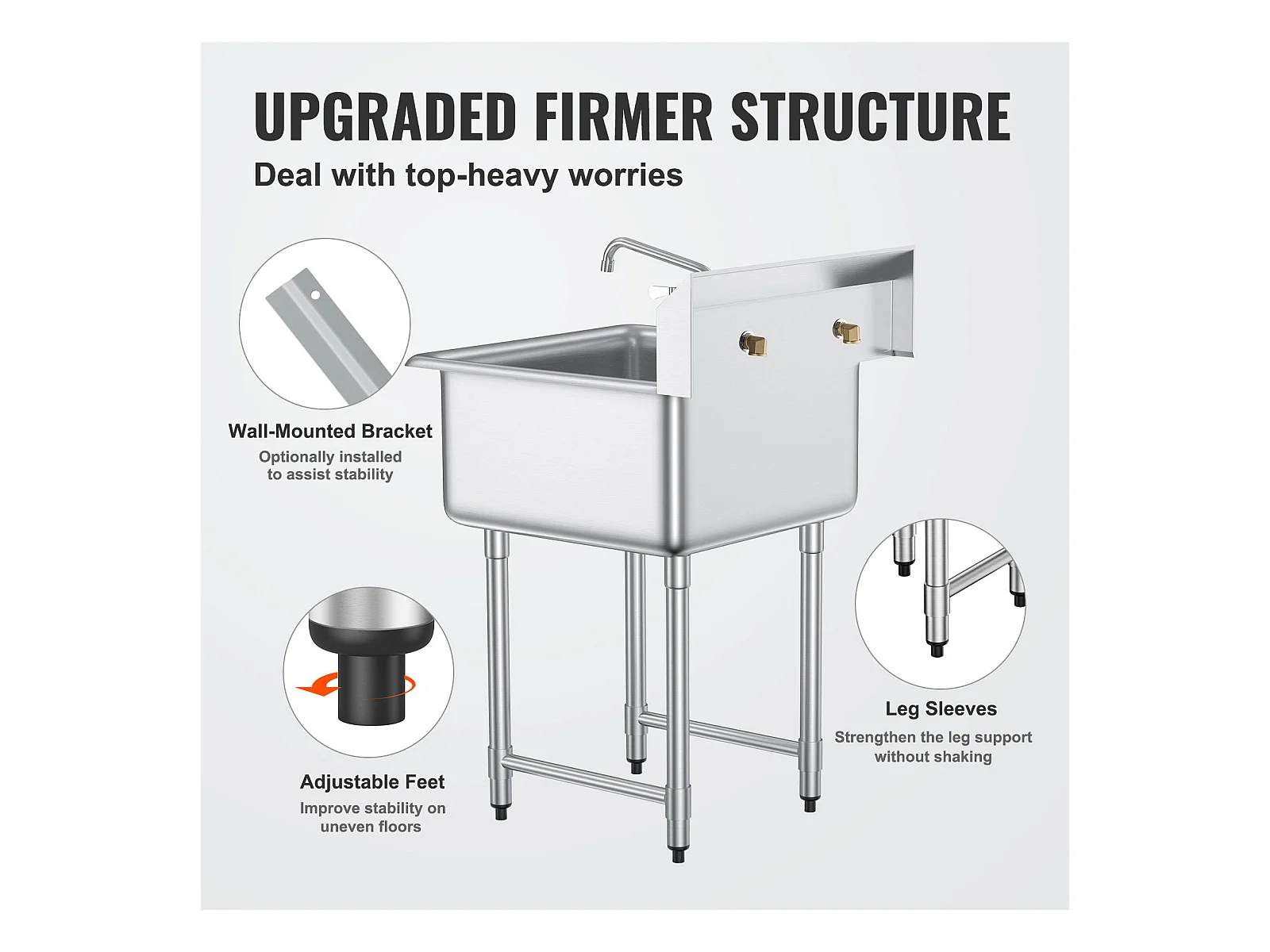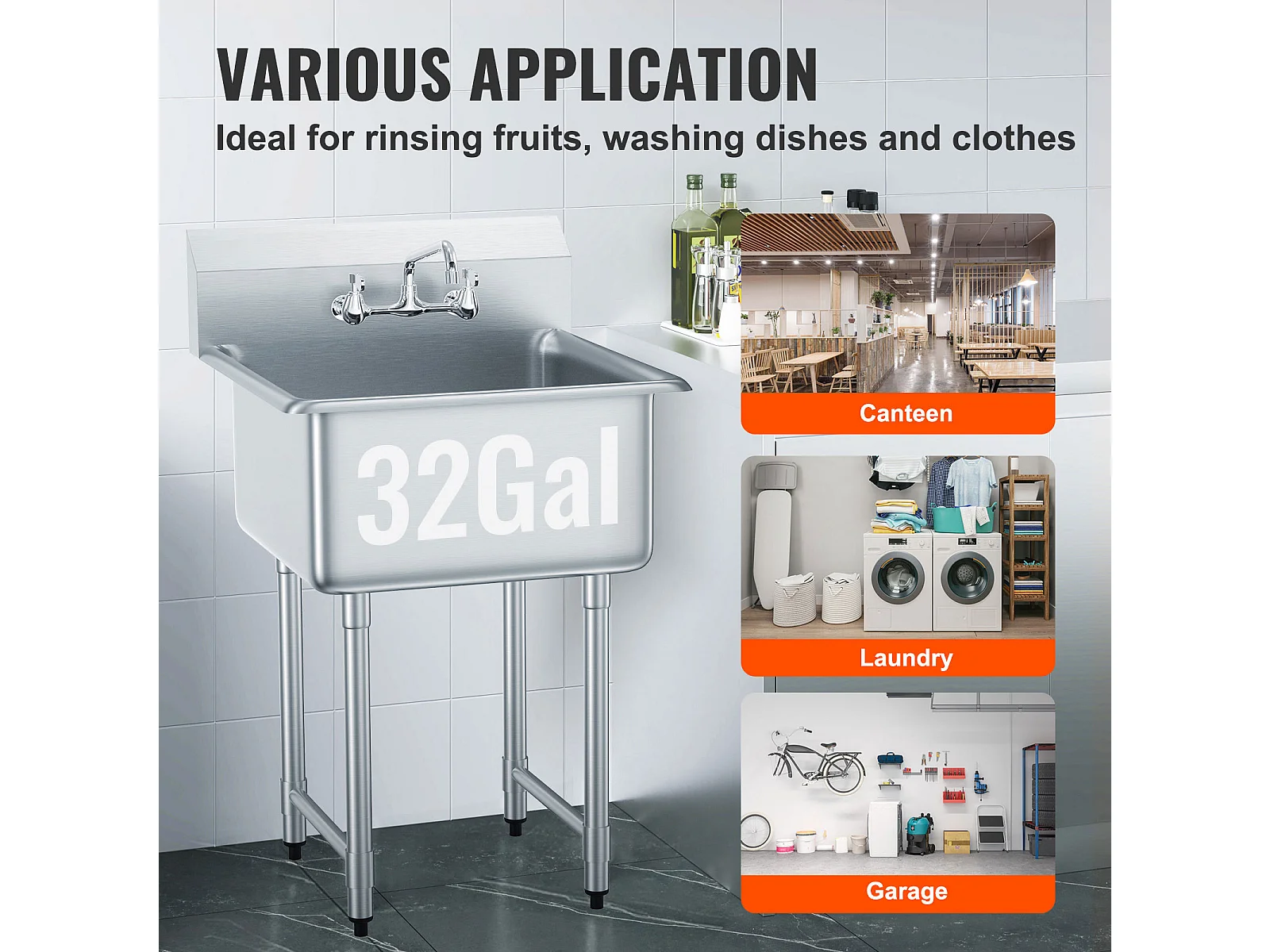 Évier en Acier Inoxydable à 1 Compartiment SucceBuy, 93x61x60cm, pour Faire la Plonge Cuisine de Restaurants, Salle de Bain, Garages