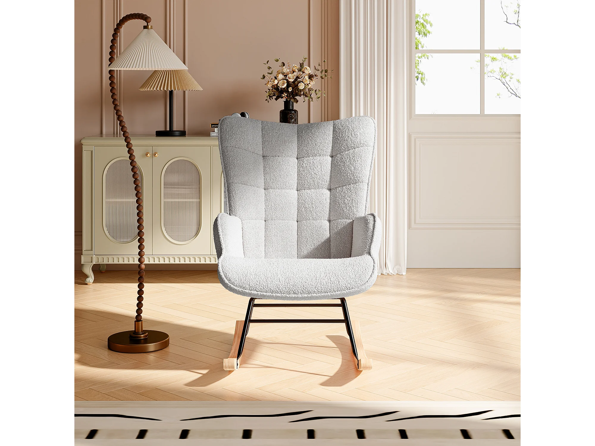 Fauteuil à bascule,rocking chair avec accoudoirs,Pieds en bois massif,Pour le salon, chambre,peluche d'agneau,Gris clair