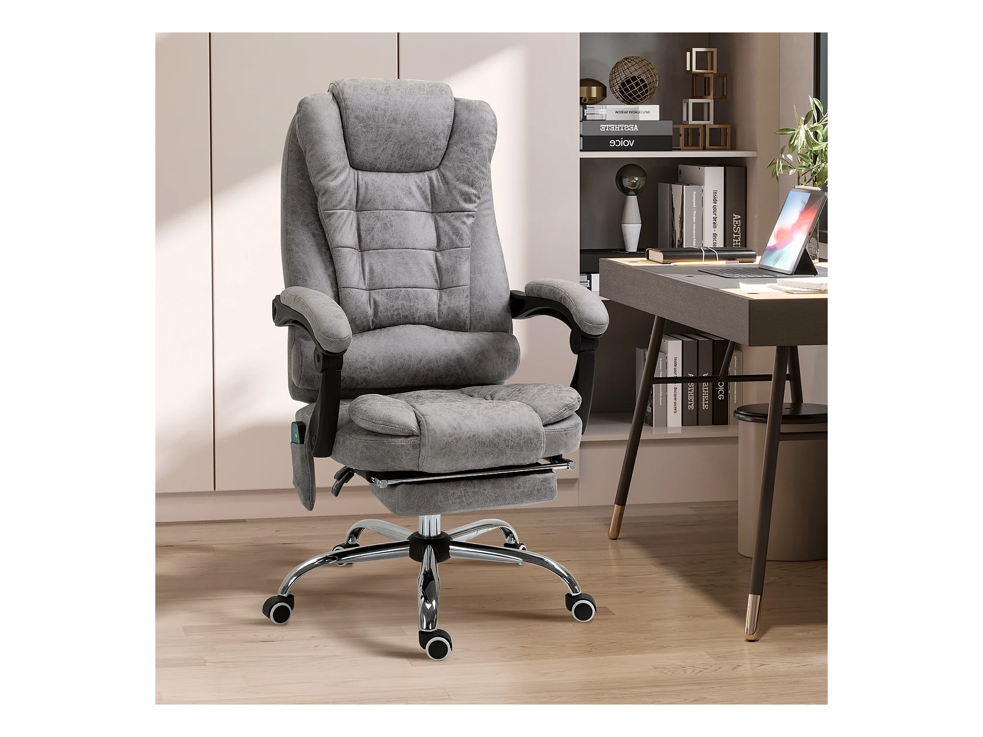 Fauteuil de bureau direction massant chauffant inclinable réglable repose-pied intégré tissu toucher flanelle grise