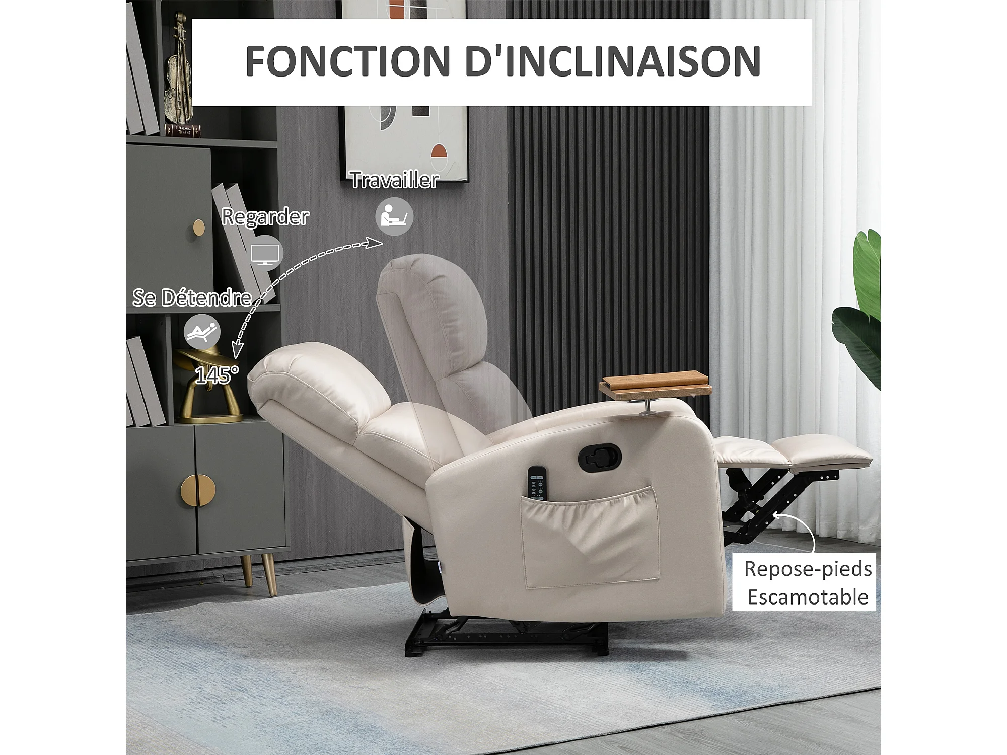 Fauteuil de massage inclinable avec repose-pied télécommande revêtement synthétique tissu beige