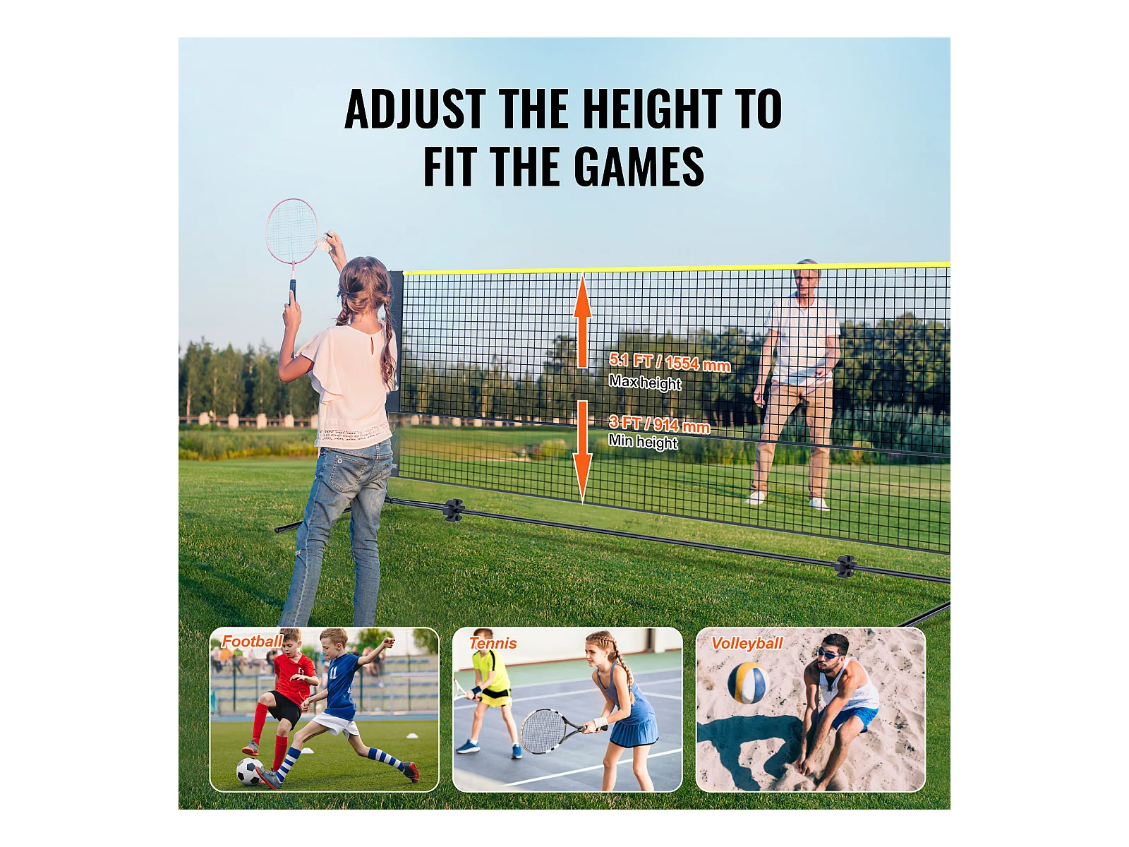 Filet de Badminton, SucceBuy Ensemble de Volley-ball et de Badminton d'Extérieur, Filet Portable, Hauteur Réglable
