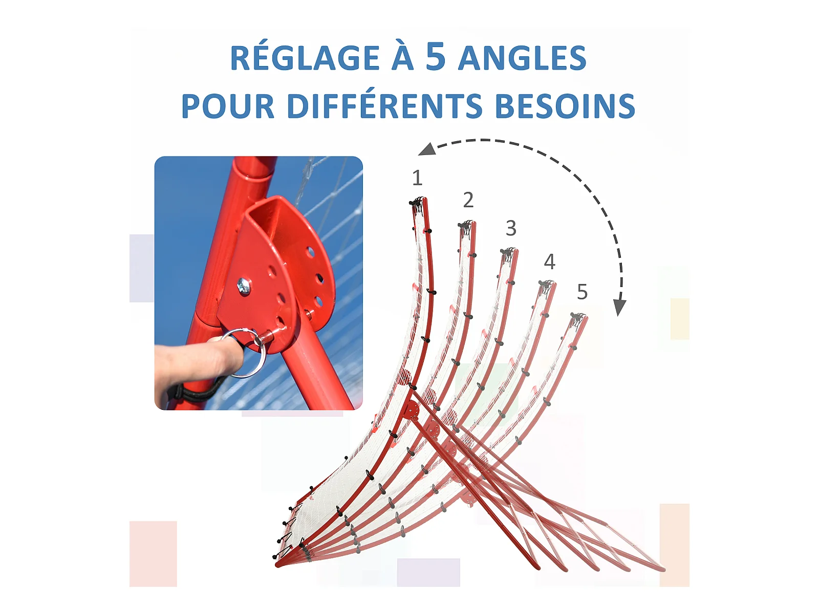 Filet de rebond pliable inclinaison réglable - piquets d'ancrage inclus - filet PE noir métal époxy rouge