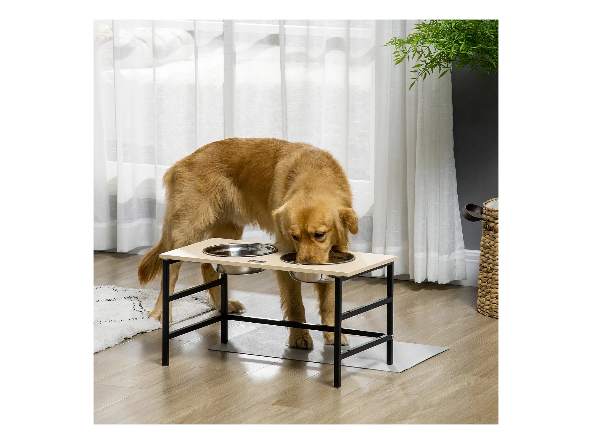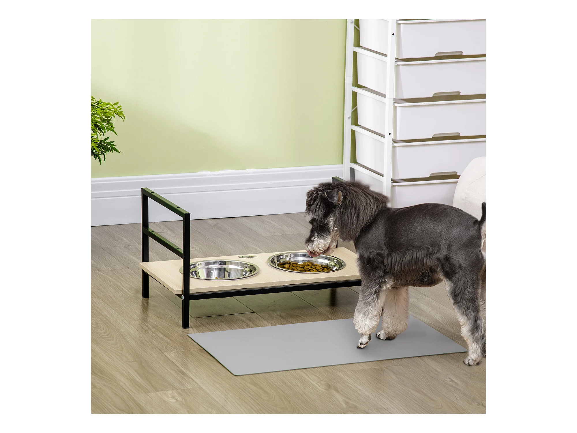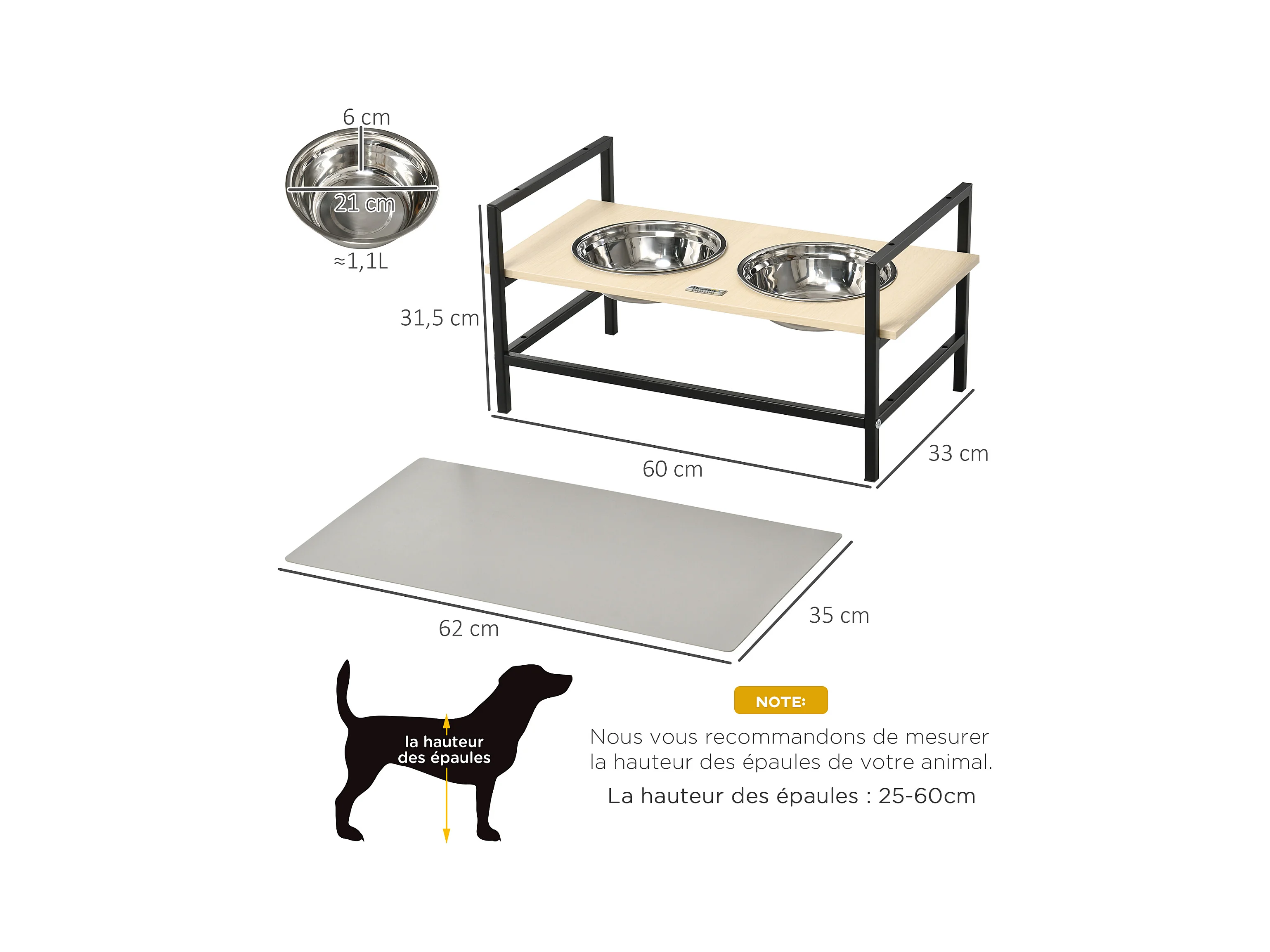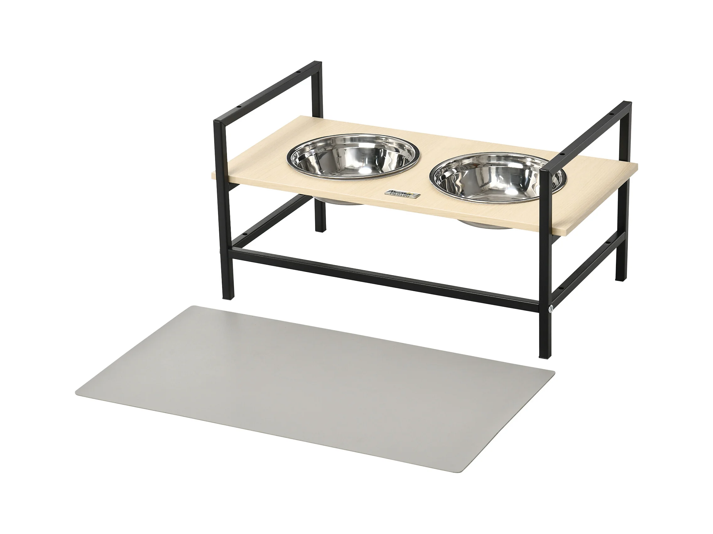 Gamelle double chien porte-gamelles surélevé réglable 2 gamelles acier inox et tapis inclus acier noir aspect bois clair