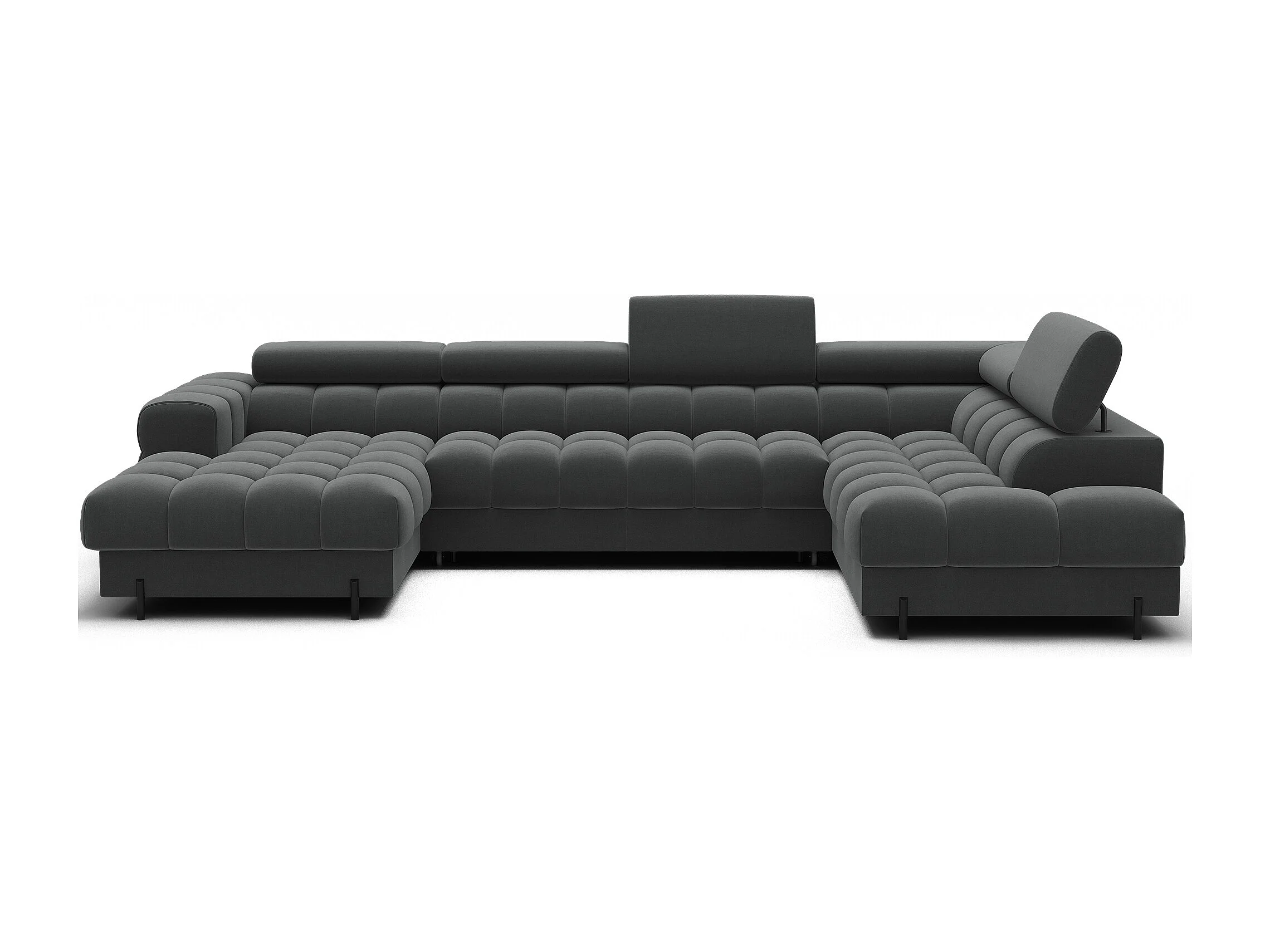 Grand canapé panoramique avec têtières réglables tissu FUZIAN – Fonction lit-Gris anthracite-Coffre à droite