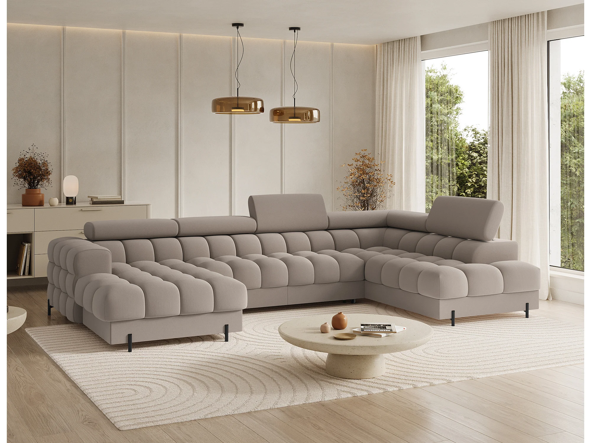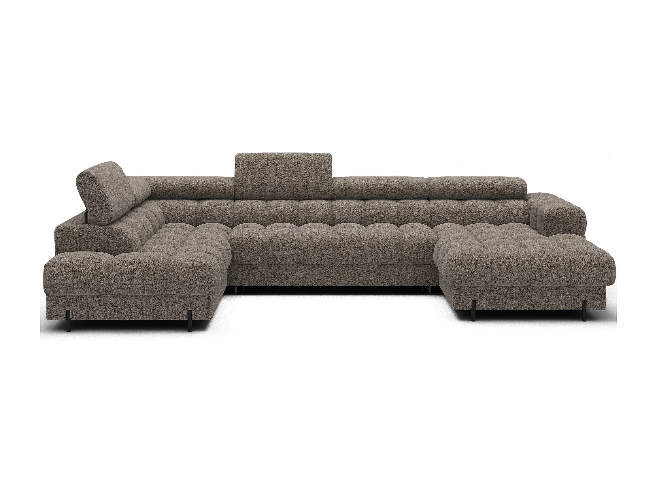 Grand canapé panoramique avec têtières réglables tissu FUZIAN – Fonction lit-Marron-Coffre à gauche