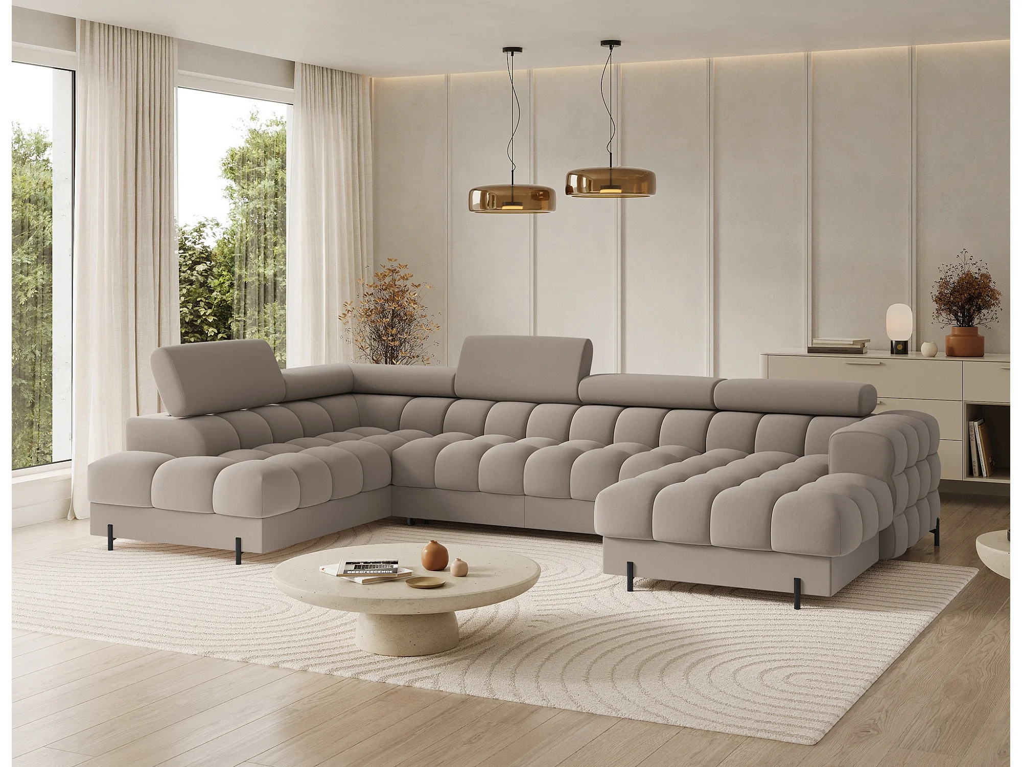 Grand canapé panoramique avec têtières réglables tissu FUZIAN – Fonction lit-Taupe-Coffre à gauche