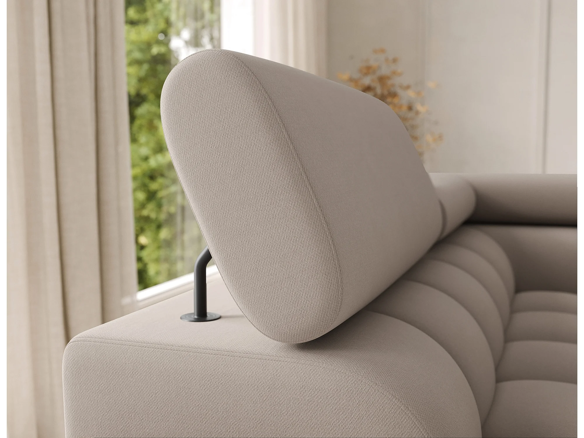 Grand canapé panoramique avec têtières réglables tissu FUZIAN – Fonction lit-Taupe-Coffre à droite