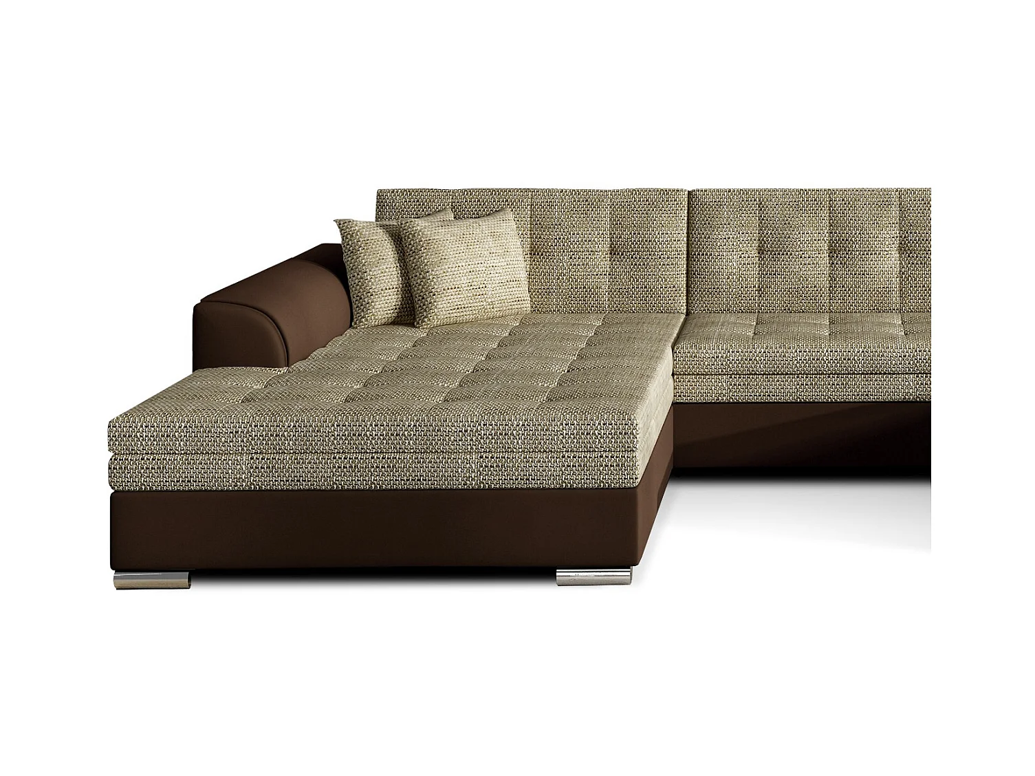 Grand canapé panoramique convertible tissu beige clair chiné et simili cuir marron Vira 359cm