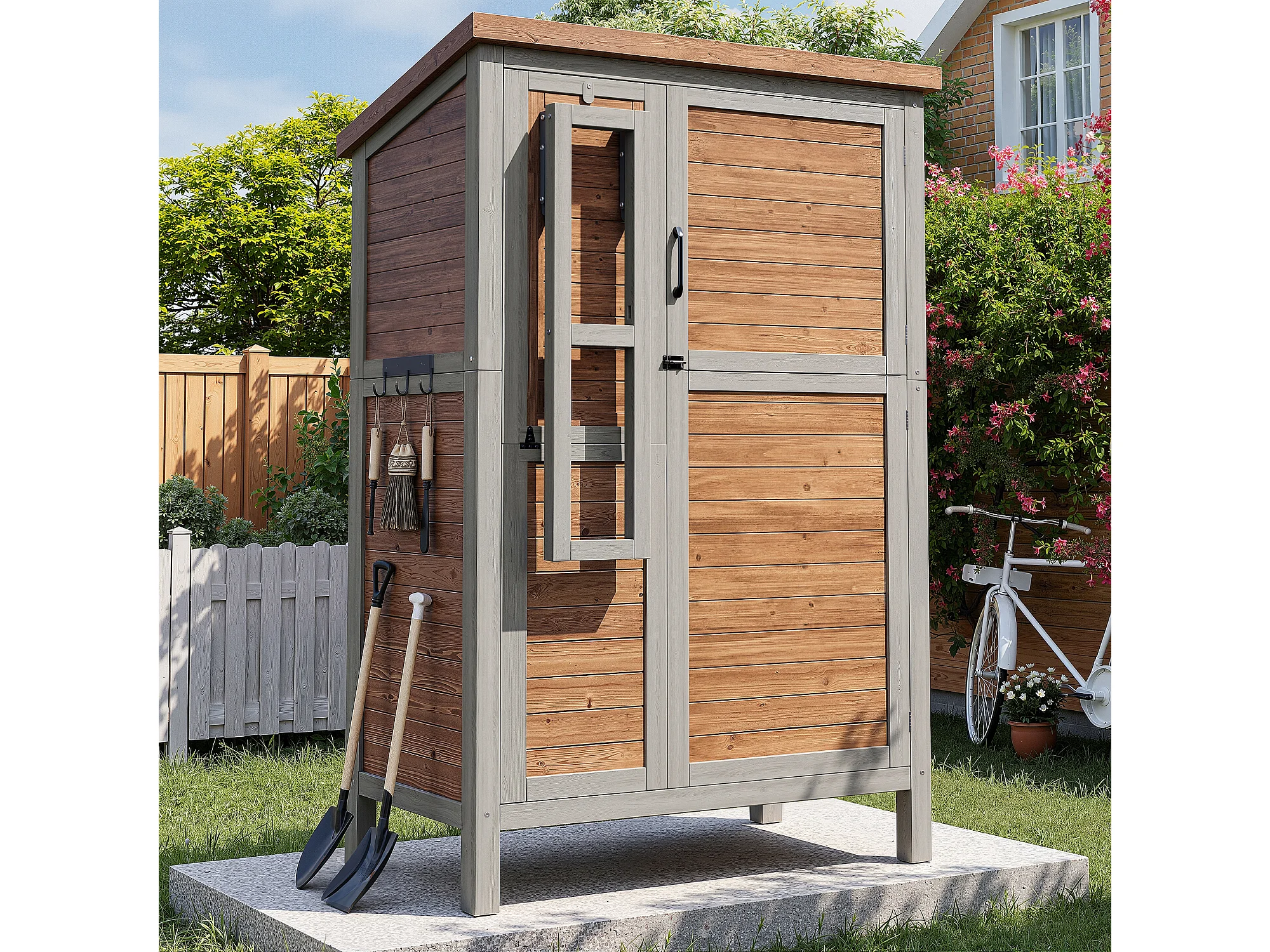 Grande Armoire de Jardin en Bois avec Tablette Pliable et Toit Bitumé - Abri à Outils Étanche avec Étagères Ajustables et Crochets - 86x46x160cm - Gris