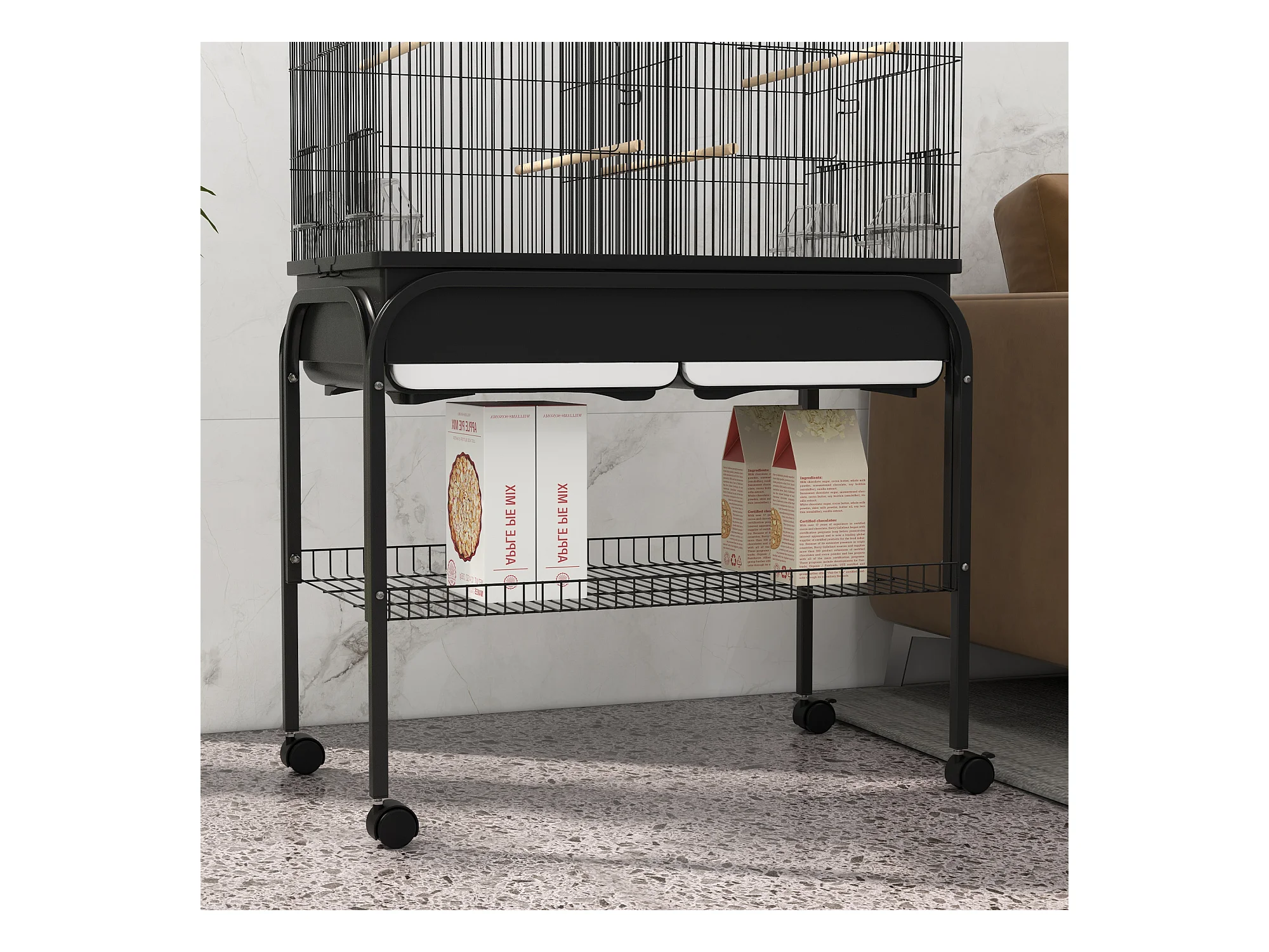 Cage à oiseaux sur roulettes - étagère, plateau déjection, 3 perchoirs, 4 mangeoirs, 2 portes, 8 trappes, accessoires - acier noir