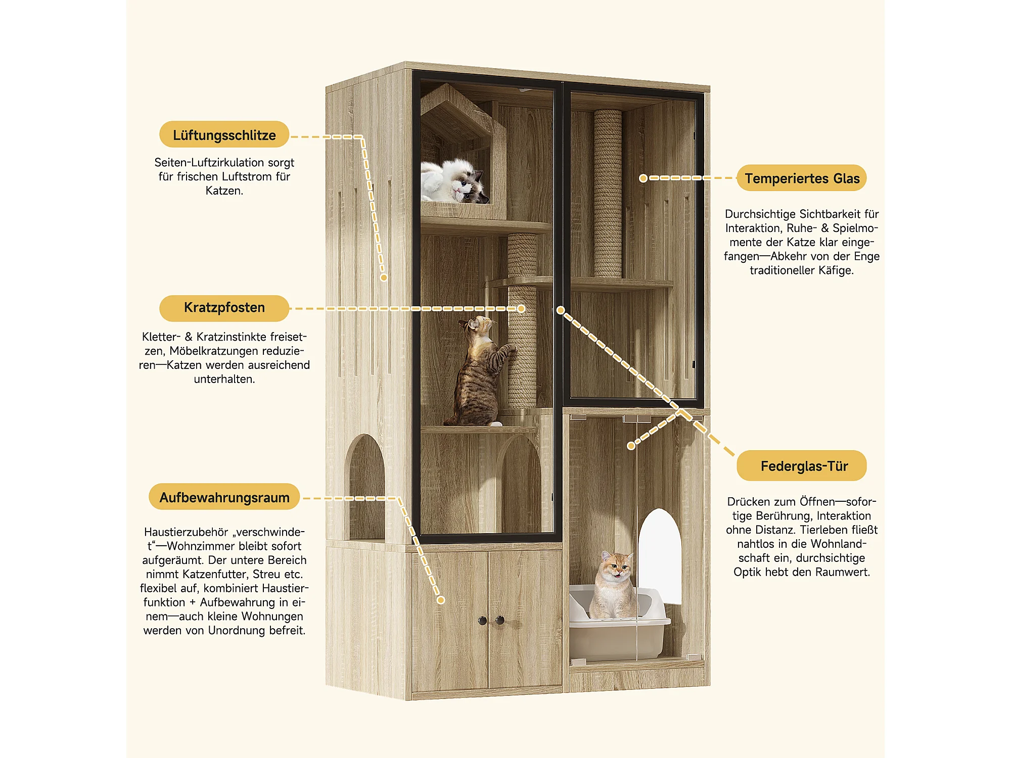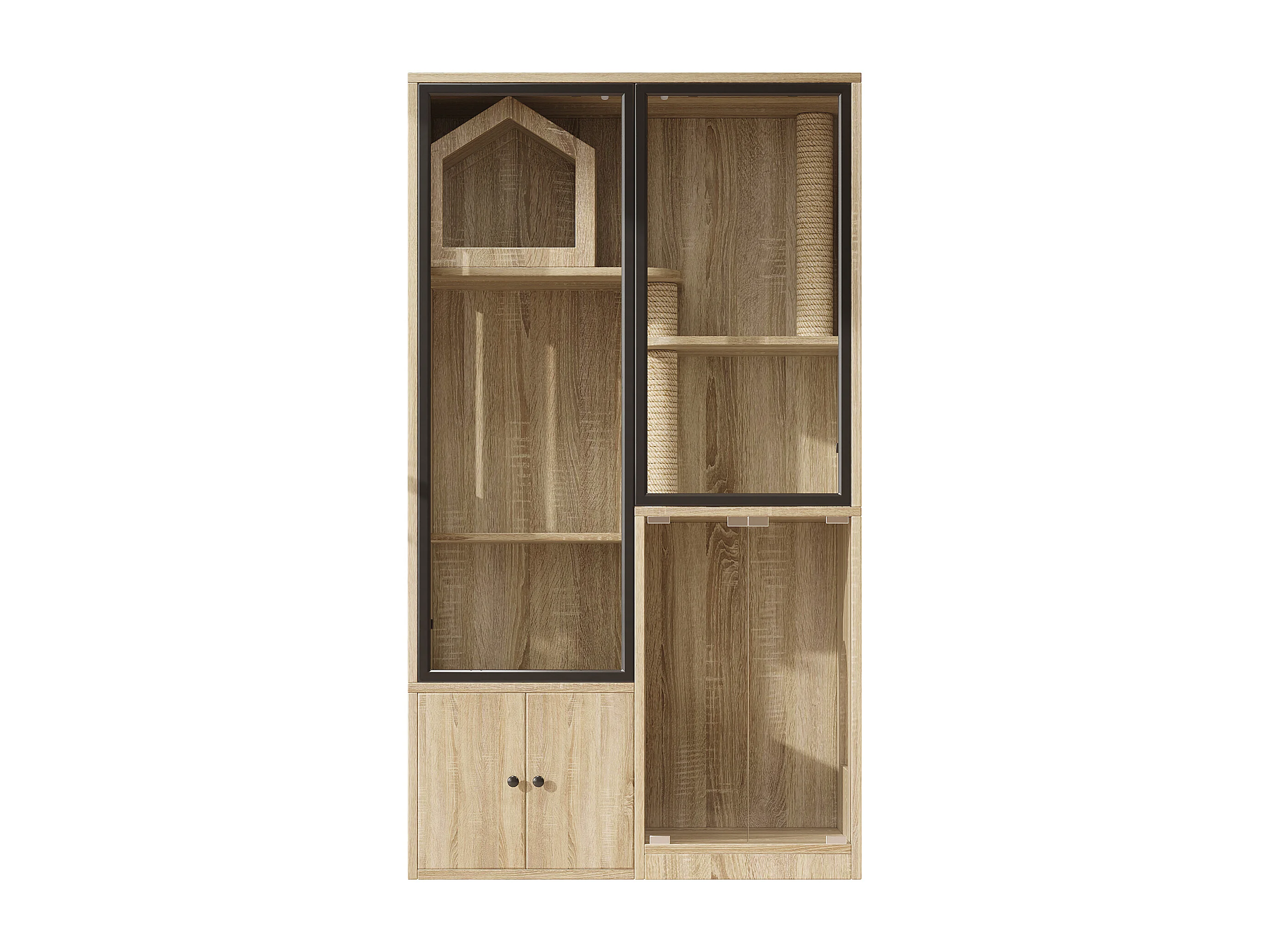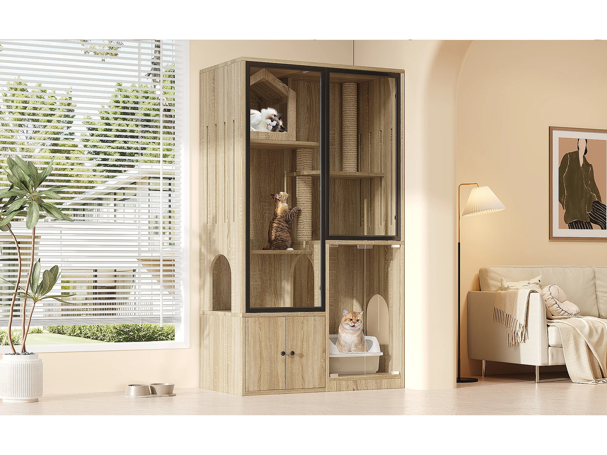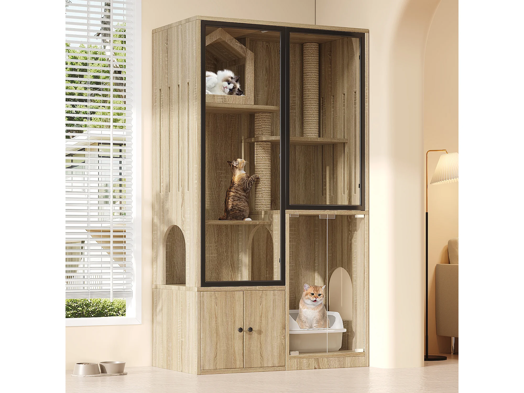 Grande maison pour chat 90x50x160cm - avec griffoir - 4 portes - naturel clair(sans bac à litière)