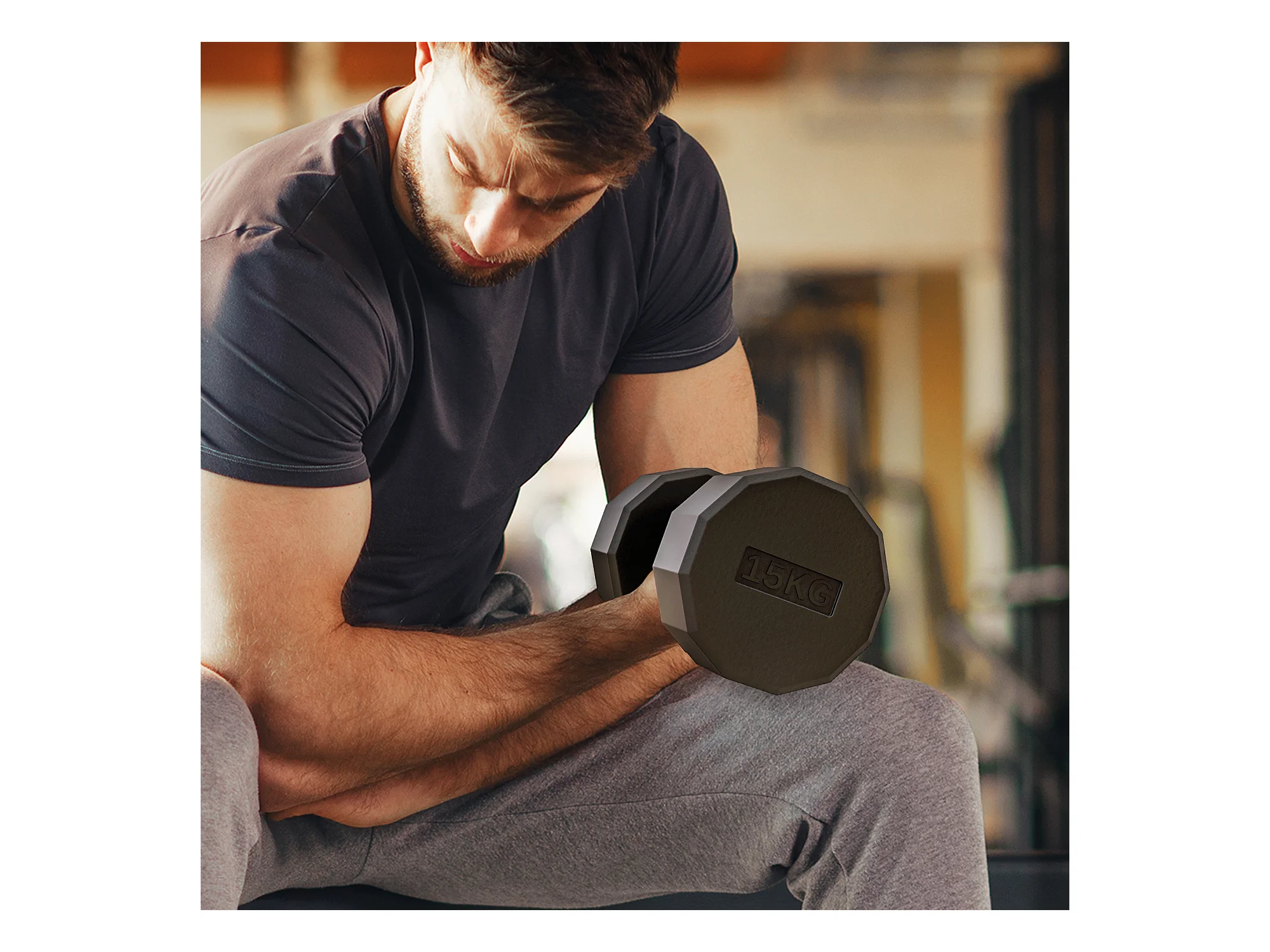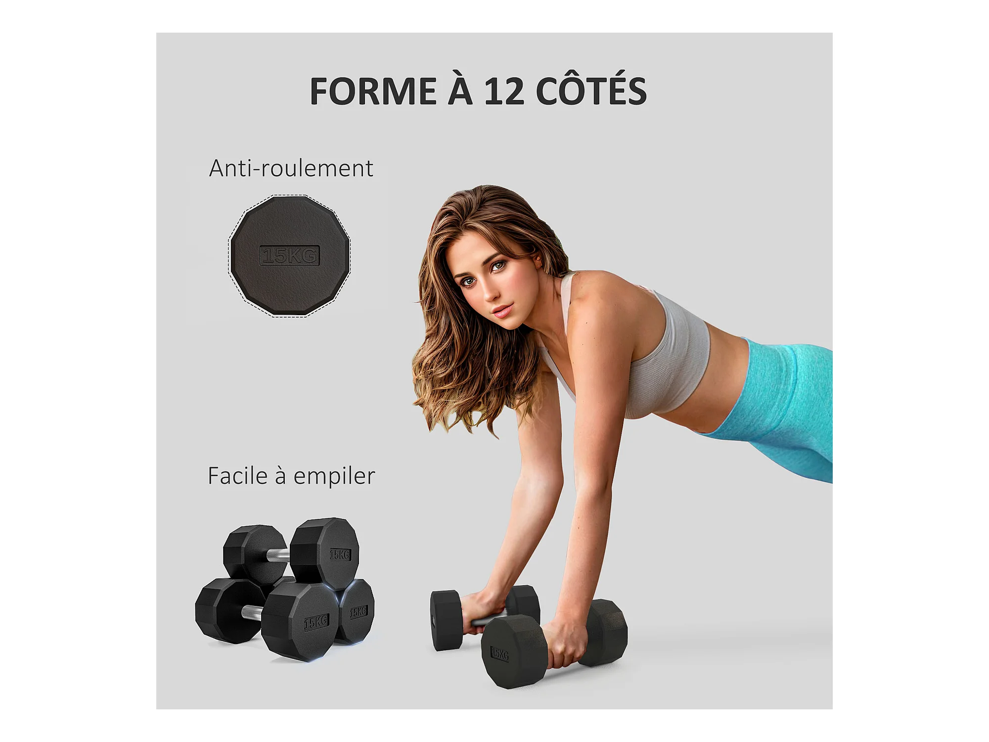 Haltère courte dodécagonale 15 Kg - poignée antidérapante - métal caoutchouc noir