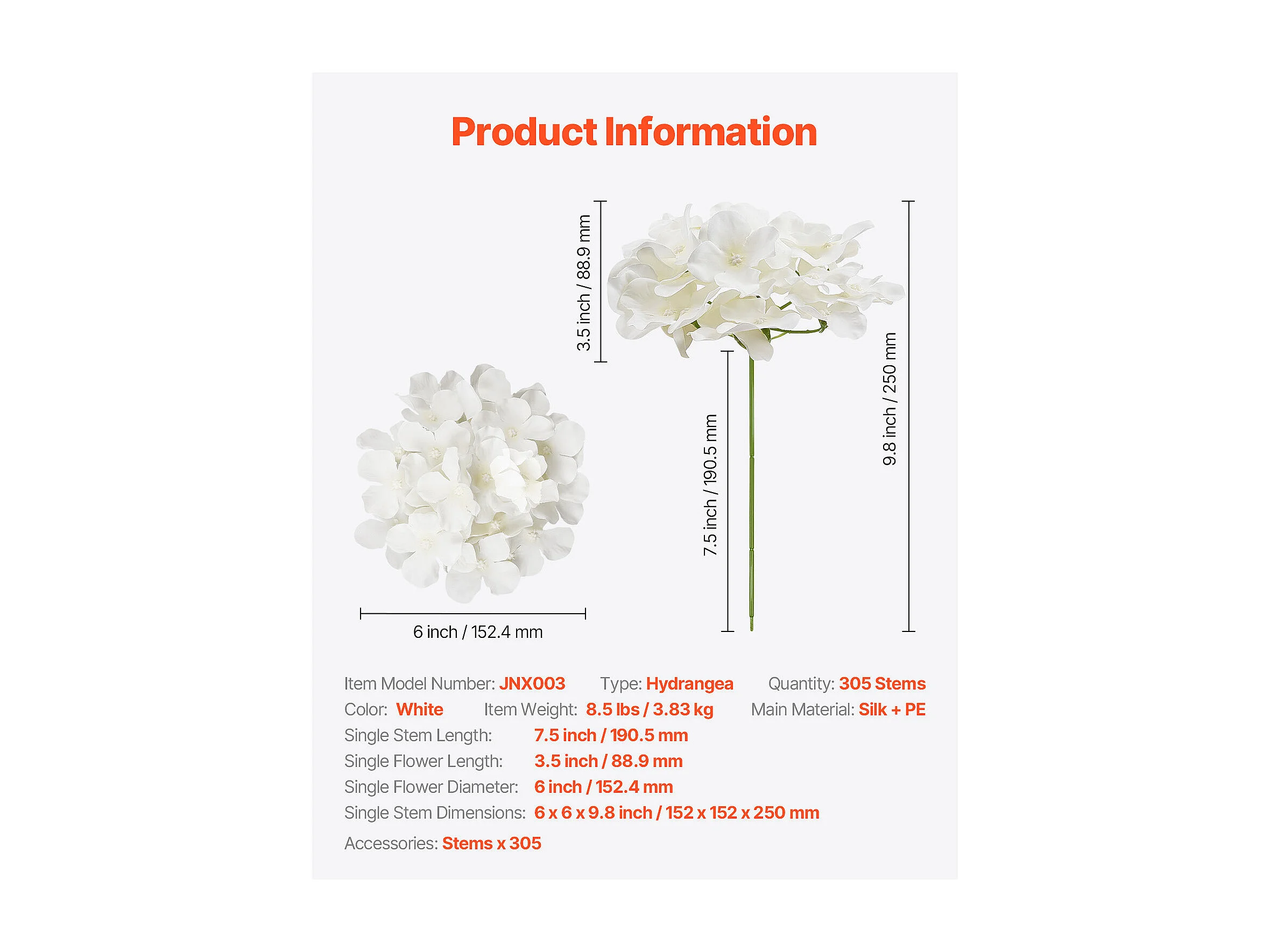 Hortensia Artificielle SucceBuy Fleurs Artificielles 250 mm, Bouquets de Fausses Fleurs Aspect Réaliste avec Tête 152,4 mm, Lot de 305, Blanc