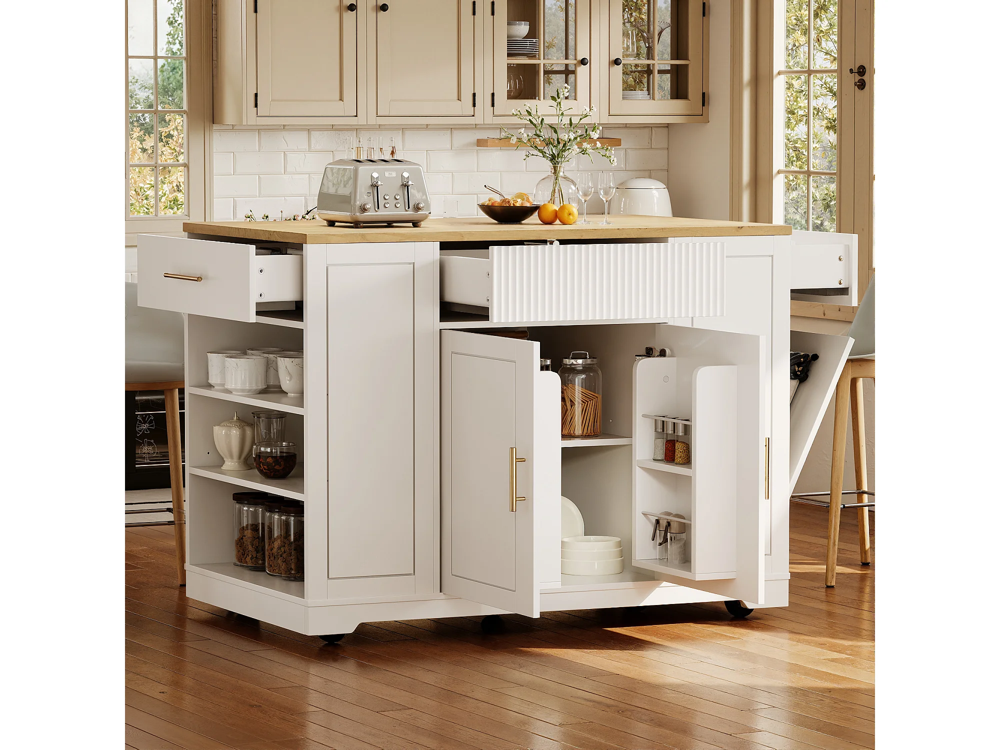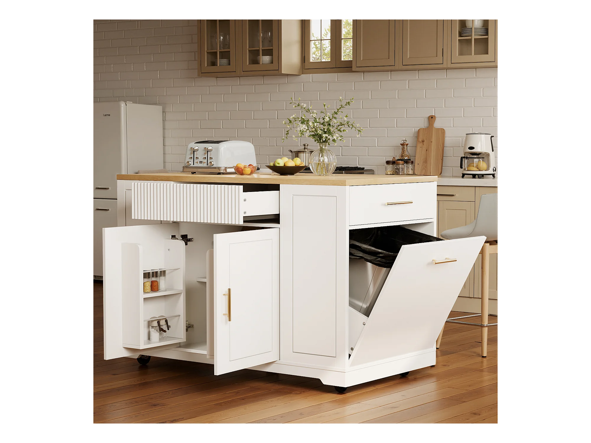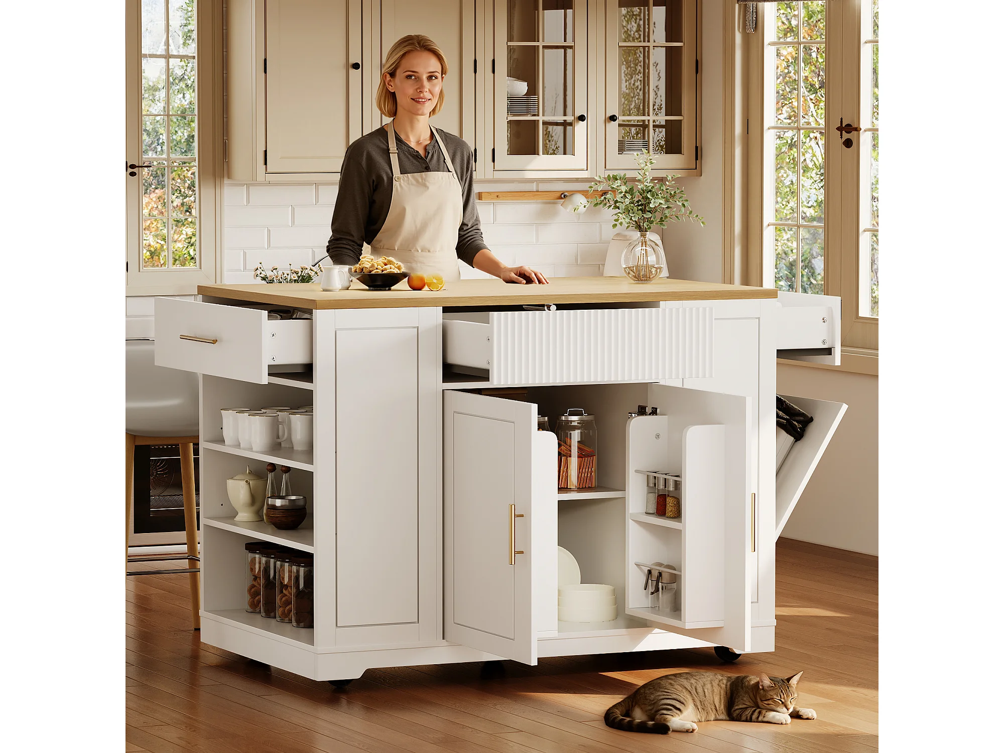 Îlot central à roulettes - 120 x 50 x 92 cm - avec compartiment poubelle + 2 portes et 3 tiroirs - MDF + Métal - blanc