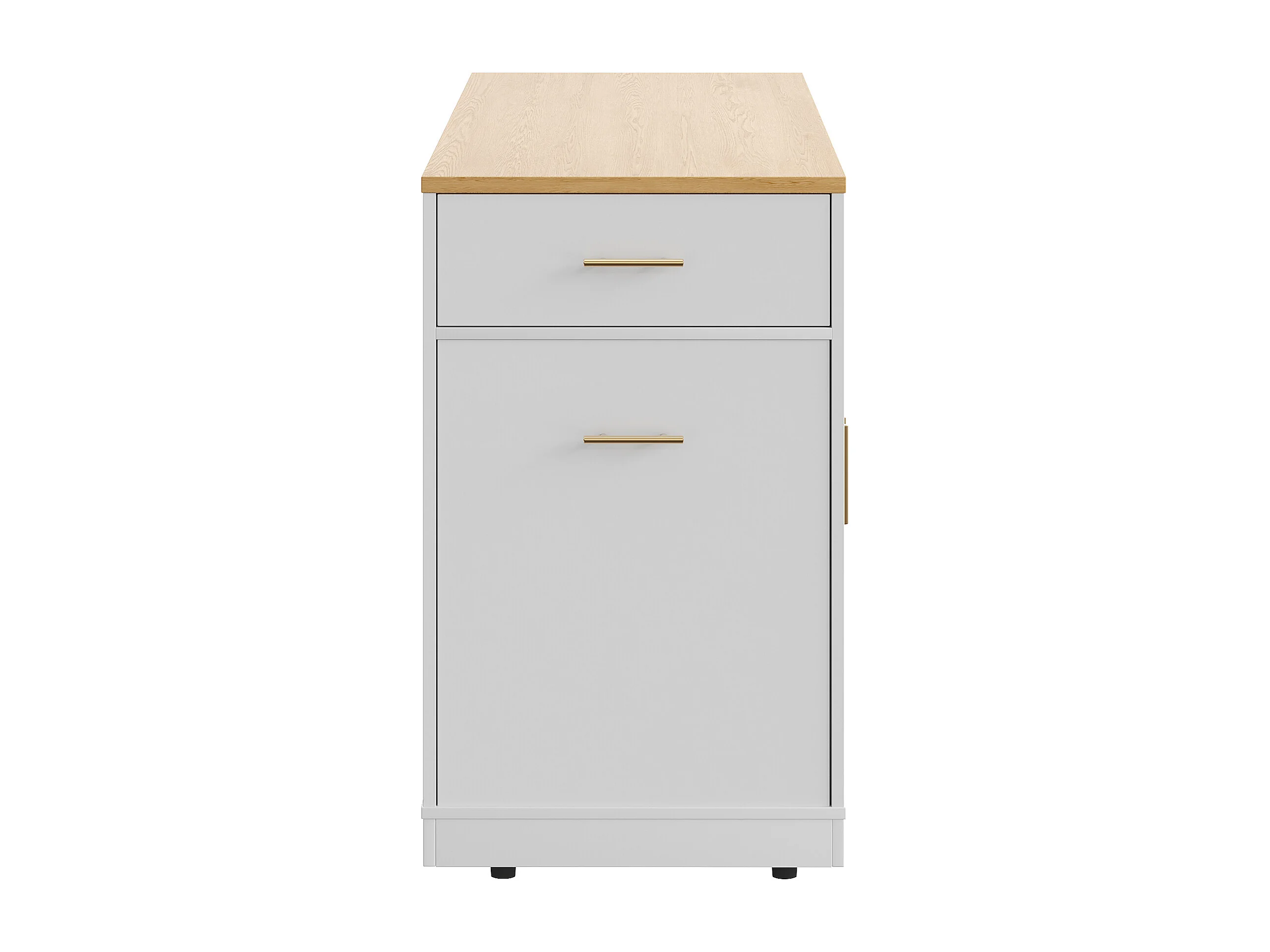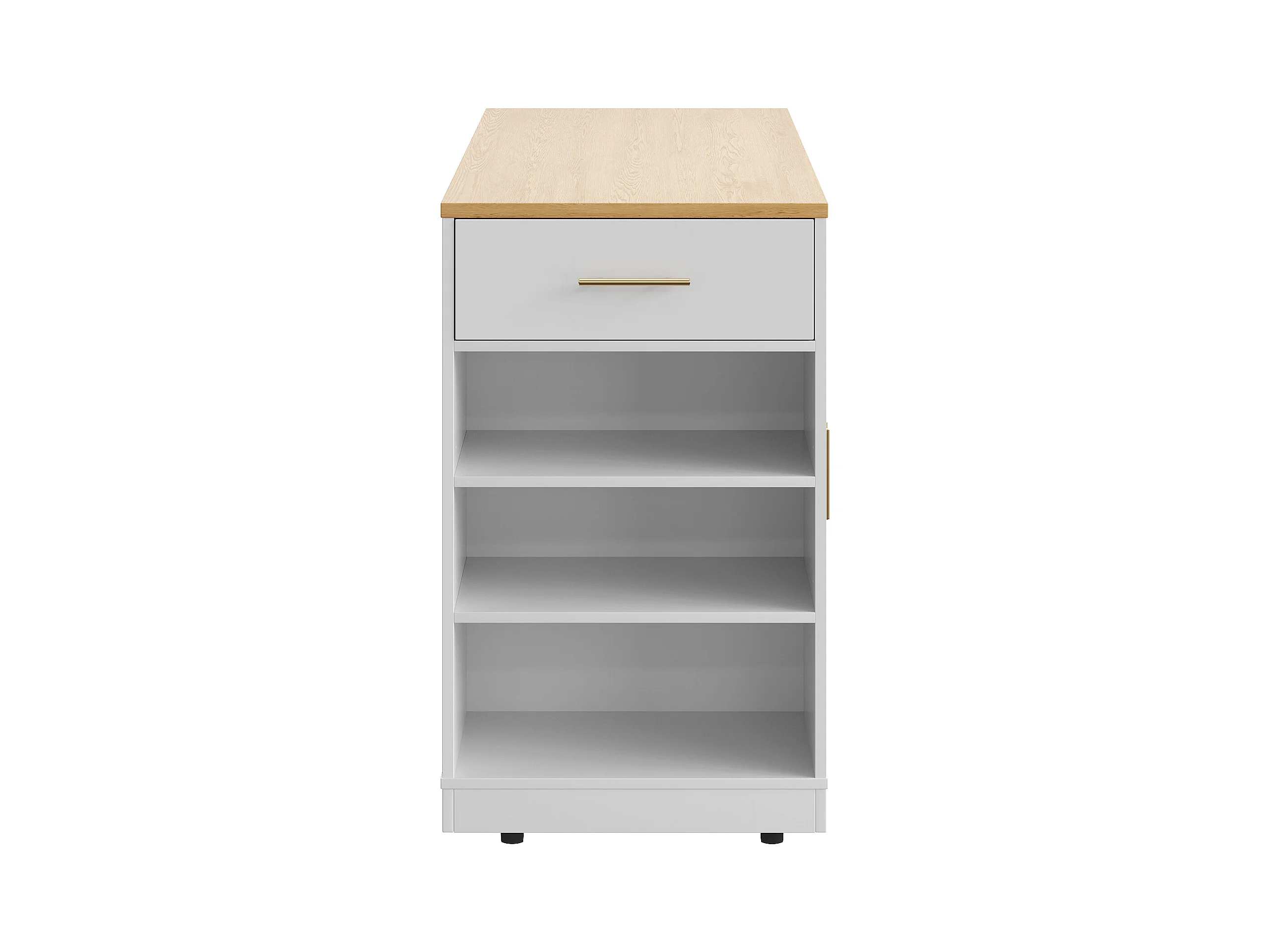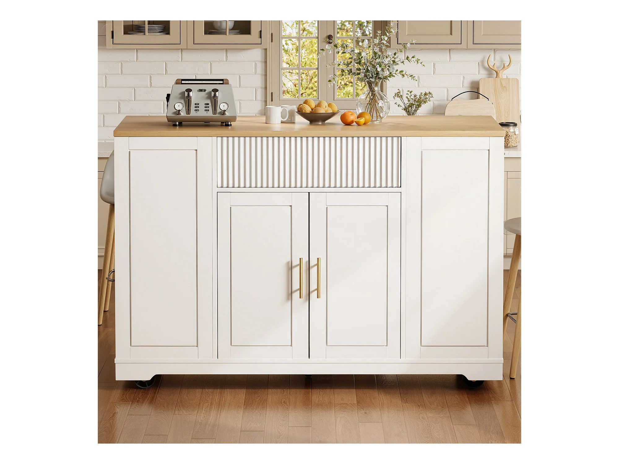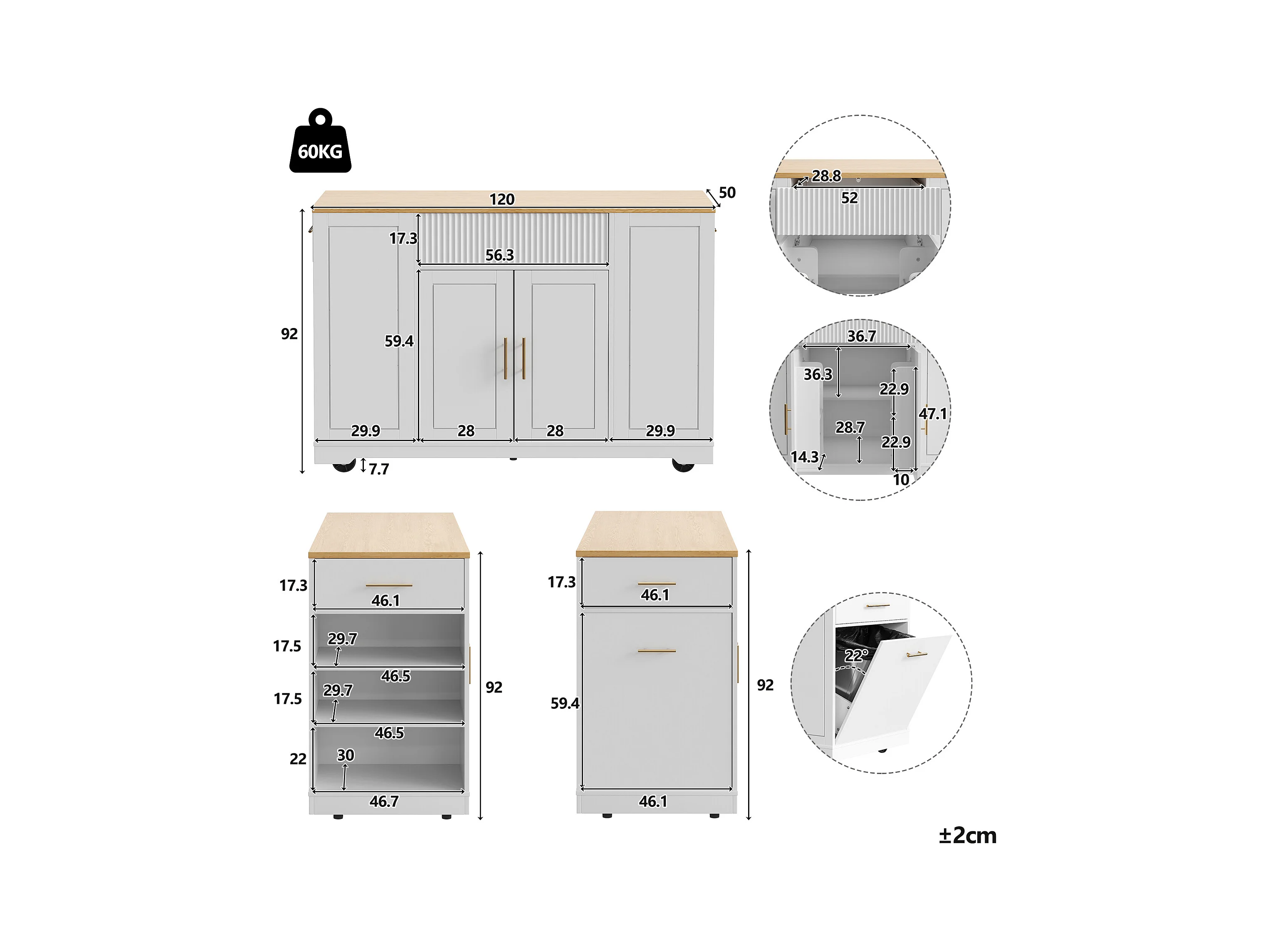 Îlot central à roulettes - 120 x 50 x 92 cm - avec compartiment poubelle + 2 portes et 3 tiroirs - MDF + Métal - blanc