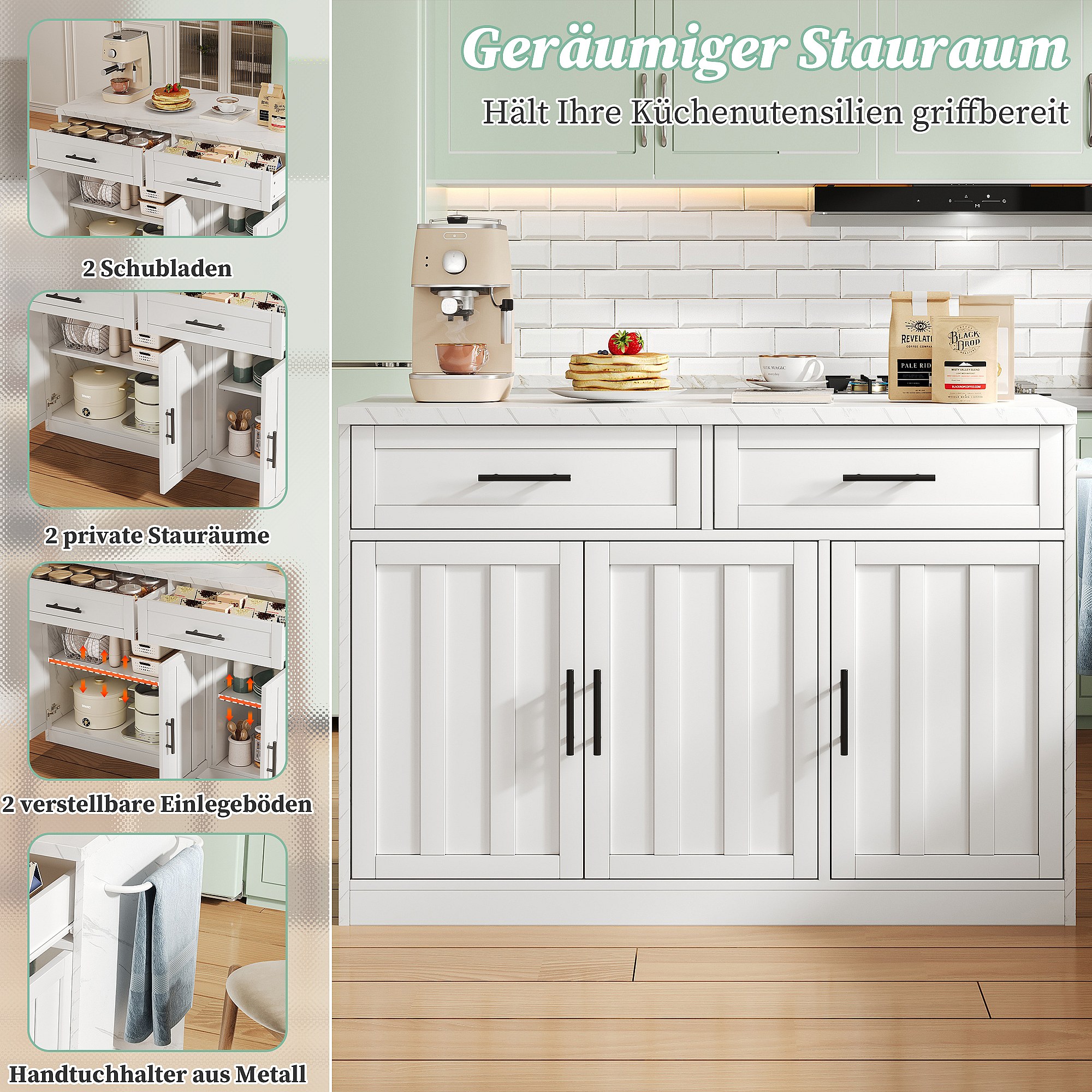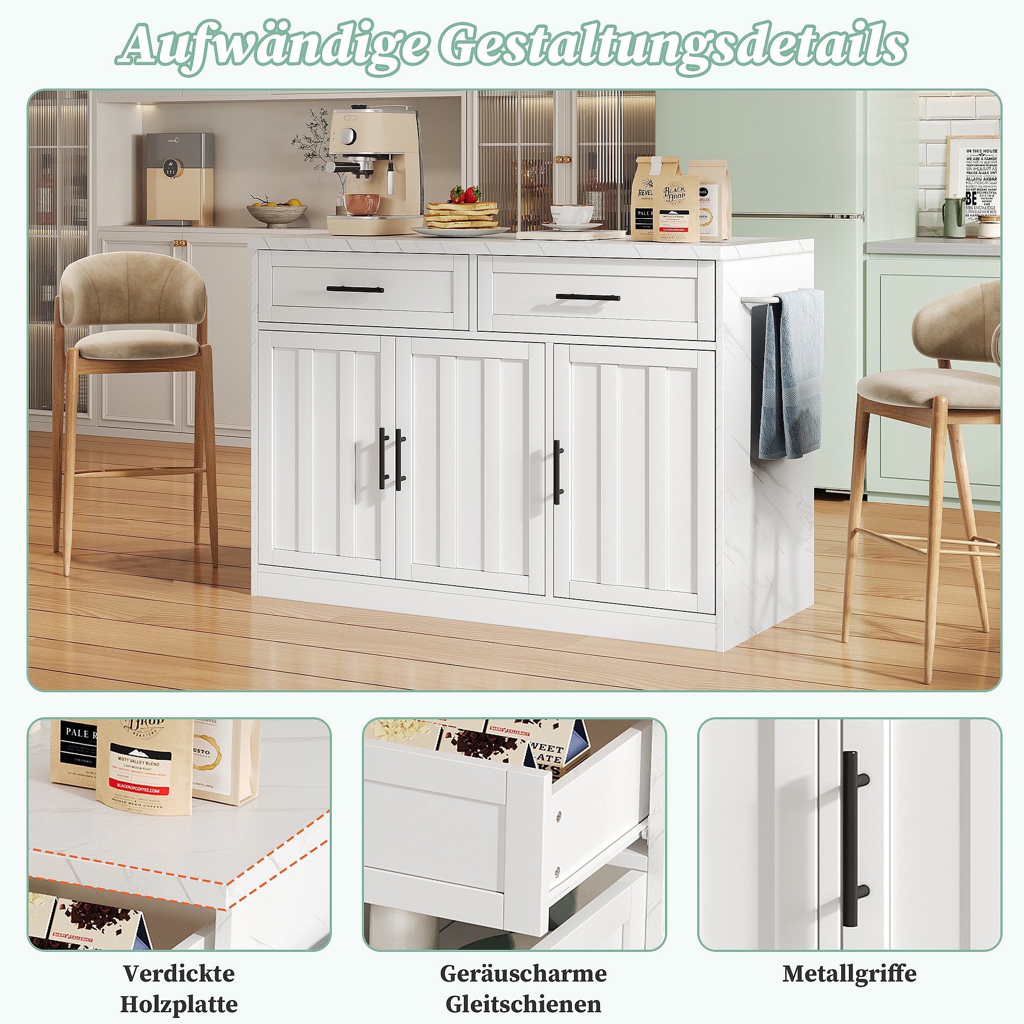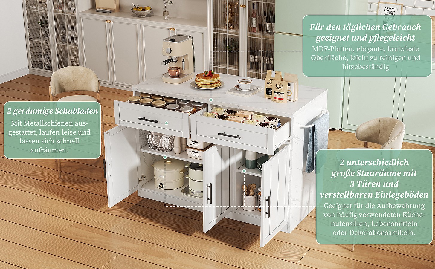 Îlot central mobile avec plan de travail extensible + 2 tiroirs + 4 portes - 136 x 45/70 x 92 cm - MDF - blanc