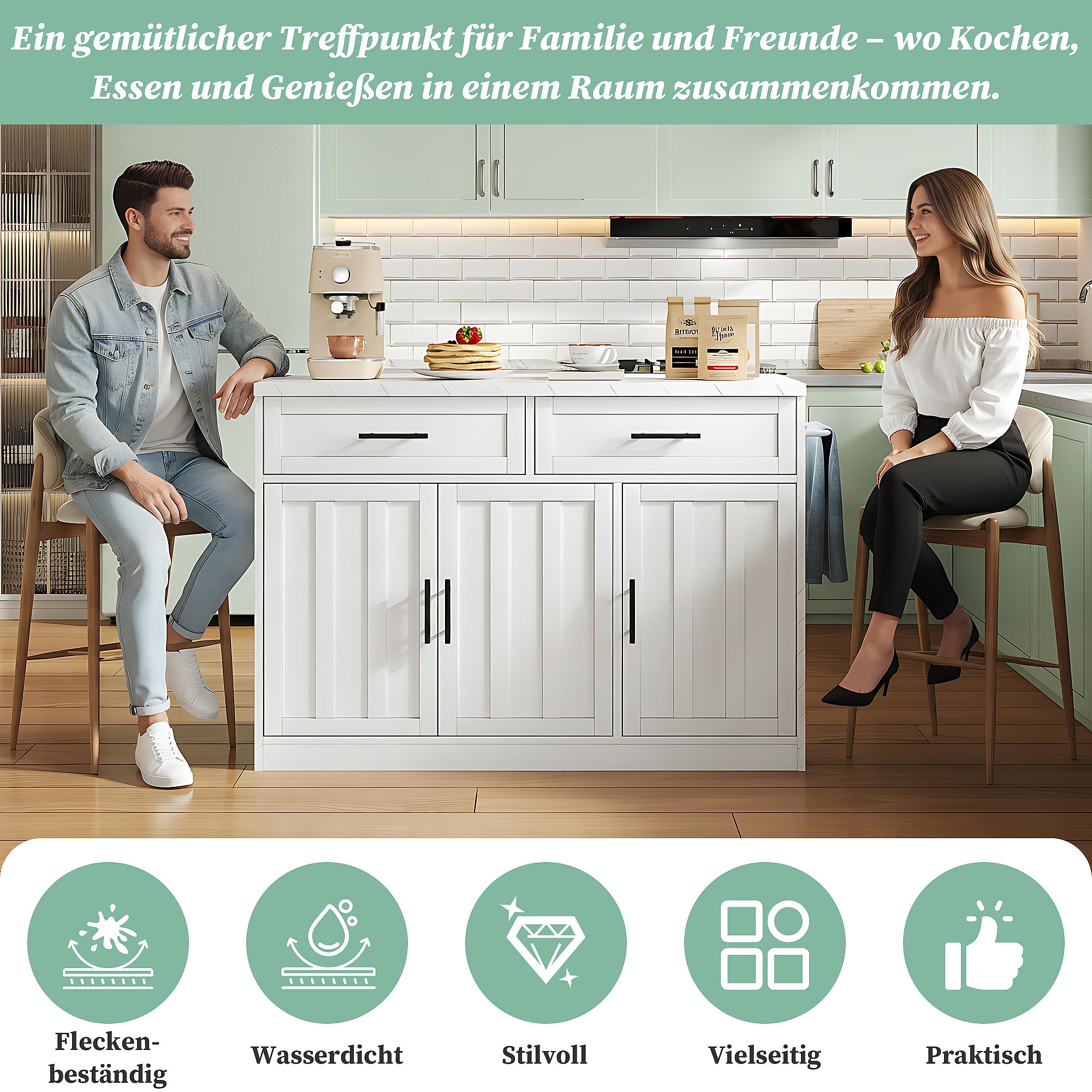 Îlot central moderne - 134 x 45.2/ 75 x 89 cm - avec roulettes + 2 portes + 2 tiroirs - MDF + Métal - blanc
