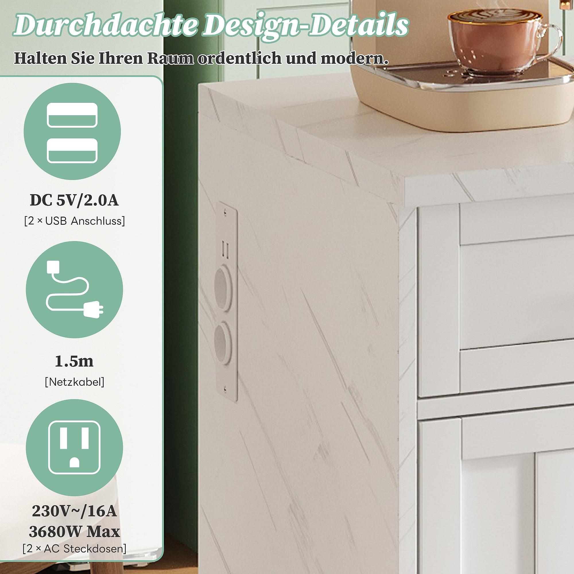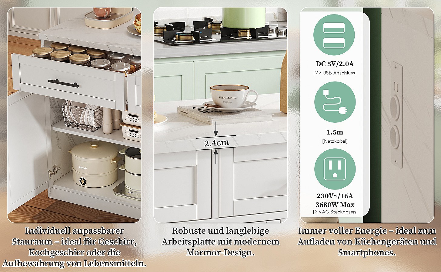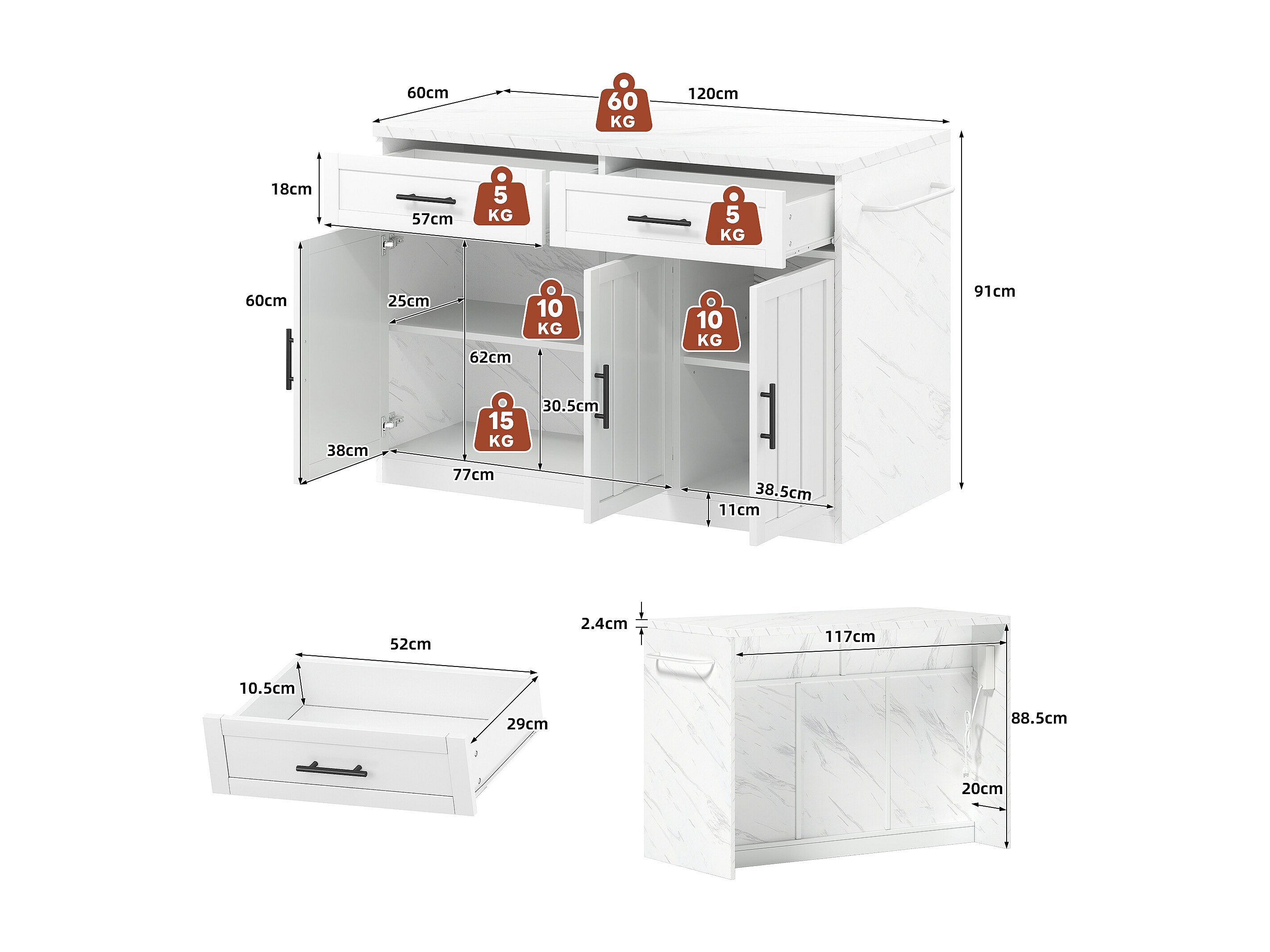 Îlot central de cuisine avec 3 portes + 2 tiroirs - 120 x 60 x 91 cm - avec prises + USB - MDF - blanc