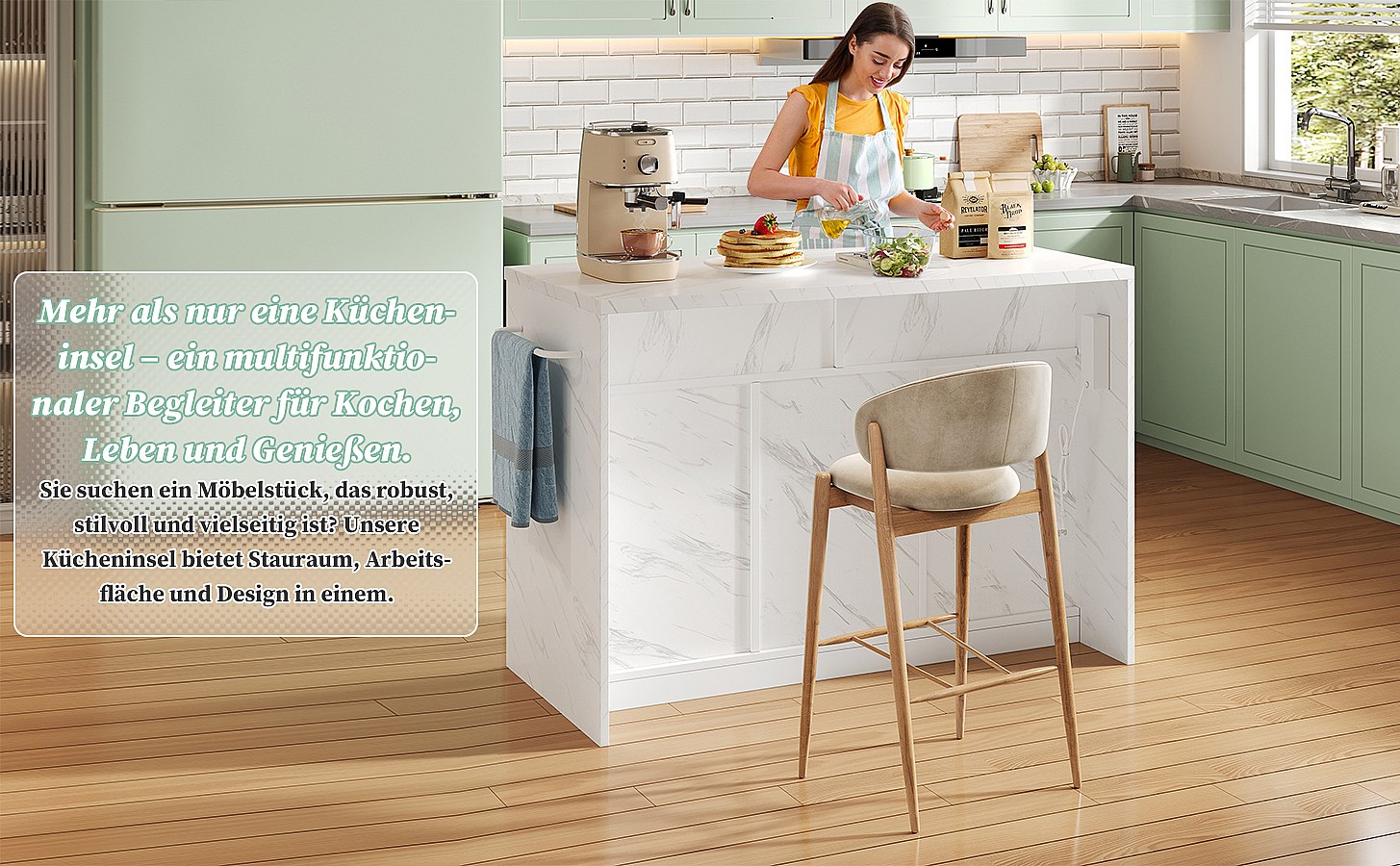 Îlot central - 120 x 46 (70) x 91 cm - plateau rabattable + roulettes et pieds interchangeables - MDF - blanc