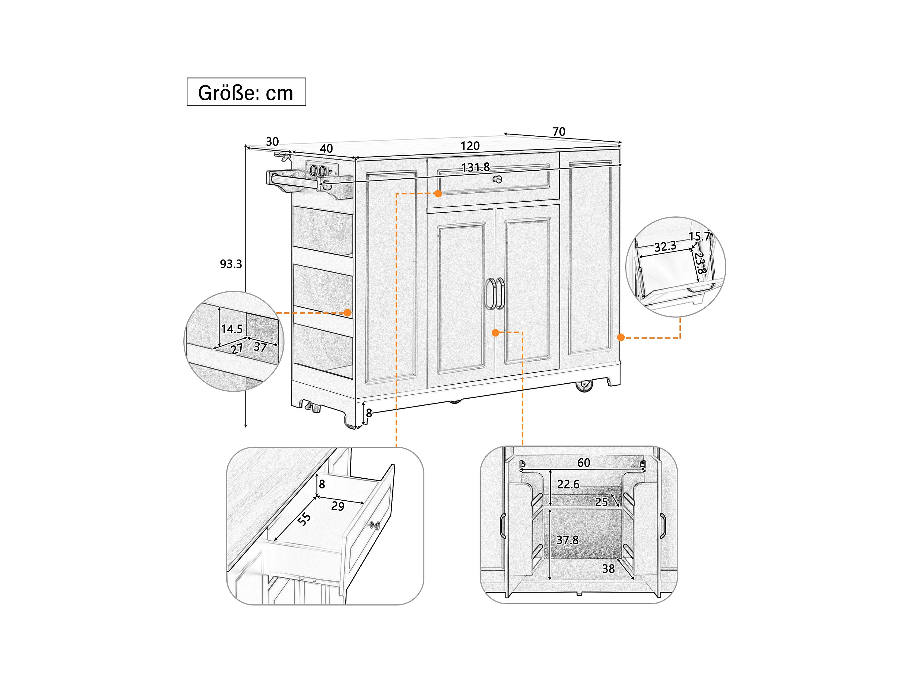 Ilot central de cuisine mobile 120x40-80x92cm - avec roulettes - avec USB - 2 tiroirs et 2 portes - plateau extensible - avec porte-serviettes - blanc