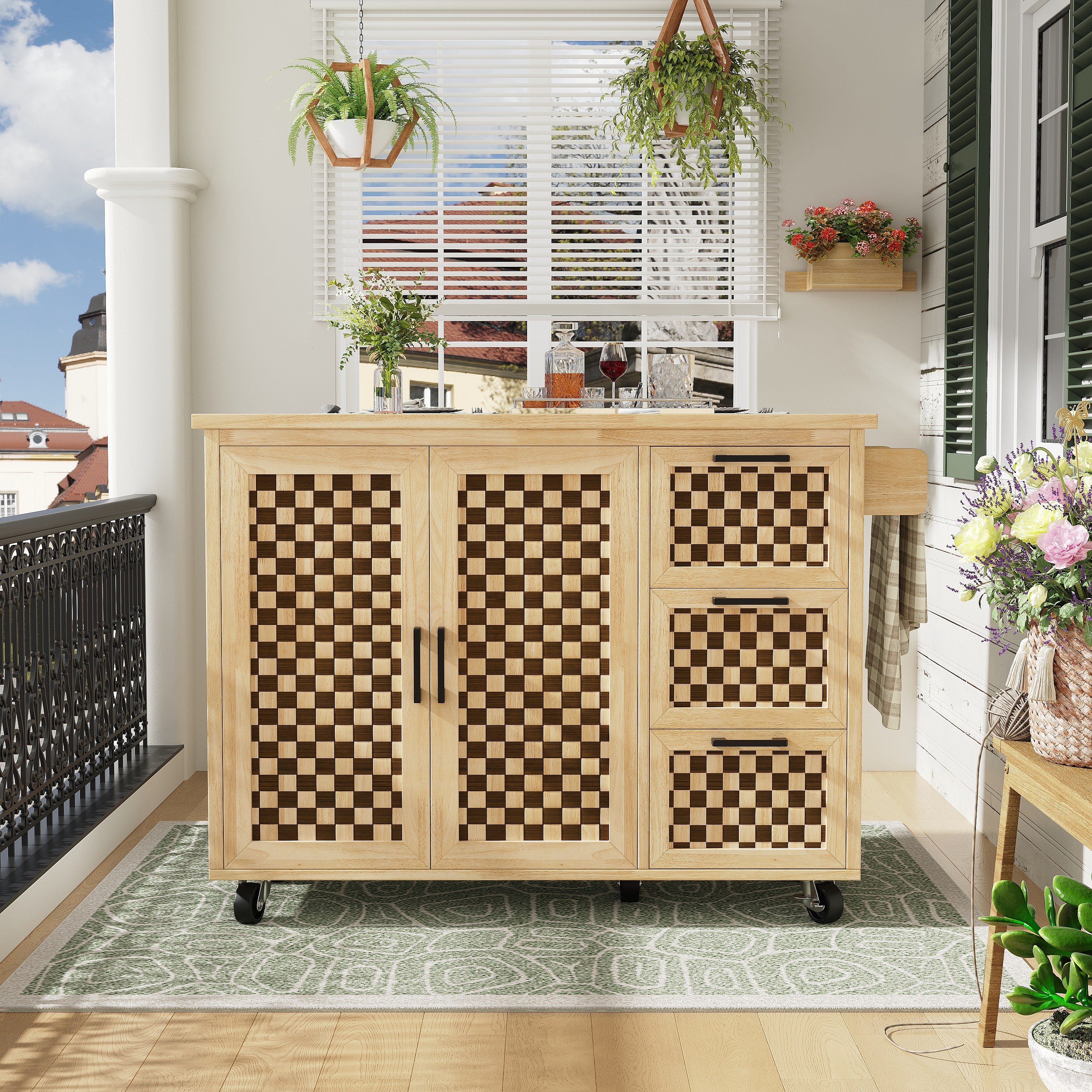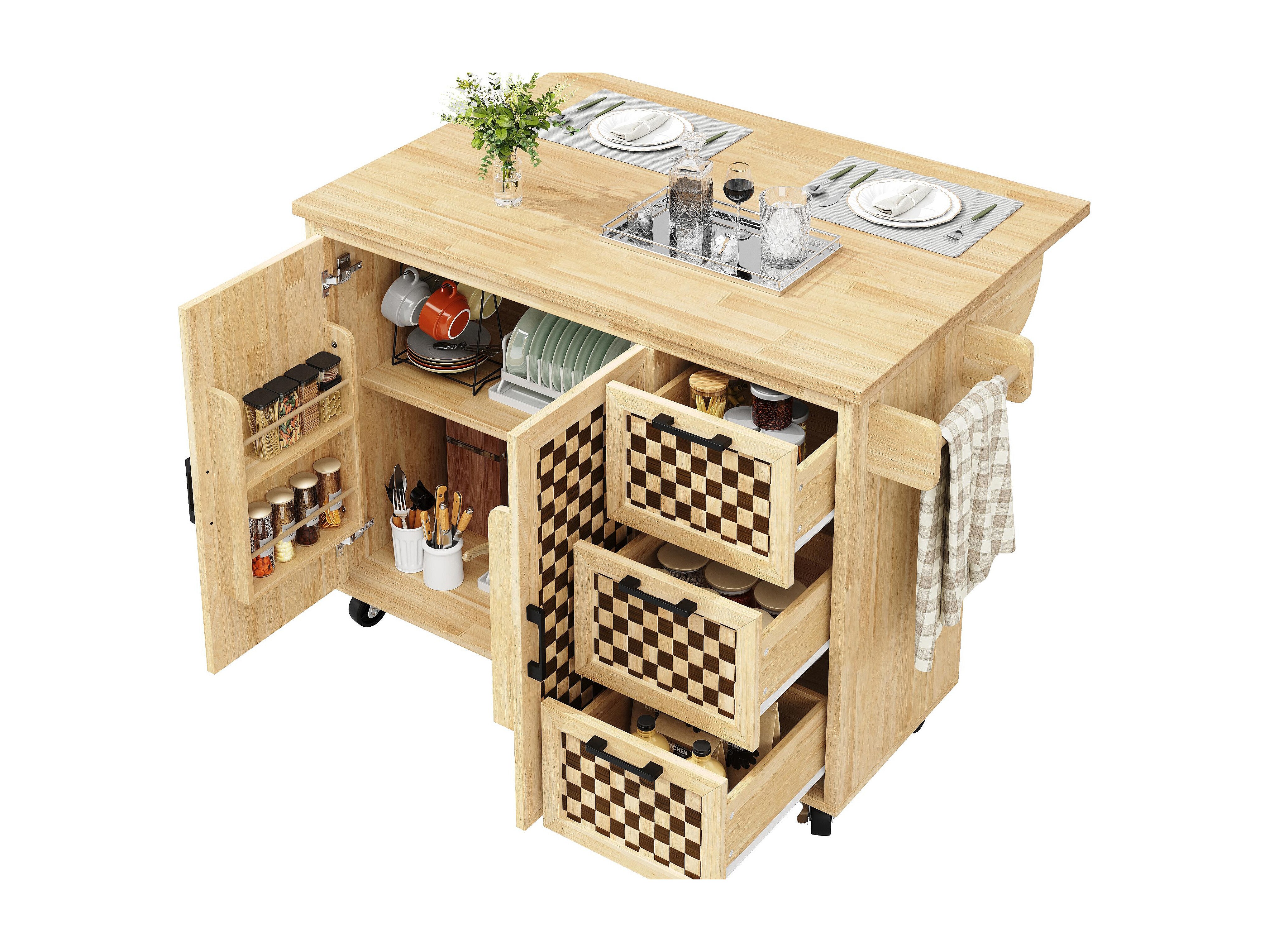 Ilot central de cuisine mobile - Plateau extensible - 120x45x92cm - 2 portes - avec porte-serviettes - MDF - décoration en treillis - Naturel