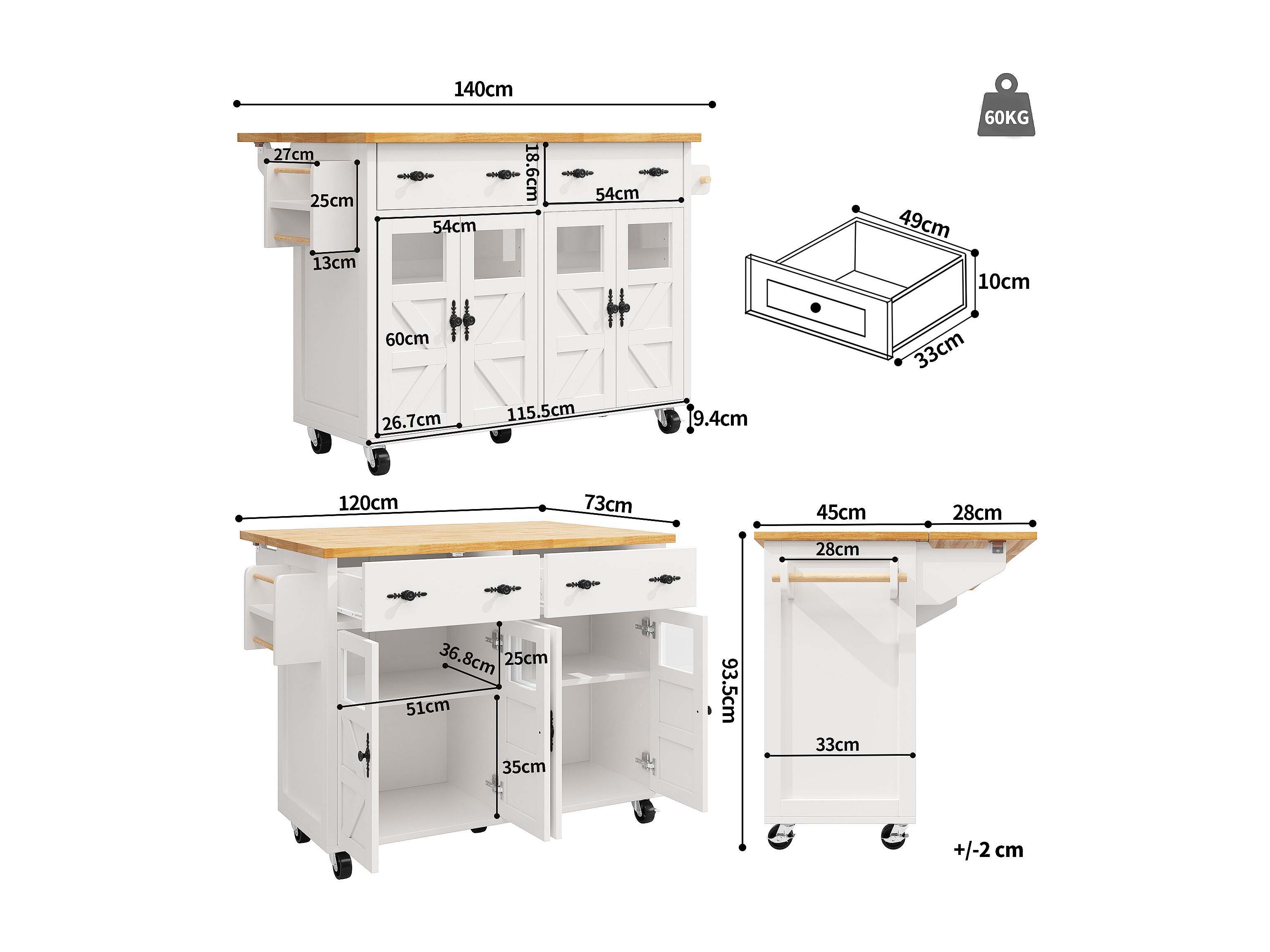 Ilot central de cuisine mobile - Plateau extensible - 140x73x93.5cm - 2 tiroirs et 4 portes - étagères ouvertes - avec porte-serviettes - MDF - Blanc