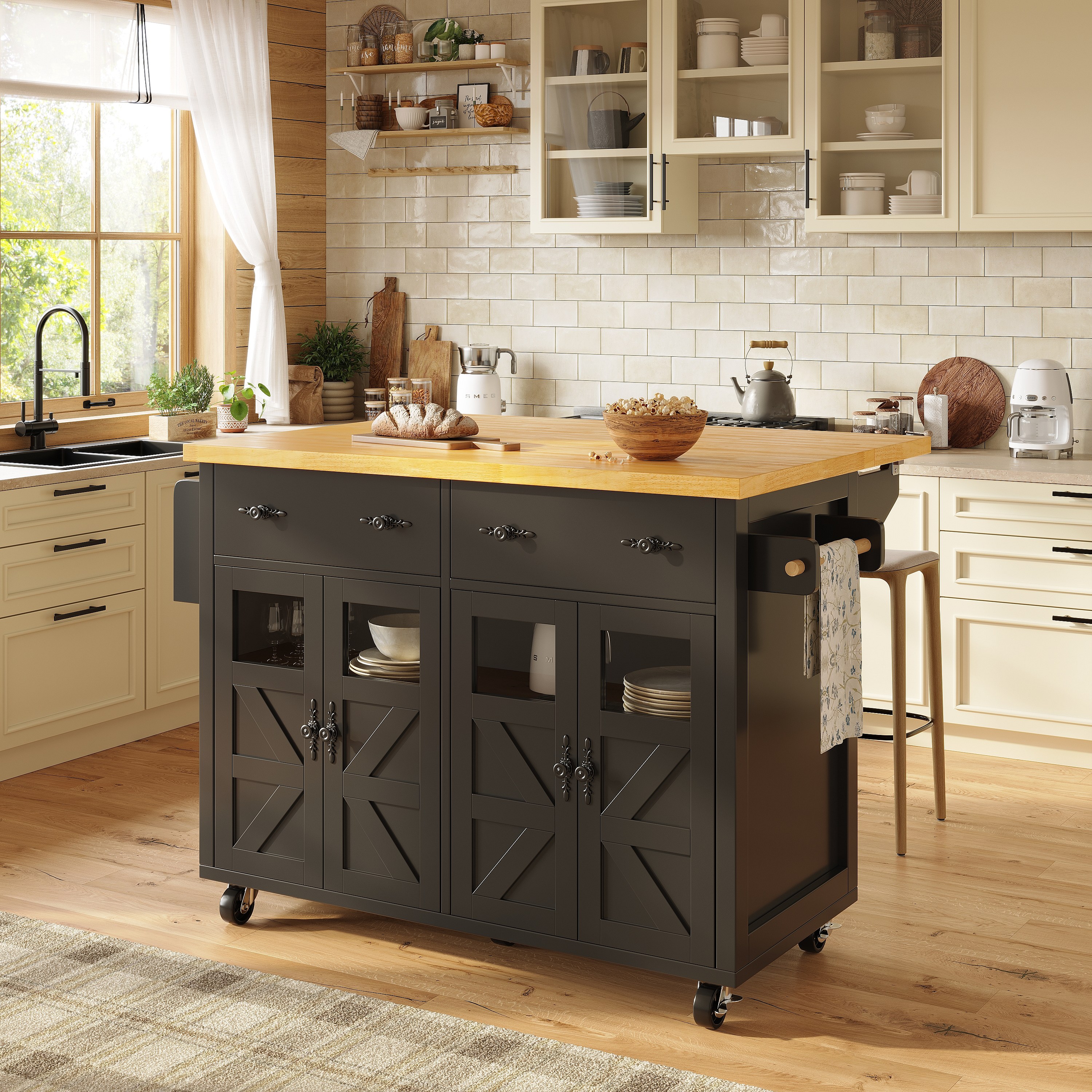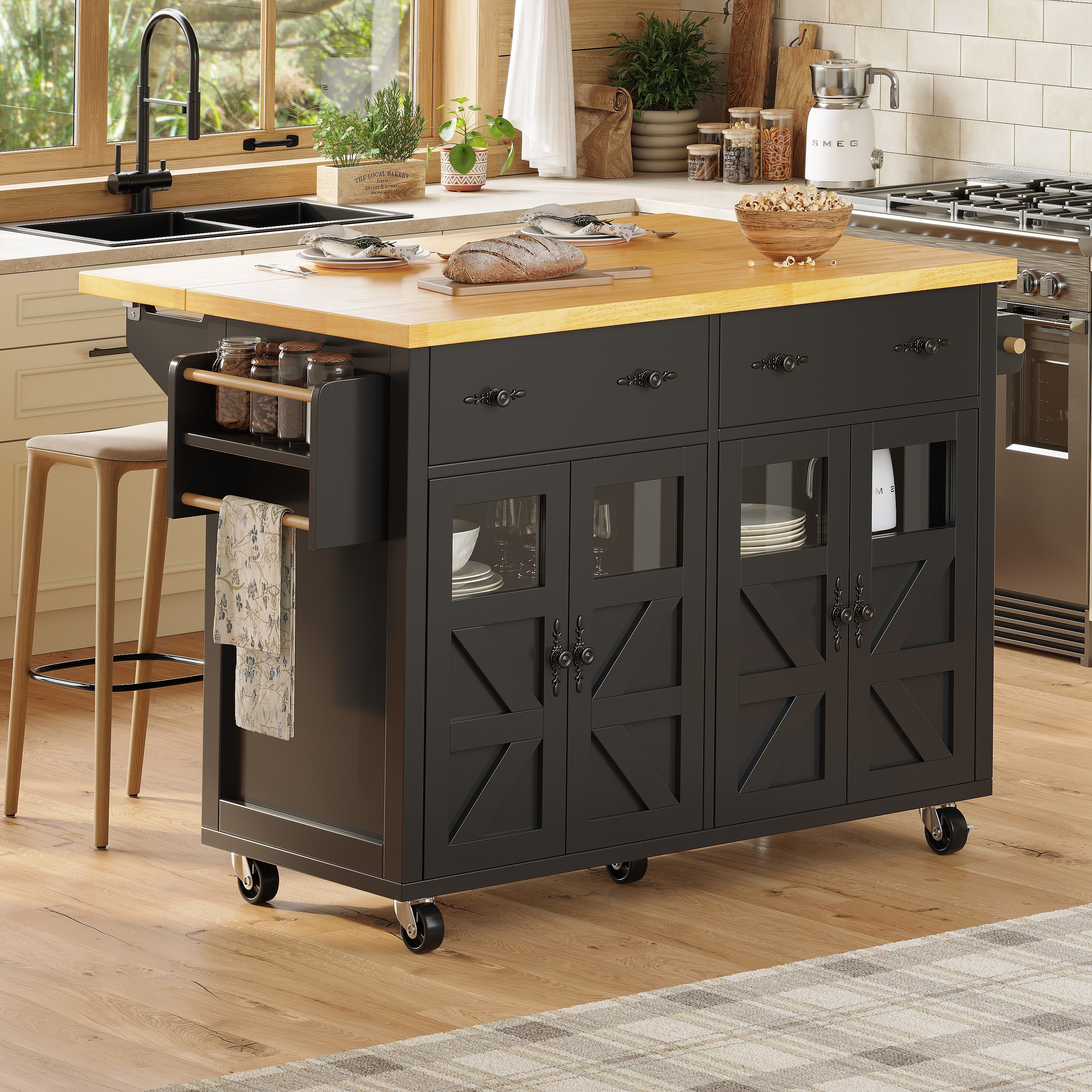 Ilot central de cuisine mobile - Plateau extensible - 140x73x93.5cm - 2 tiroirs et 4 portes - étagères ouvertes - avec porte-serviettes - MDF - Noir