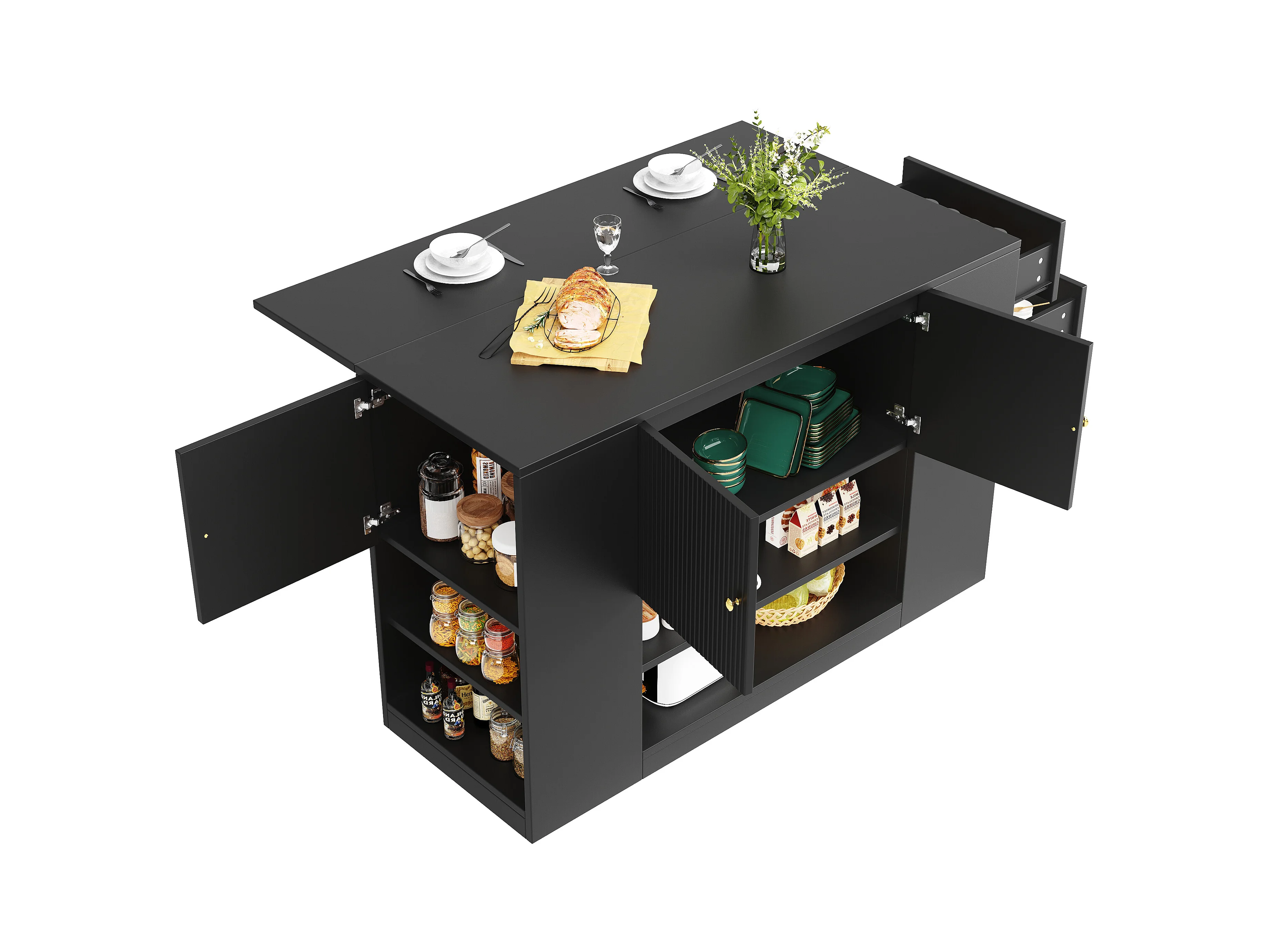 Ilot central de cuisine - Plateau extensible - 2 tiroirs et 3 portes - Avec des étagères ouvertes - MDF - Noir