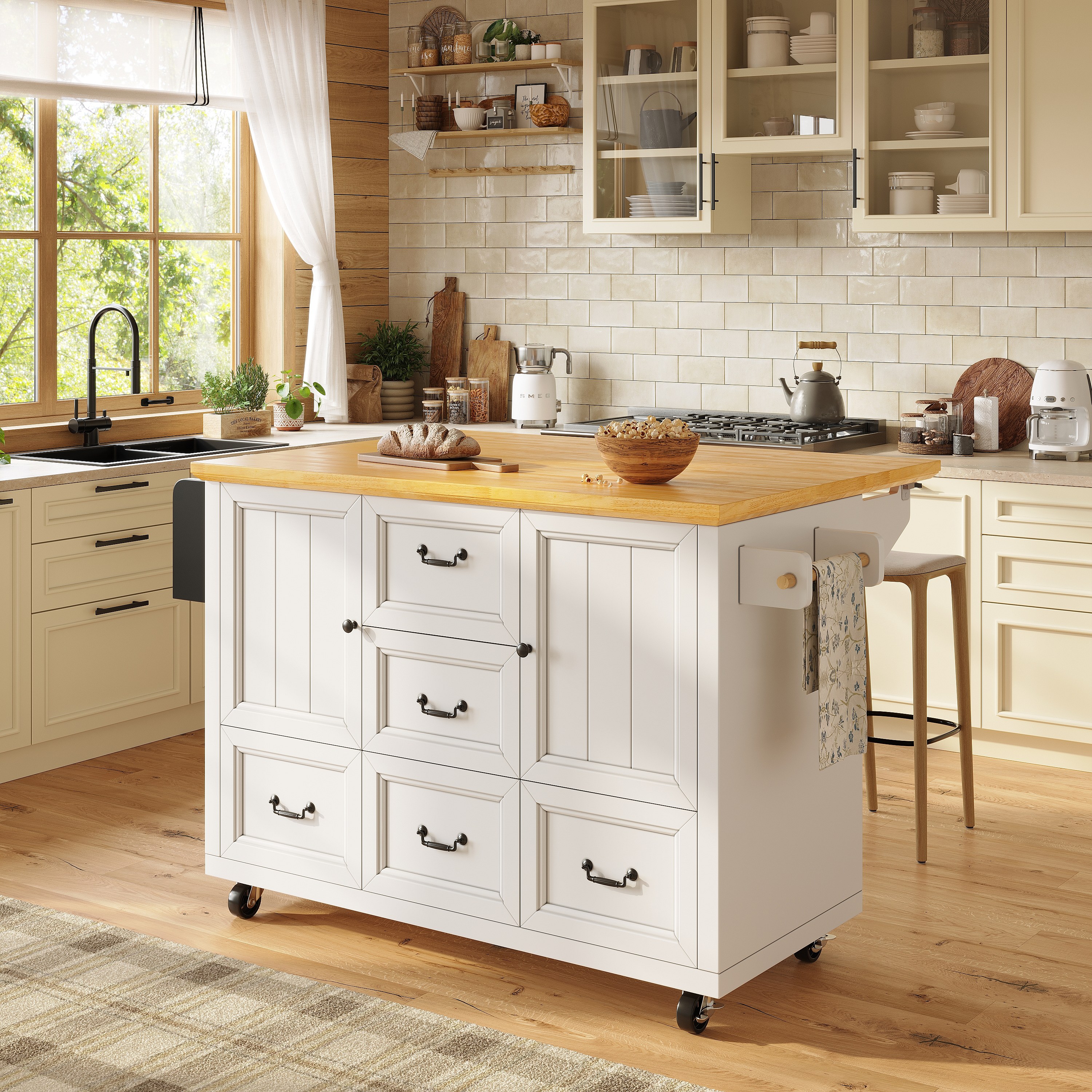 Îlot central à roulettes - 126 x 44/74 x 94 cm - plan pliable - avec 3 portes + 3 tiroirs - MDF - blanc