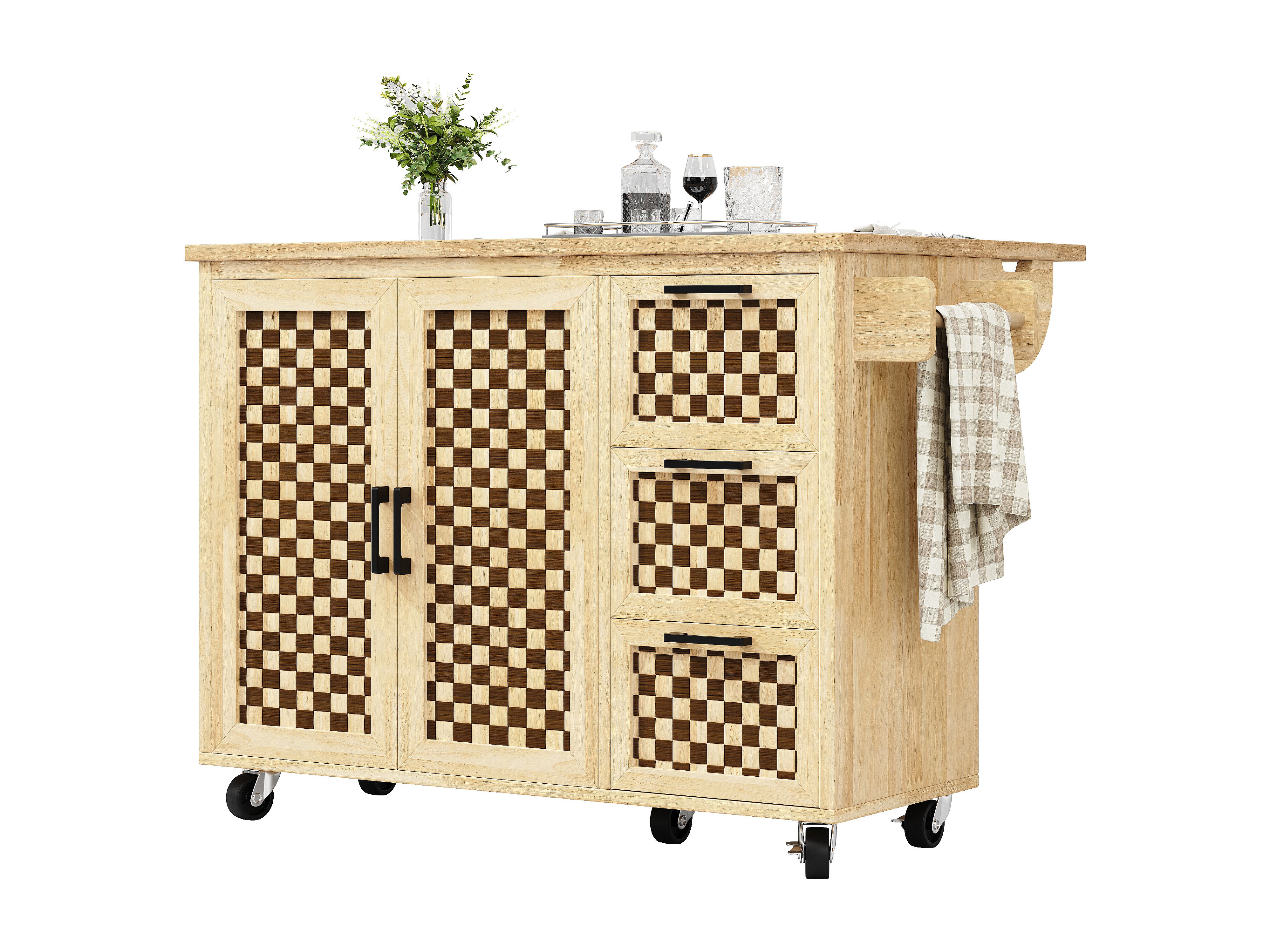 Ilot central de cuisine avec 3 tiroirs et 2 portes en MDF - porte-serviette - 5 roulettes - Beige - 140x45/73x92.5cm