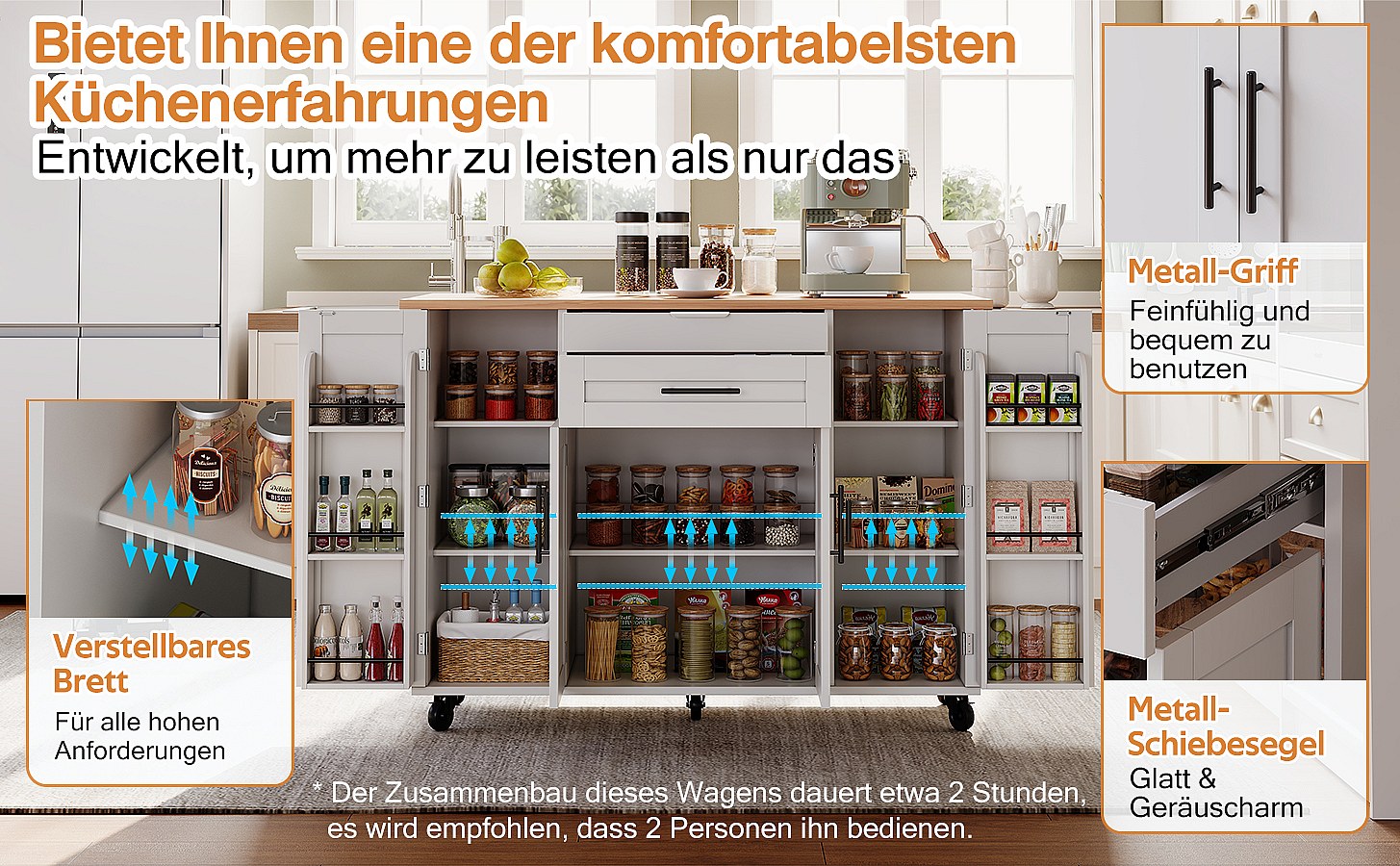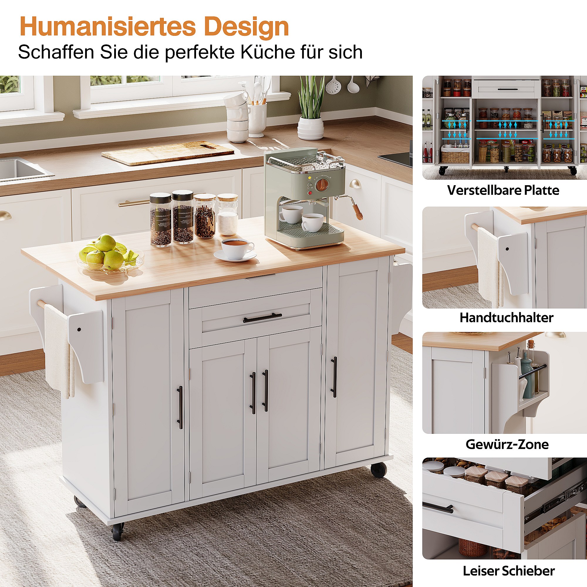 Îlot central extensible avec roulettes - 120 x 50/81.5 x 92 cm - avec 2 portes + 2 tiroirs - MDF + Métal - blanc