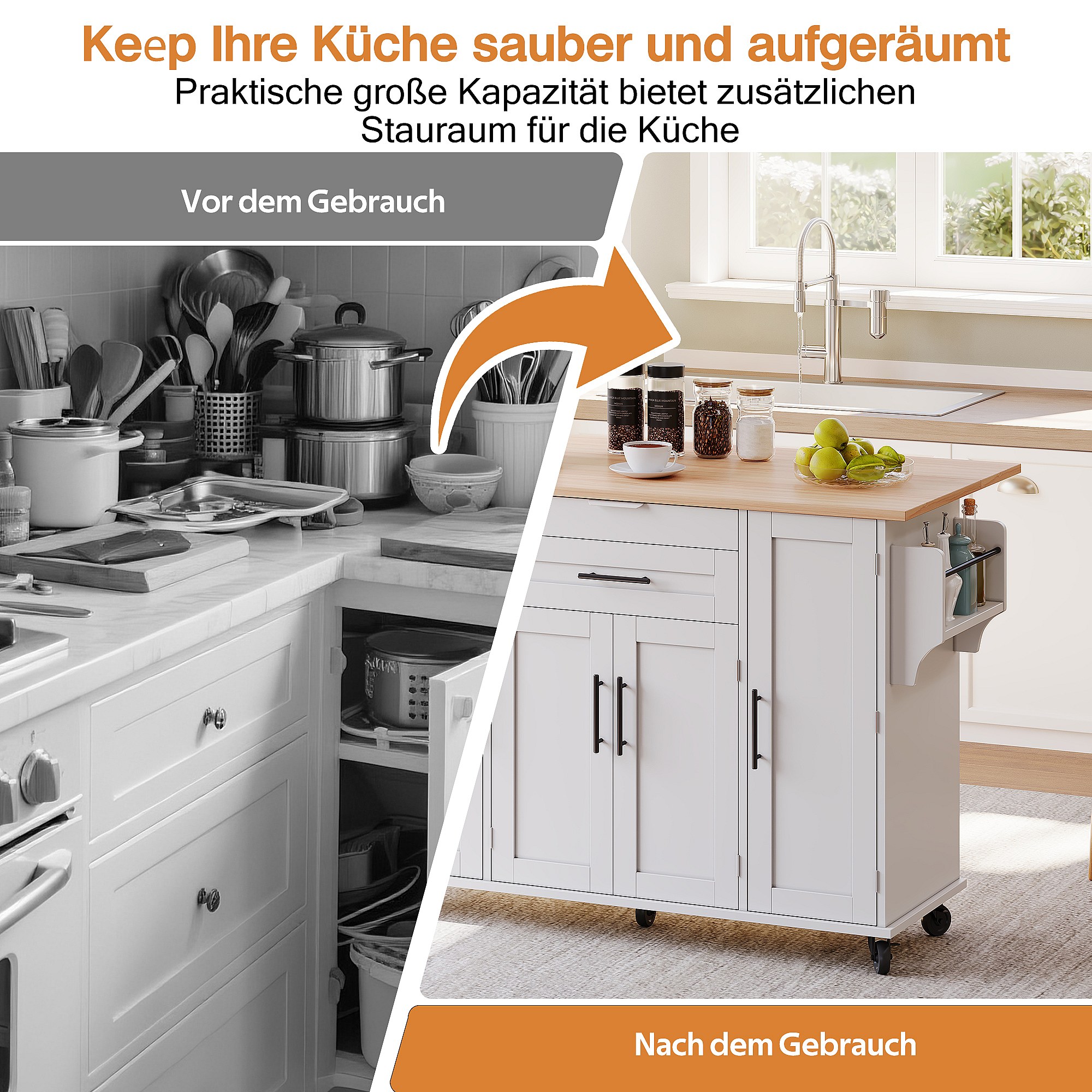 Îlot central à roulettes avec plan de travail rabattable + 4 portes + 3 tiroirs - 140 x 43(70) x 90.5 cm - blanc