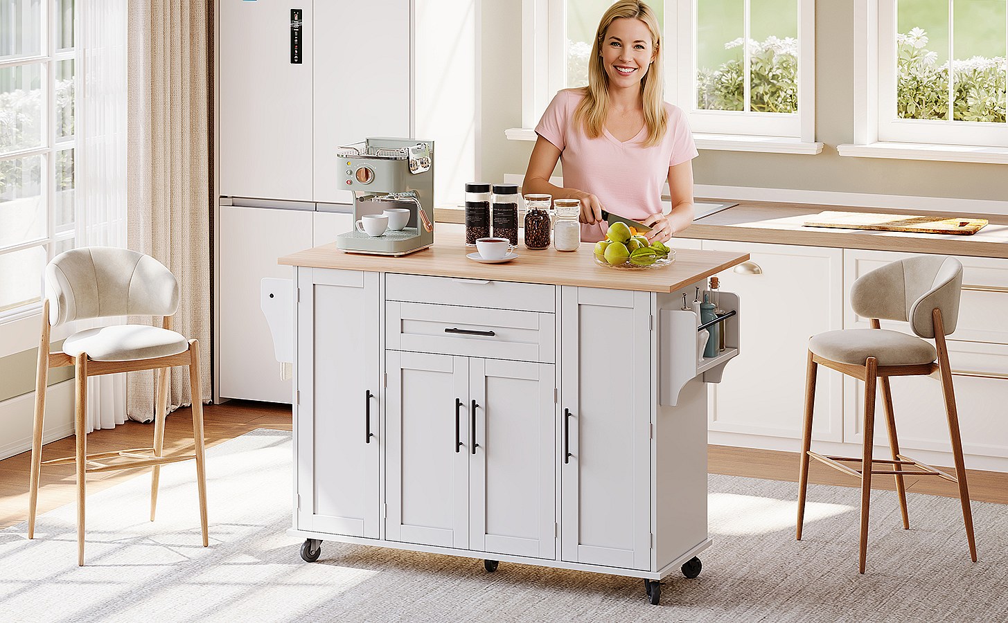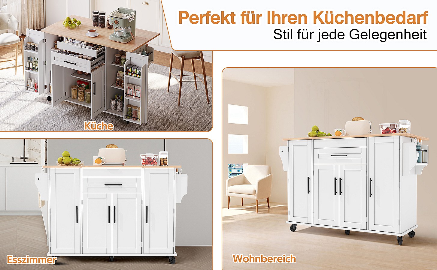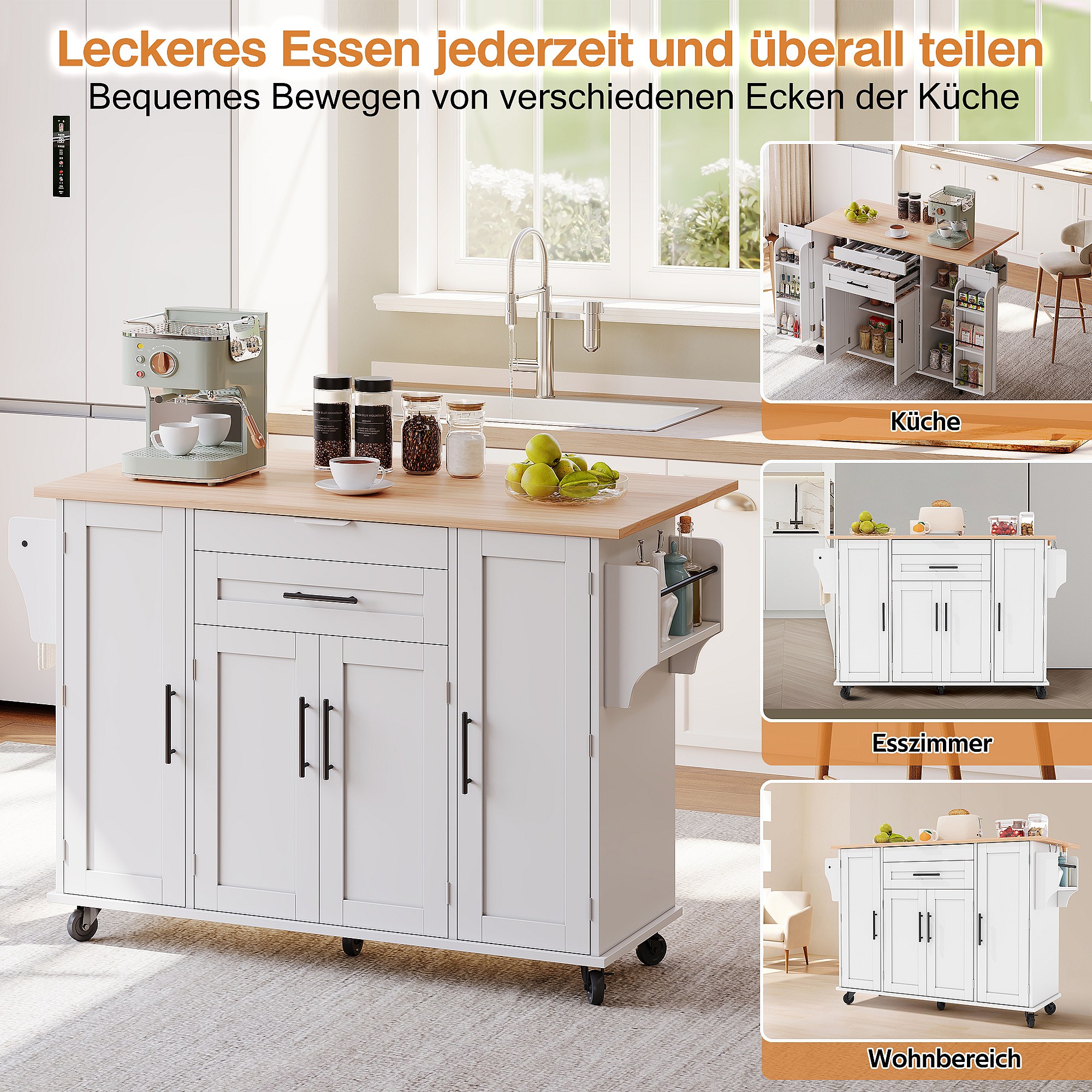 Îlot de cuisine - 146.85 x 45/70 x 93 cm - desserte extensible à roulettes + 2 portes + 3 tirois - MDF + Métal - blanc